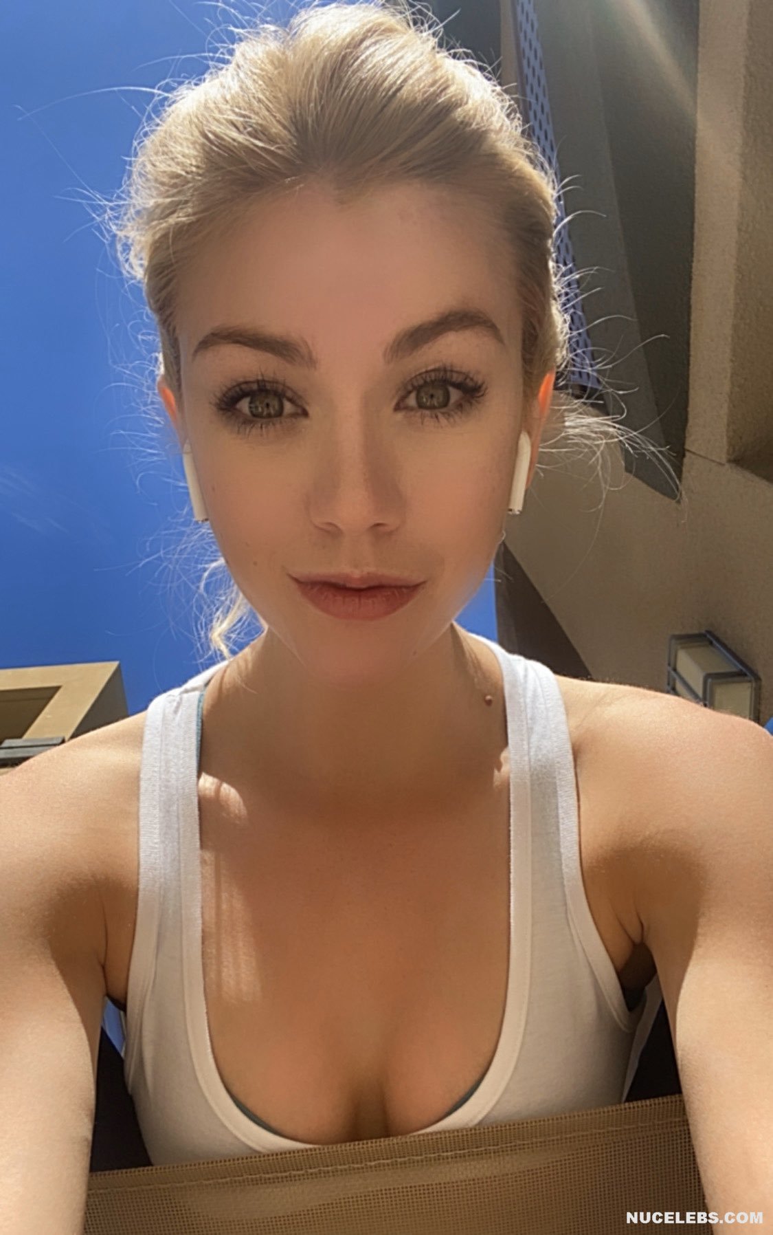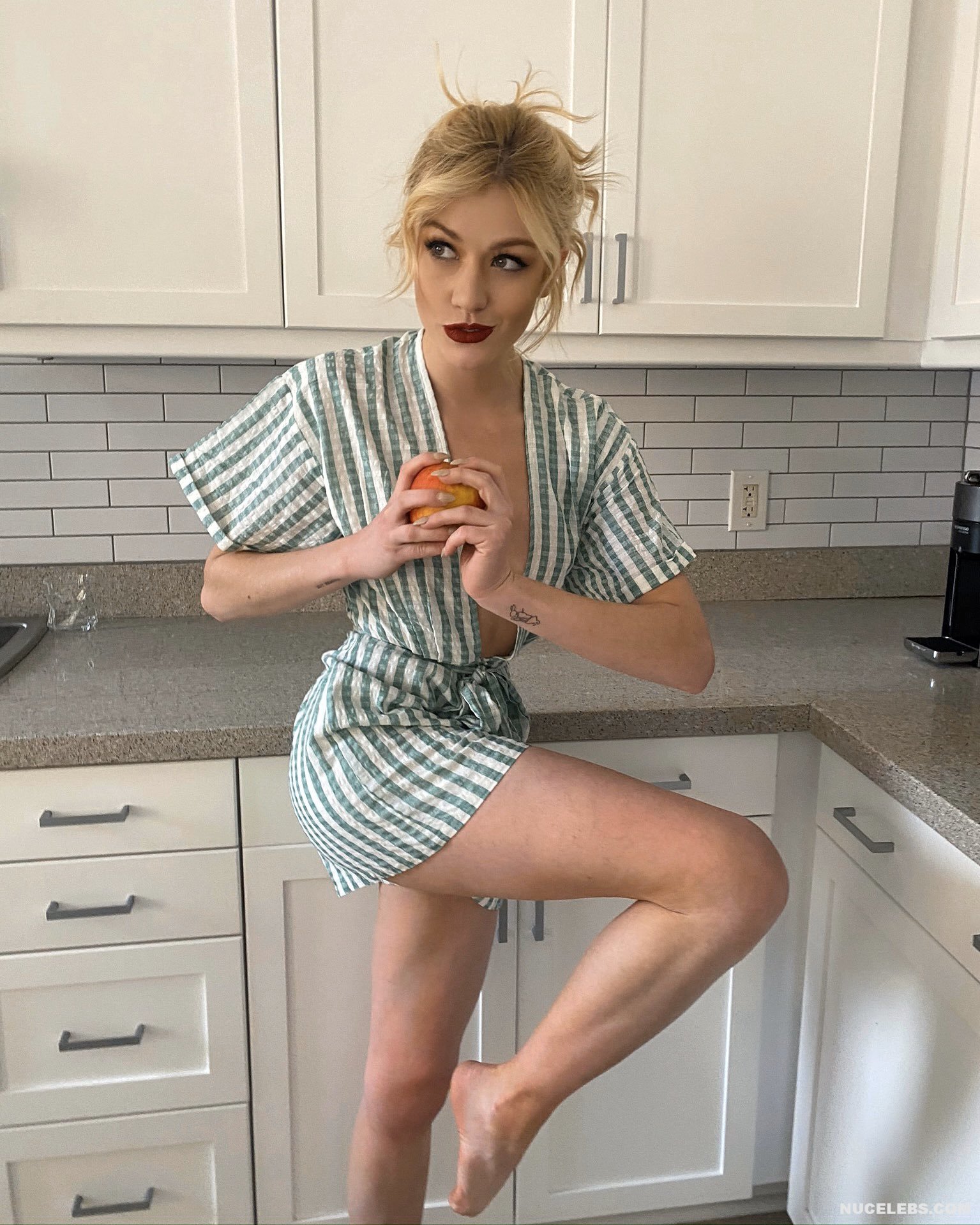 American actress Katherine McNamara knows how to impress the audience with her provocative outfits. For example, this beauty happily posed in the kitchen in a short striped robe. The top of the robe was unbuttoned and part of Katherine McNamara’s nude tits could be seen. Also, this celebrity showed off her nude boobies at one of the events. The actress wore a dark green outfit with a sheer top. At the same time, Katherine McNamara’s nude boob with a brown nipple was visible through the fabric and was almost not covered with multi-colored dots.
