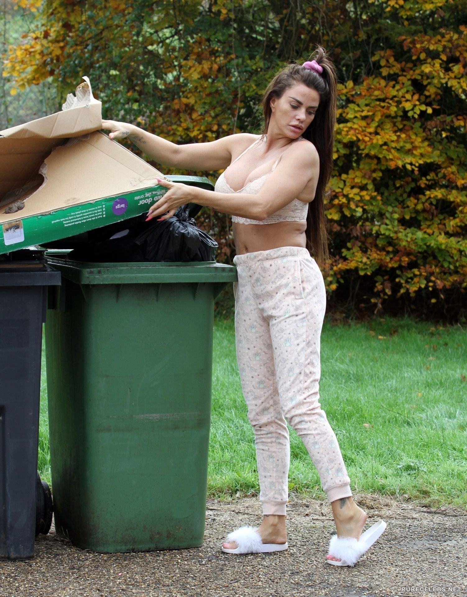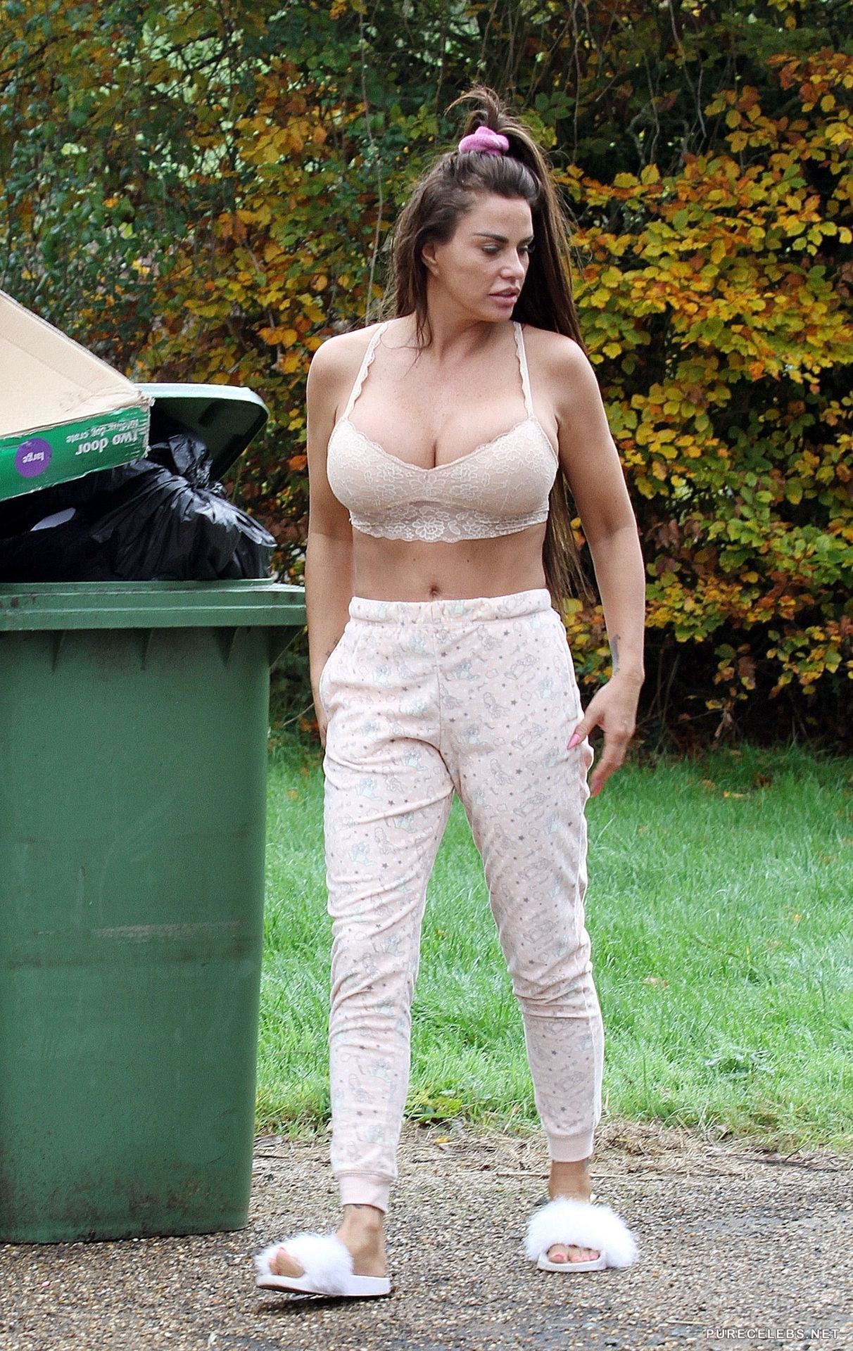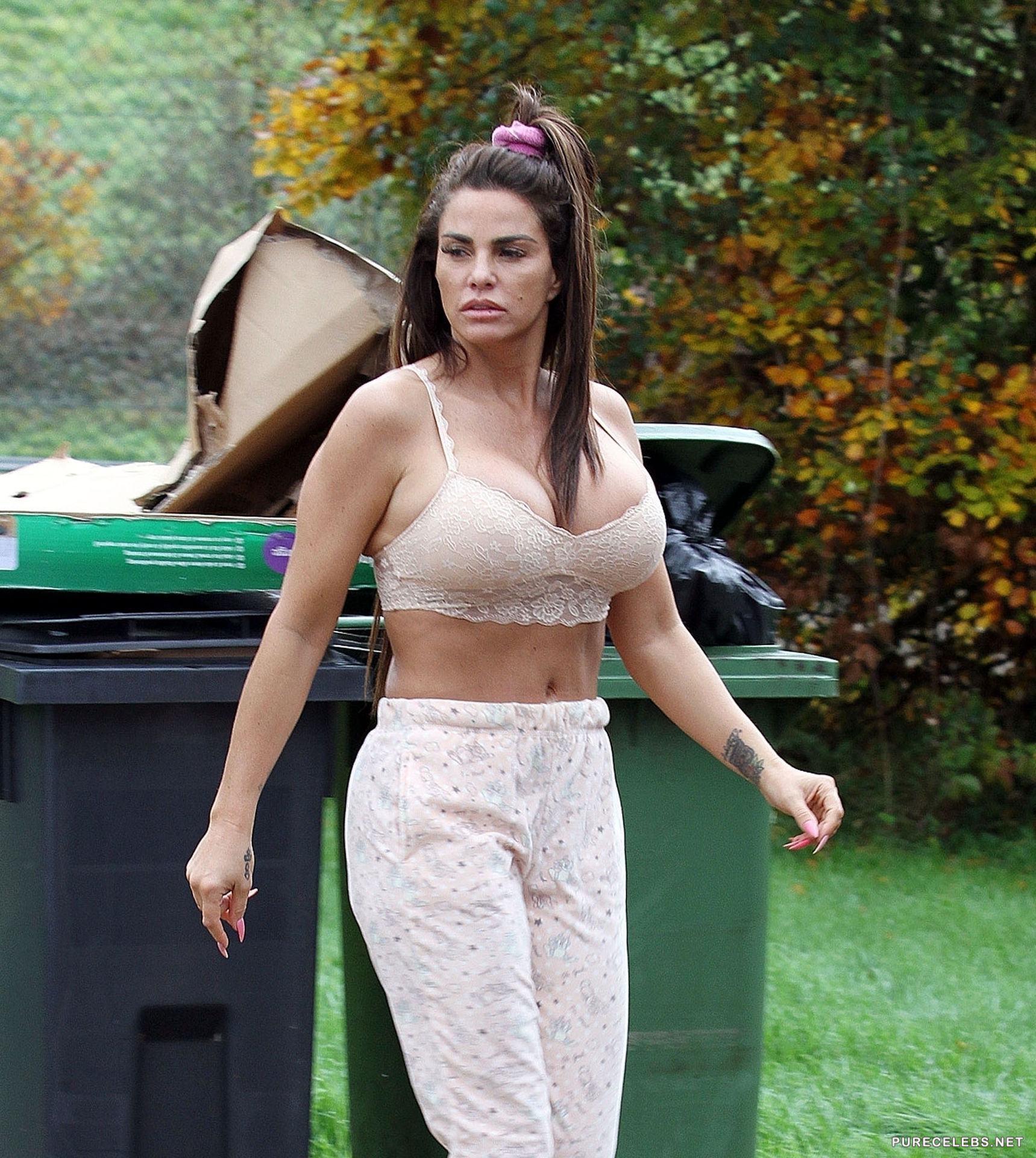 Well known English TV personality, model and businesswoman, Katie Price was spotted and quickly photographed by fast paparazzi, while she was taking the trash out, wearing only pajamas and a bra. Well, its is good to know that she is very relaxed in private life, to go out like this, with no make up on and also good that she keeps on showing those massive boobs, one way or another.