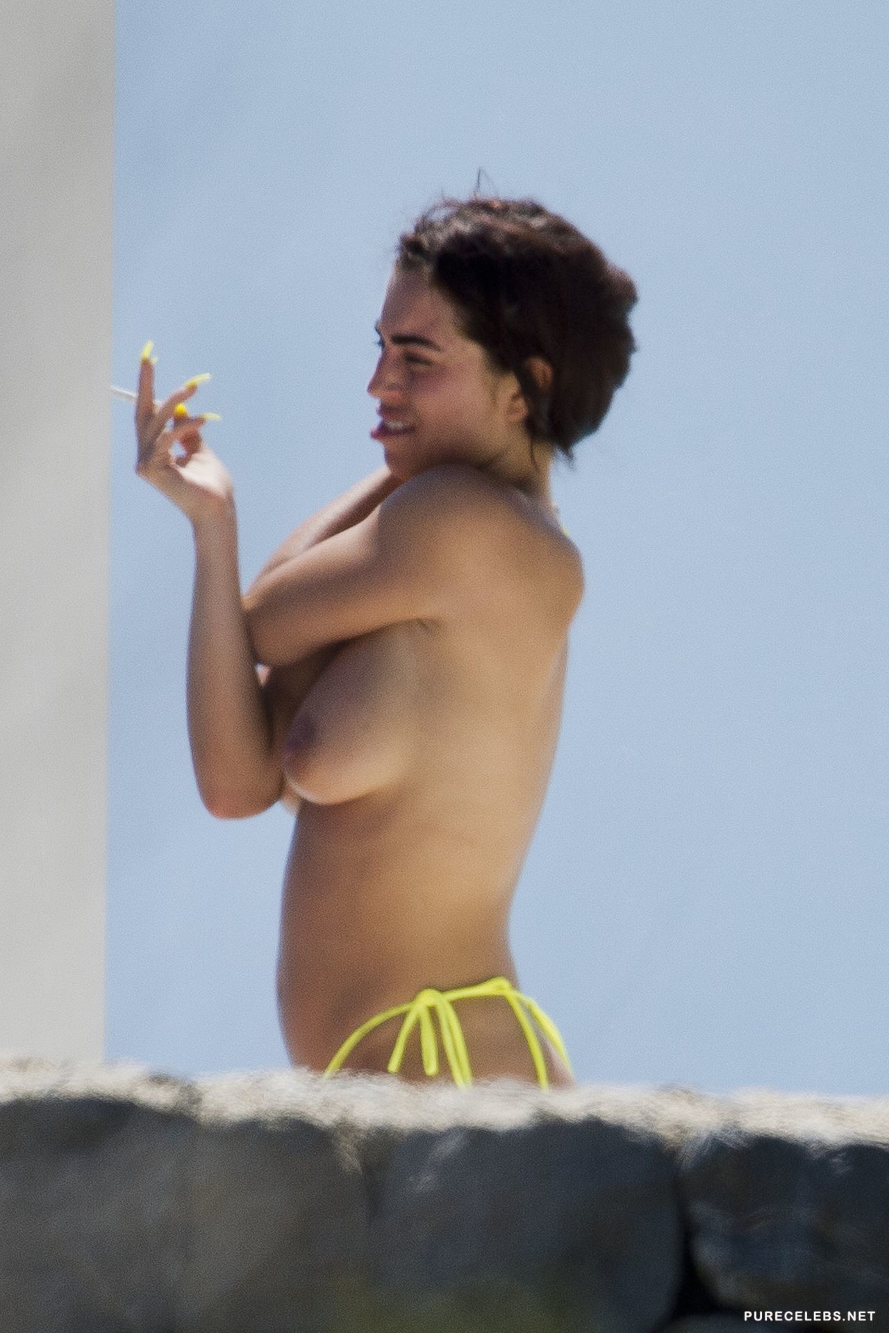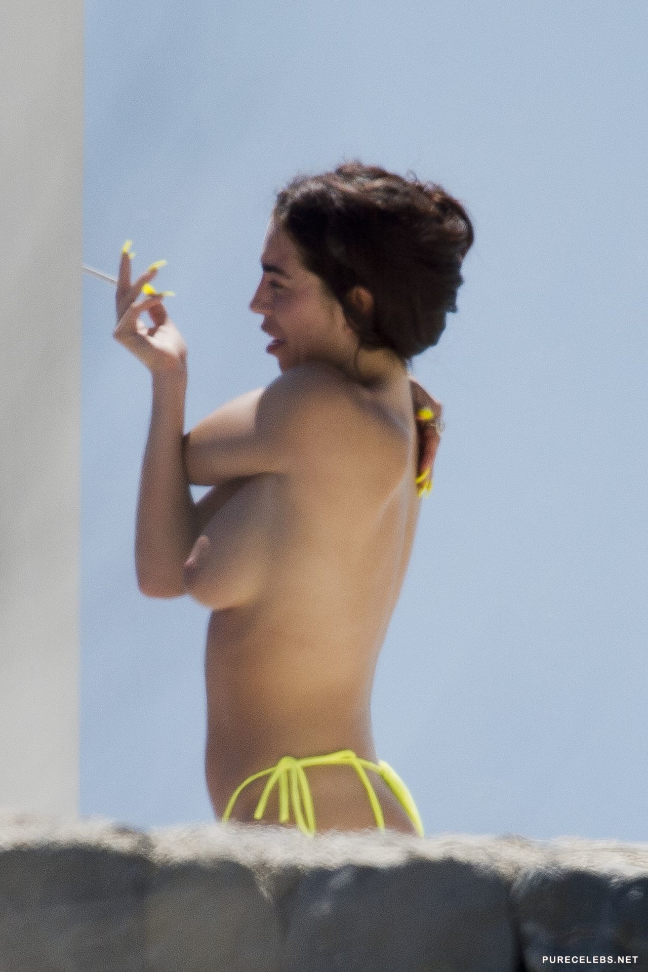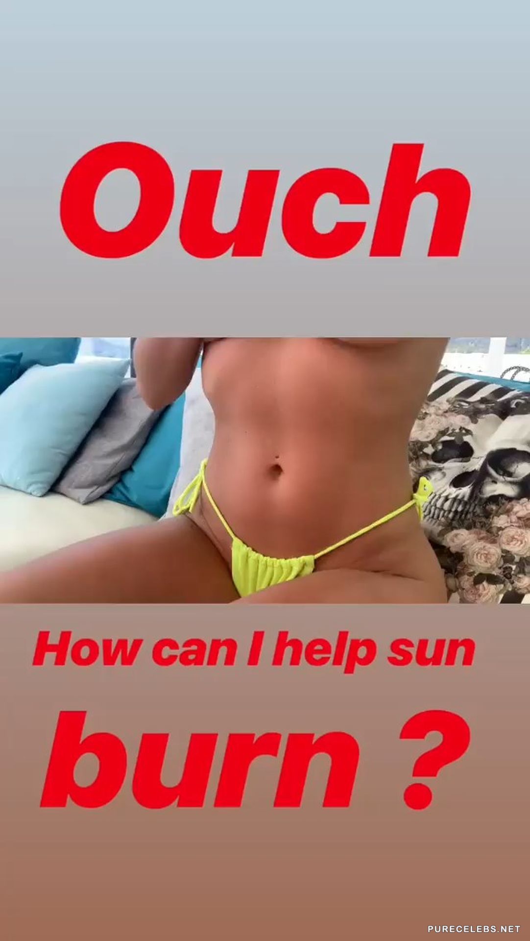 As it turned out, Love Island star Katie Salmon loves topless sunbathing. Recently, the paparazzi photographed a girl in a very frank outfit. She wore only small bright yellow bikinis and had a bright yellow manicure. We can admire her absolutely naked gorgeous breasts with hard nipples and also awesome ass in narrow thongs. This girl is very sexy and seductive and loves to flaunt it.