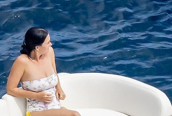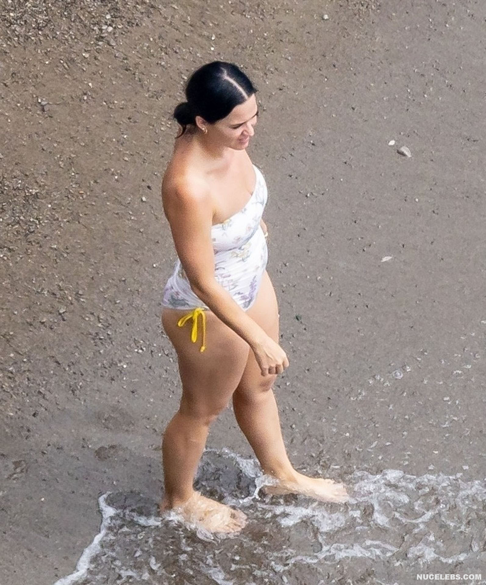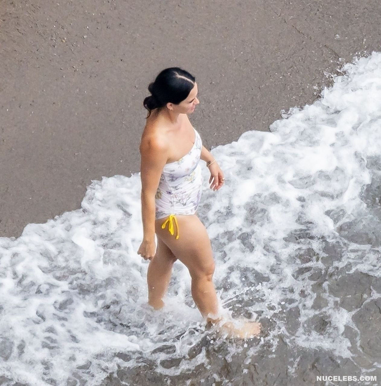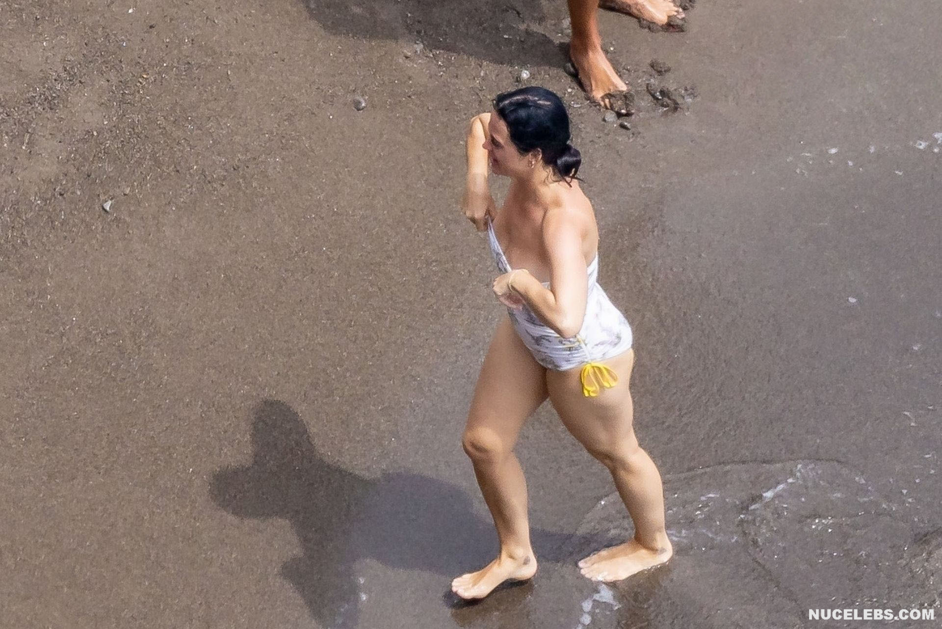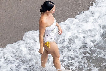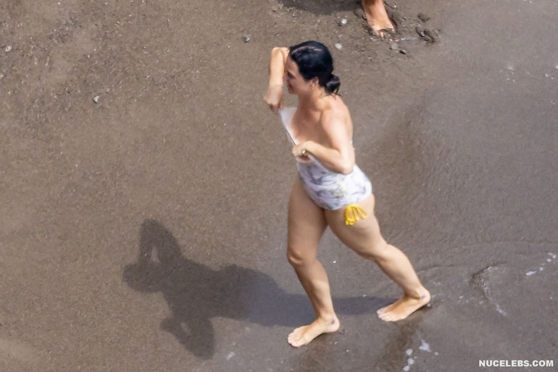 While Katy Perry was enjoying a beach holiday with her husband, the paparazzi followed her everywhere with a camera. And it is worth noting that they took some spicy pics of this celebrity. This time around, Katy Perry wore a white print bodycon swimsuit that accentuated her stunning cameltoe. By the way, her bathing suit almost slipped off her breasts several times. So the opportunity to see the bare boobs of this singer was so close!
