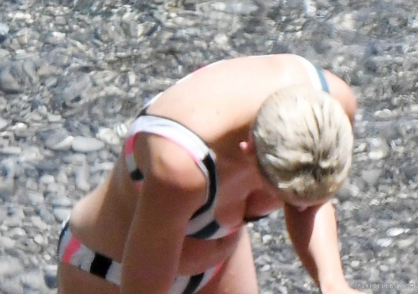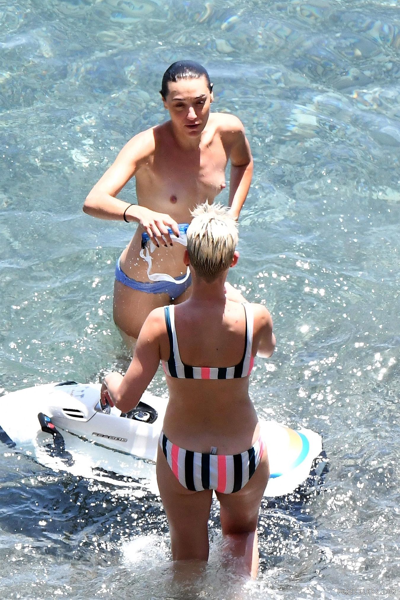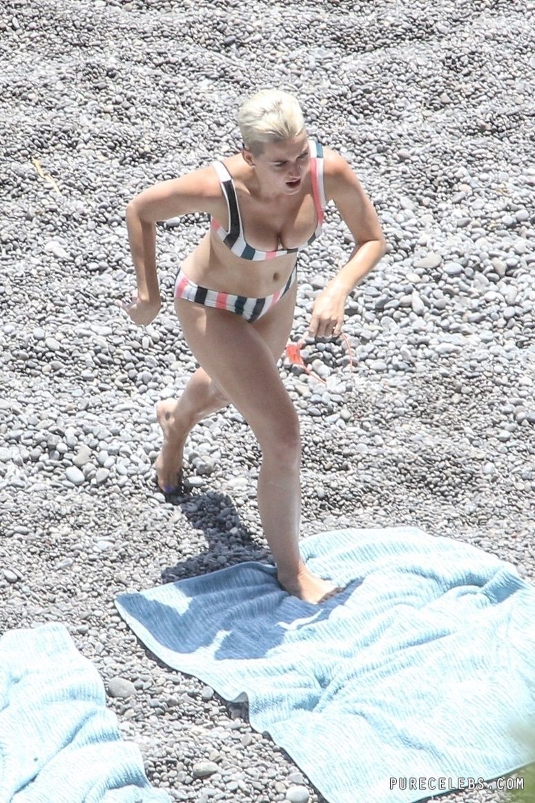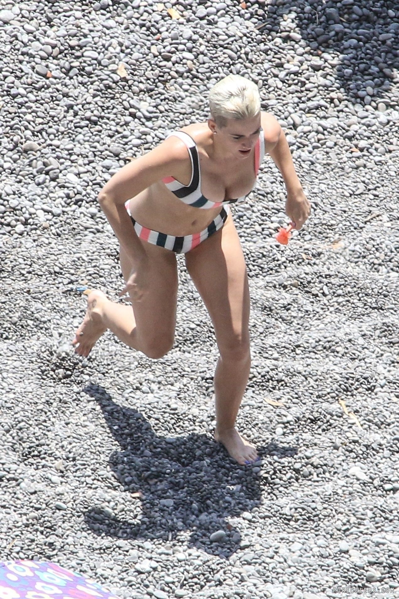 Paparazzi managed to make the bikini photo of Katy Perry, which looked very sexy, although she was not nude. This American singer had a great time on the beach, swimming on the beach. The girl was wearing a multi-colored striped bikini, which was very suitable for her. Katy Perry’s sweet chubby butt in wet tight panties was breathtaking. And just look at her juicy boobies! It seemed Katy Perry’s nude tits were about to jump out of a tight-fitting bra.