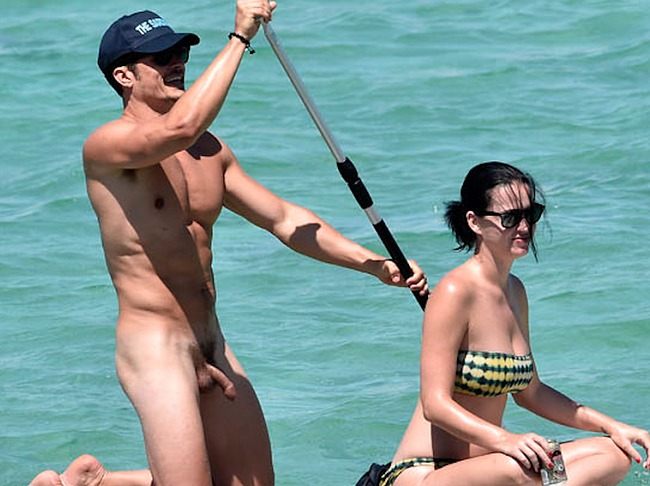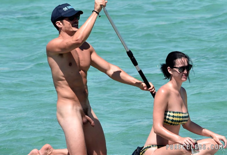 Hollywood lovebirds Katy Perry and Orlando Bloom were on vacation, and forgetting they were celebs when these paparazzi photos were taken. In these exclusive pictures you can see them paddling on a surf board with Orlando butt naked, and Katty in a tiny yellow bikini. But that’s not all. Orlando gave the paparazzi a few more shots of his half hard cock while nude. Oops!