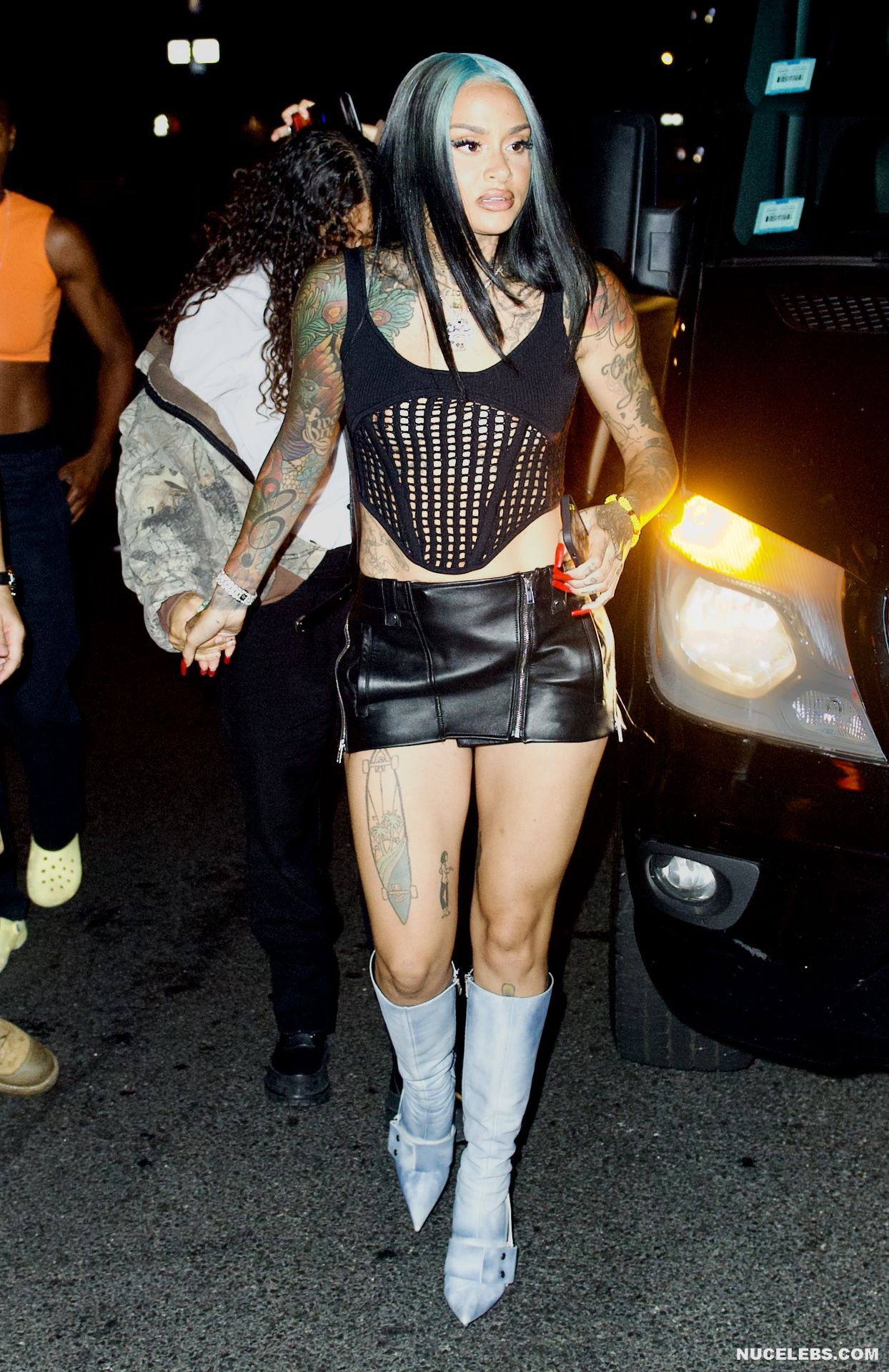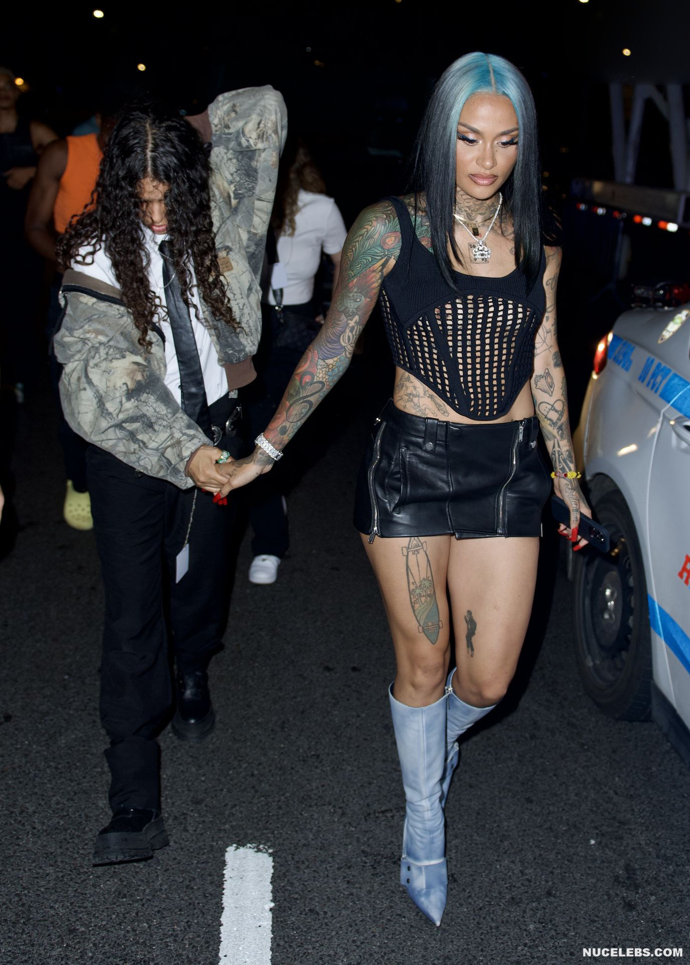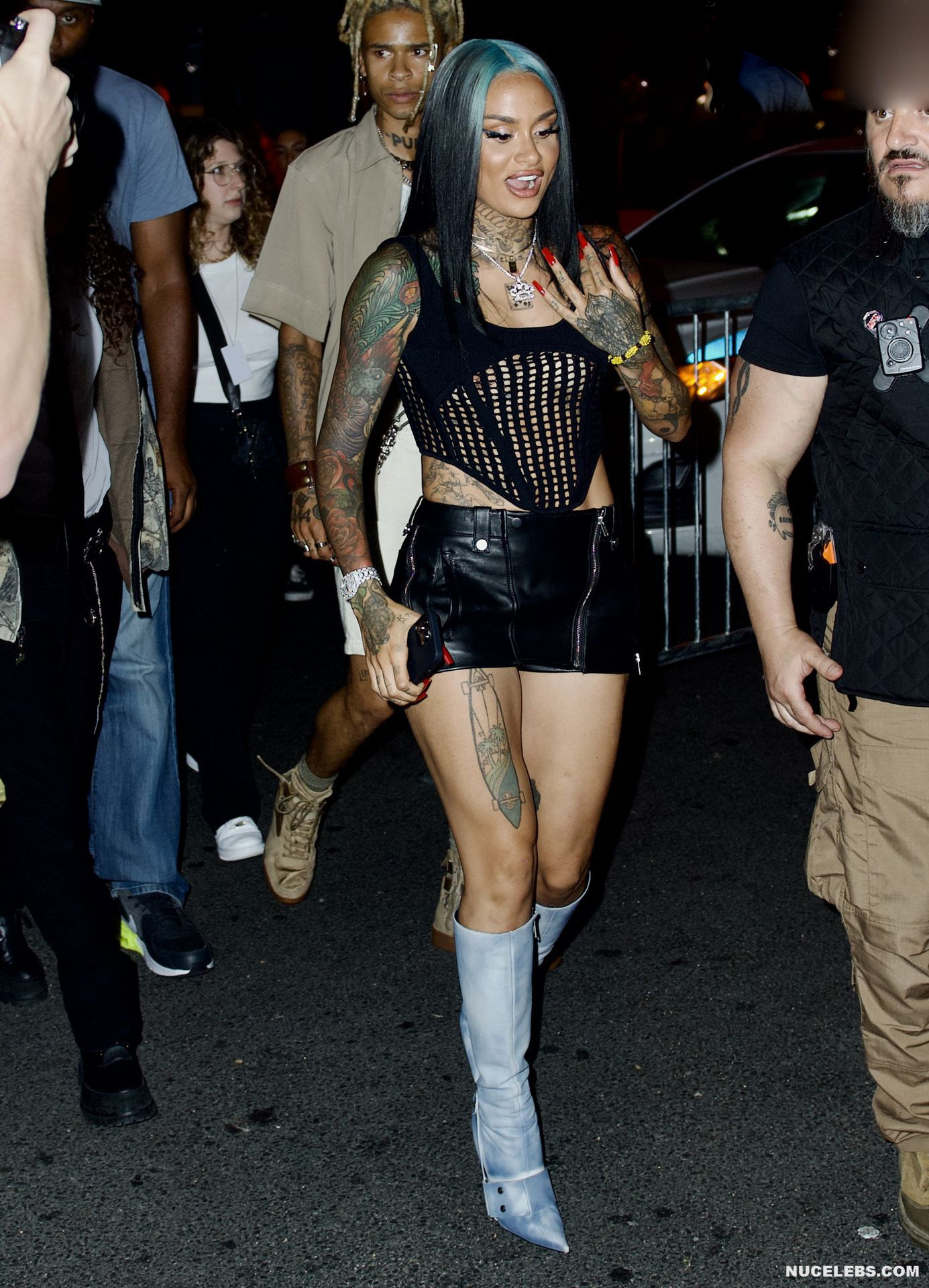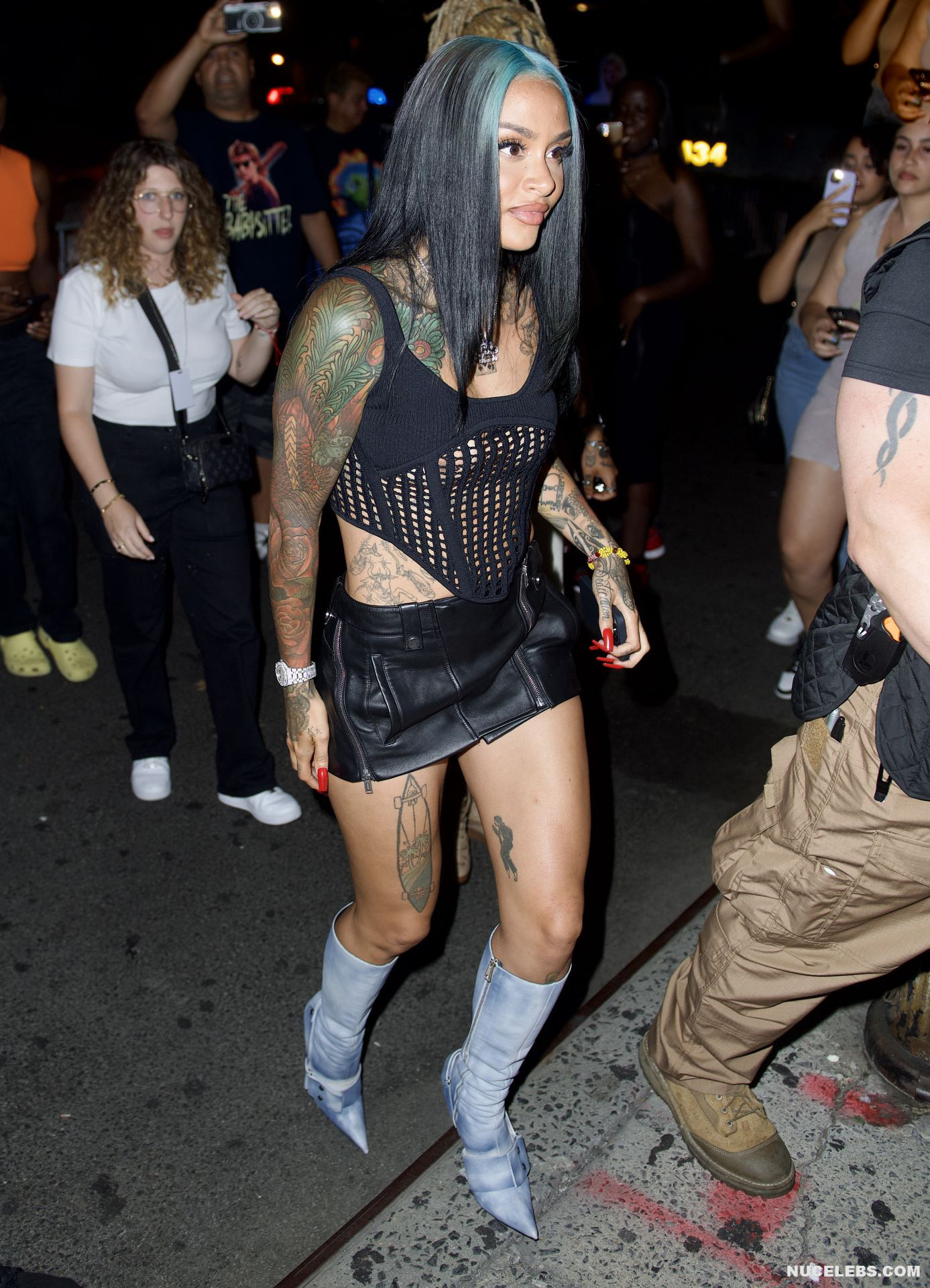 Kehlani was seen at one of the parties in a very provocative outfit. This American singer was dressed in a leather miniskirt, a black top and pointy gray boots. At the same time, Kehlani’s nude boobs with brown nipples showed seductively through the bottom of her mesh top. I wonder if Kehlani accidentally showed her nude tits or was it planned on purpose?