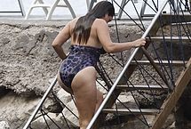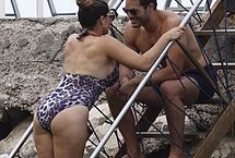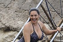 Who knows and who cares what Kelly Brook is a celebrity for because this babe has a set of big tits that are absolutely delicious. In this paparazzi gallery, you can see Kelly in her one piece bikini looking wet and stunning, coming up some stairs on a rocky beach for a kiss, and showing off not just her round ass, but also her large boobs.