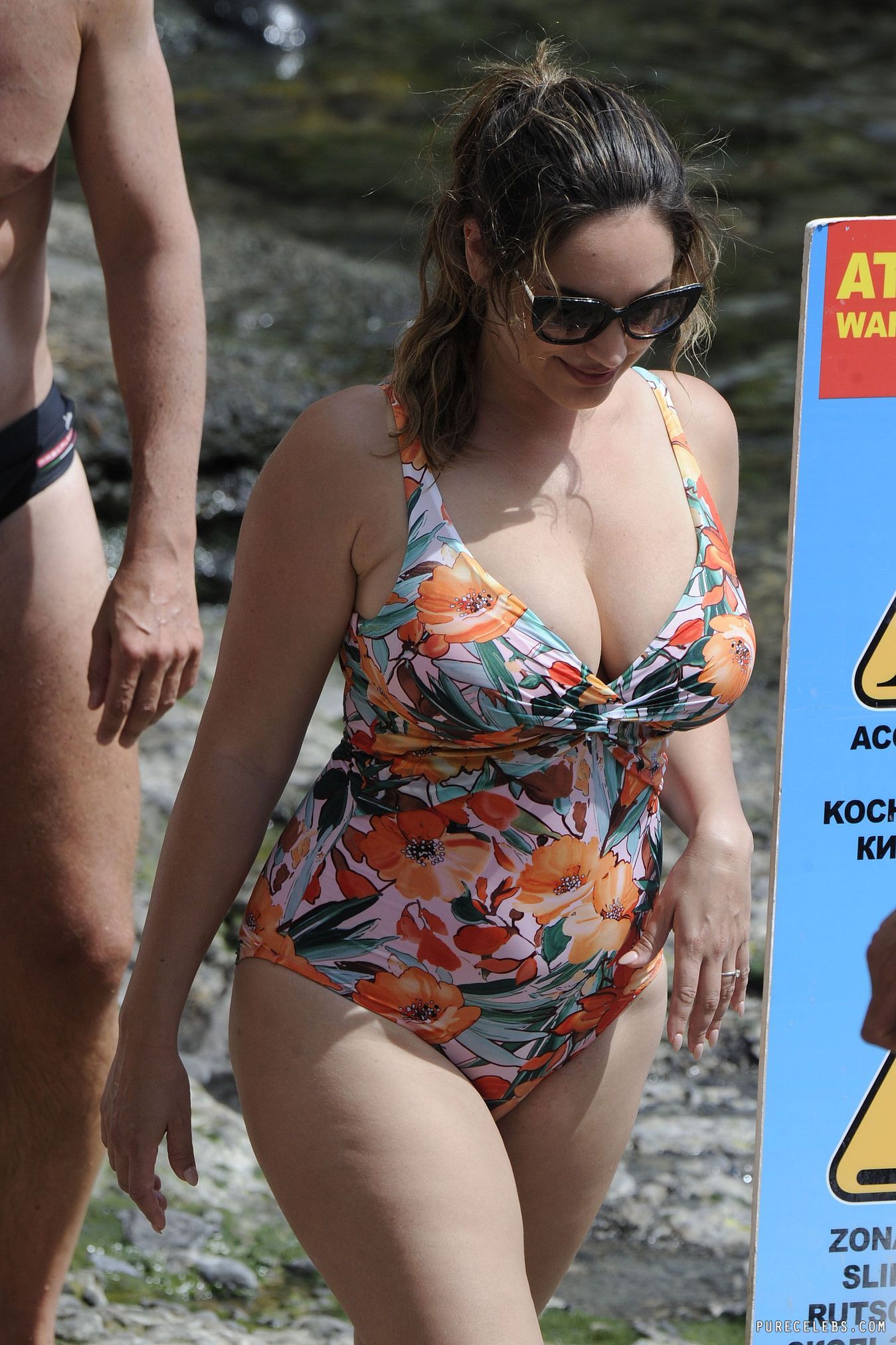 Hot actress Kelly Brook is no stranger to paparazzi following her around, so she ignores them while they make hot photos likes these. In this vacation gallery, Kelly is wearing a one piece swimming suit, and we get a view of her silky legs, as well as her hot big tits. Rarely does a celebrity with such modest swim suits make such hot photos.