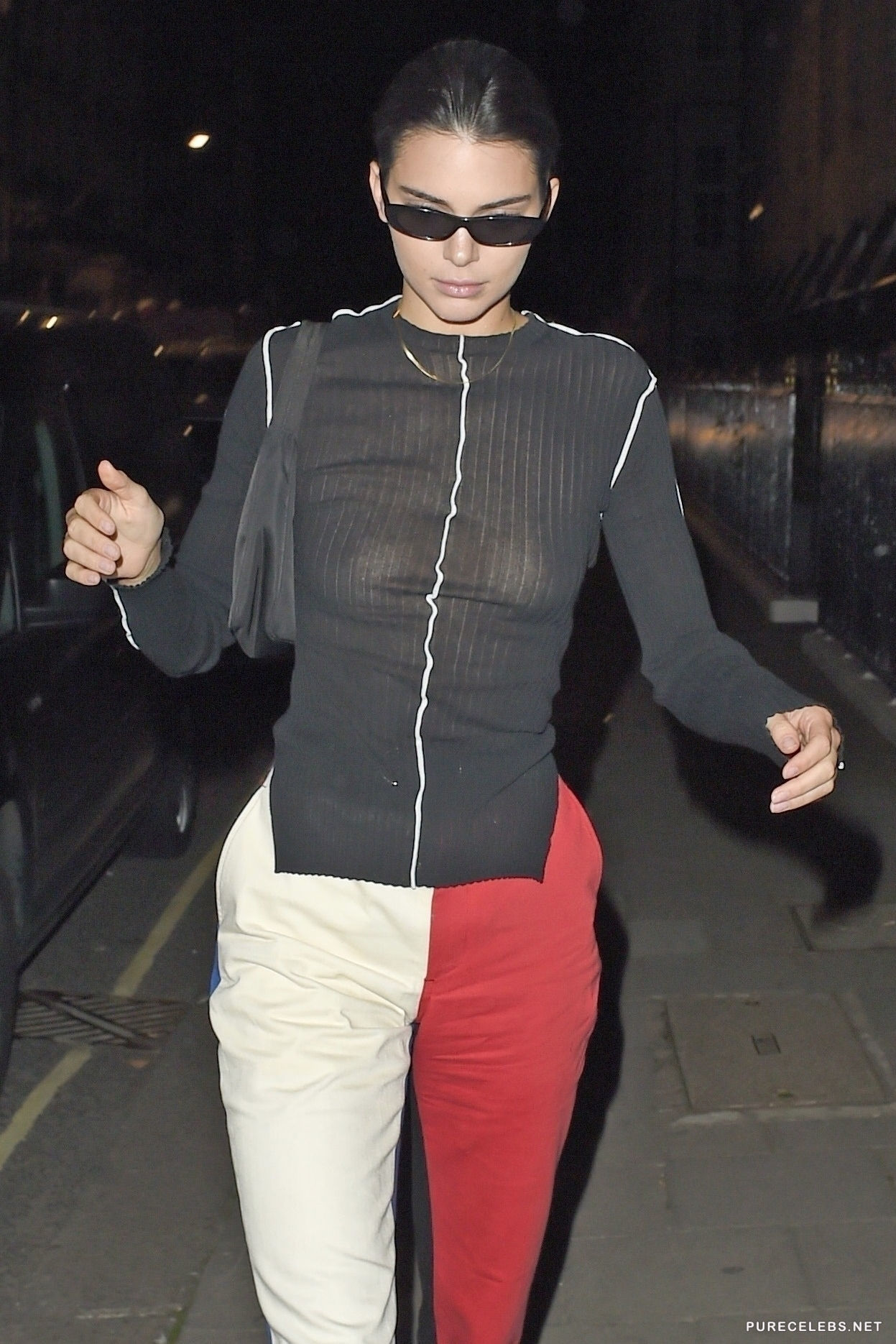 Maybe she thought that wearing sunglasses in the middle of the night might make her invisible to paparazzi, although logic says that it makes everyone more visible, exactly because it is a bit awkward. Kendall Jenner went out wearing a tight, black, see through blouse displaying her titties nicely and paparazzi have managed to snap a few decent close- ups of her chest, to make sure they have us covered.