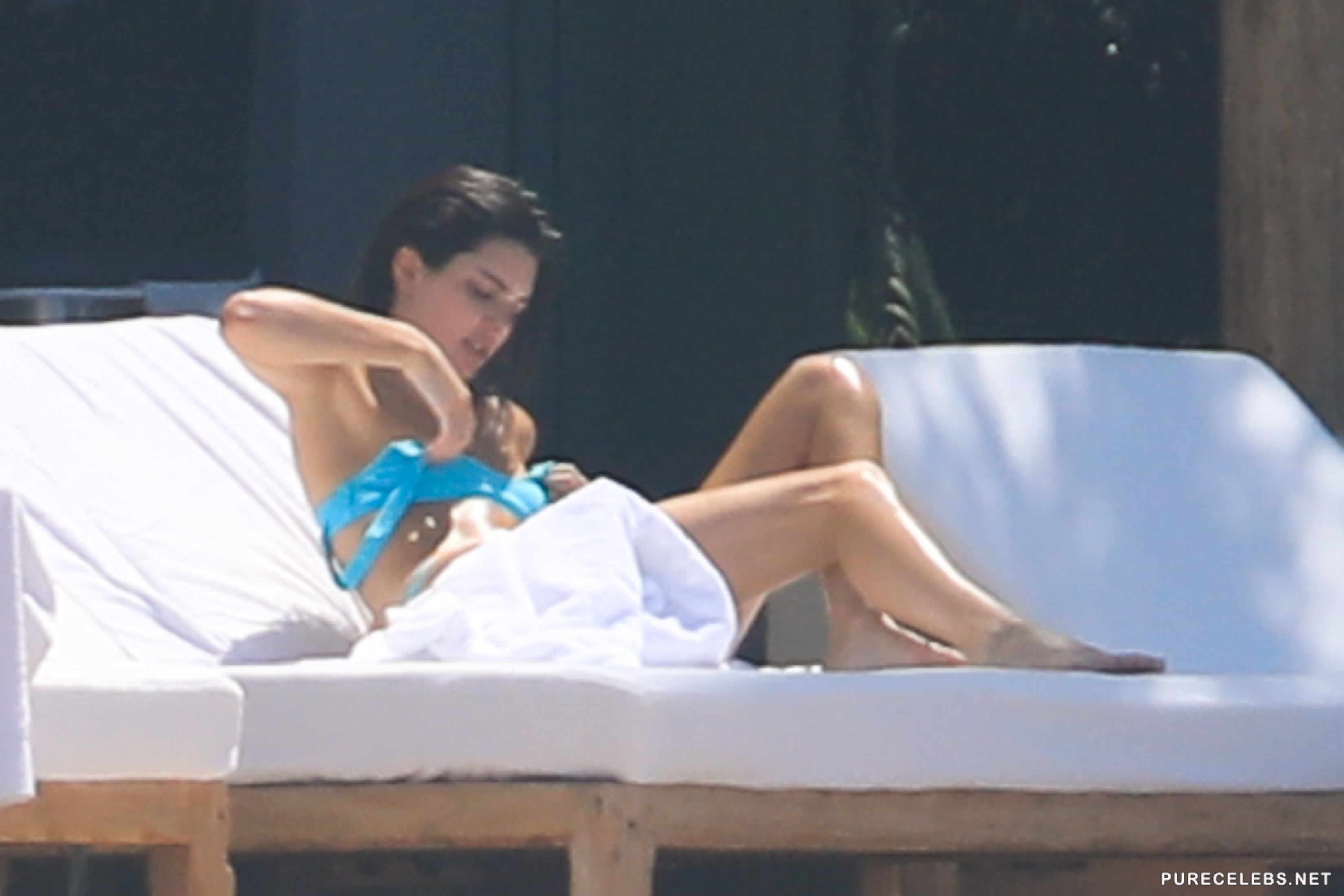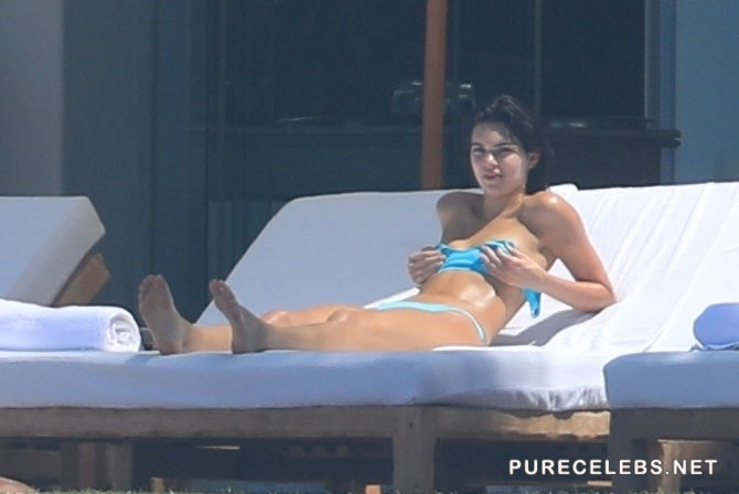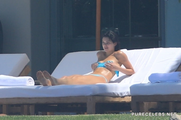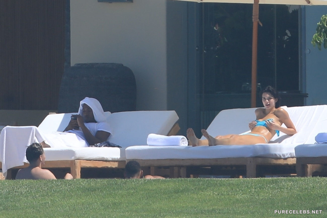 Either Kendal Jenner was shy on that day, or she was told off by hotel staff, but although she decided to put on the tiniest bikini she had, for the sunbathing time, she did not take off the top, but the straps had to be removed. What is this, Kendall? Aren’t you the queen of scandals and the one who is not shy to show tits? Why aren’t you topless?