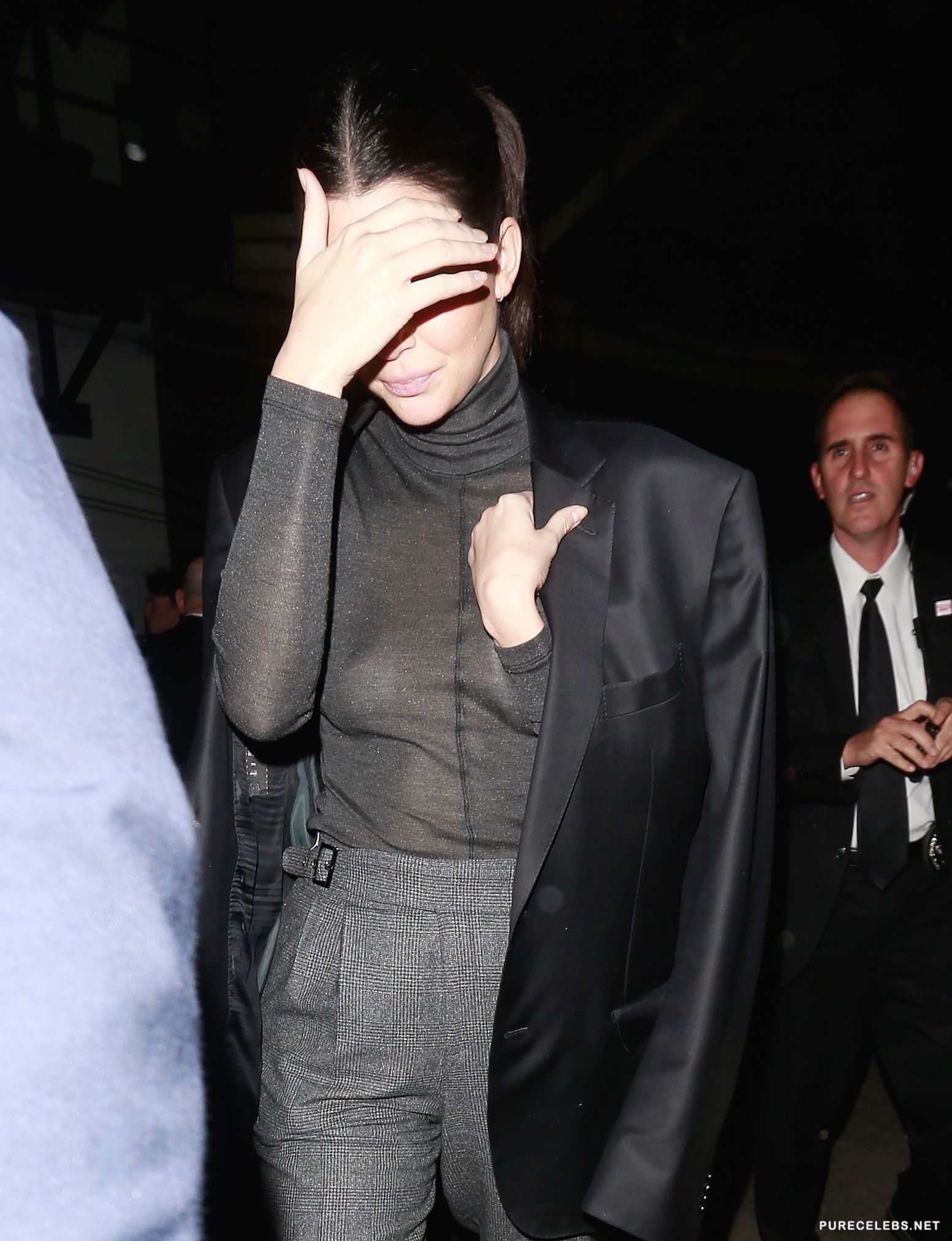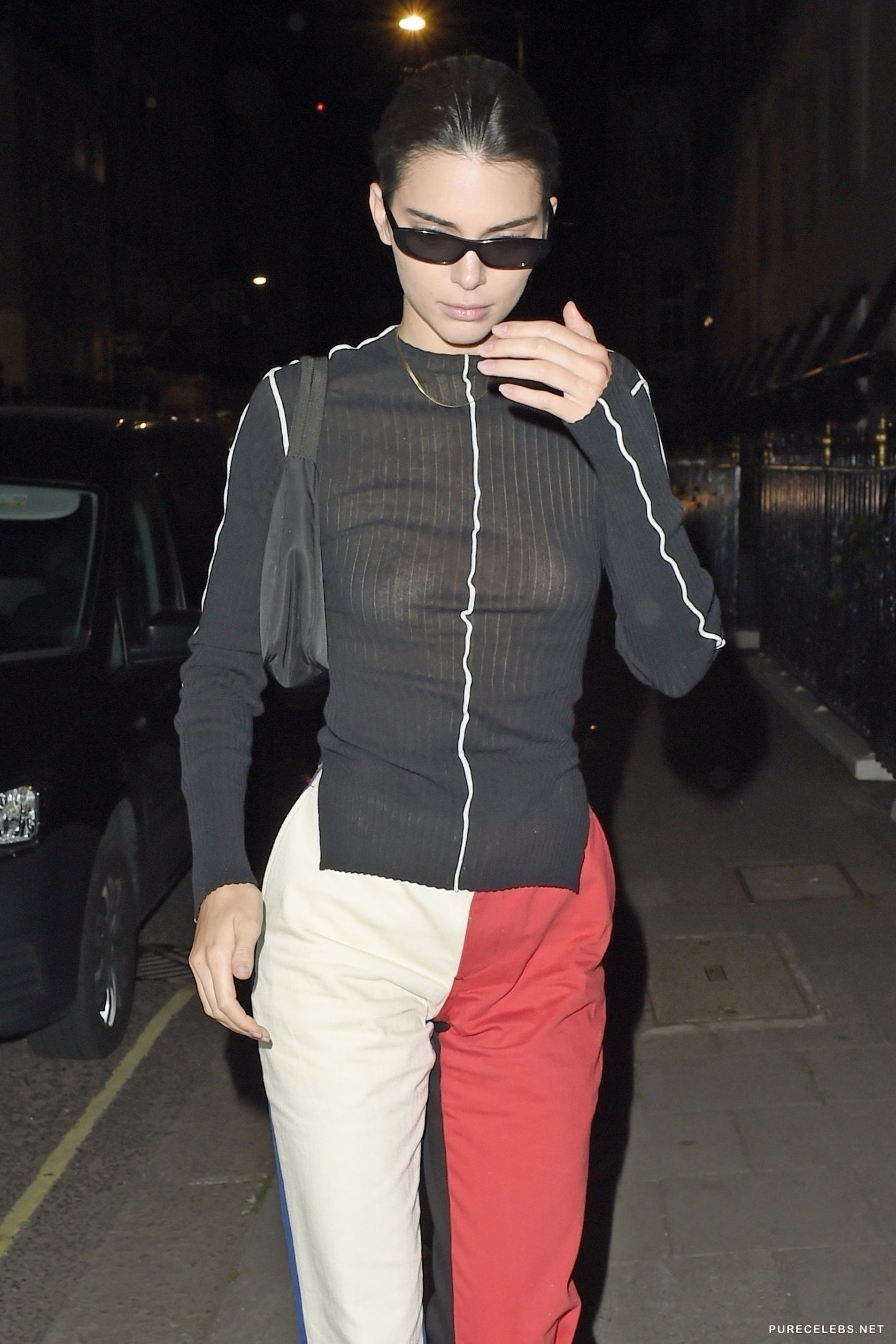 Maybe she thought that wearing sunglasses in the middle of the night might make her invisible to paparazzi, although logic says that it makes everyone more visible, exactly because it is a bit awkward. Kendall Jenner went out wearing a tight, black, see through blouse displaying her titties nicely and paparazzi have managed to snap a few decent close- ups of her chest, to make sure they have us covered.