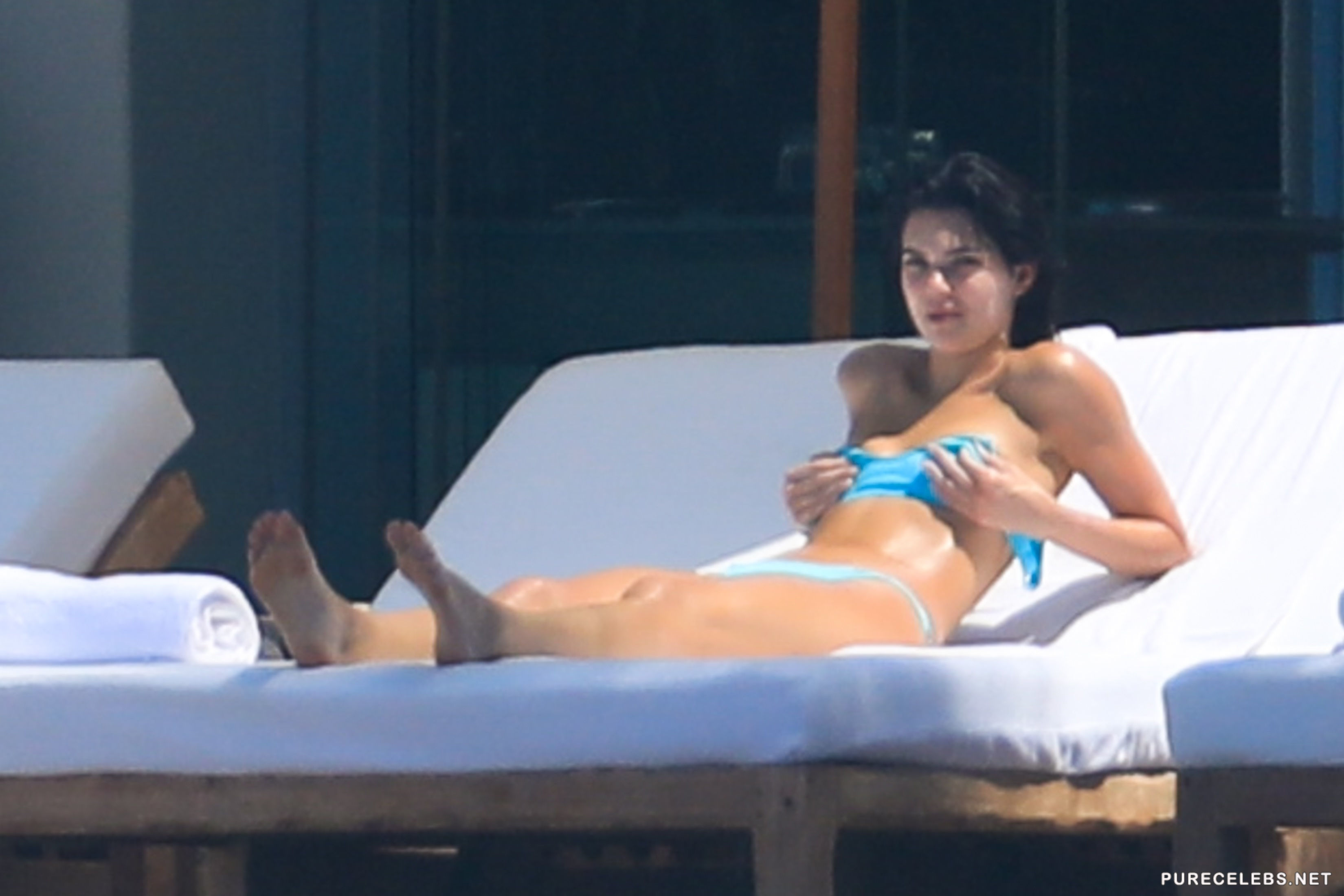 Either Kendal Jenner was shy on that day, or she was told off by hotel staff, but although she decided to put on the tiniest bikini she had, for the sunbathing time, she did not take off the top, but the straps had to be removed. What is this, Kendall? Aren’t you the queen of scandals and the one who is not shy to show tits? Why aren’t you topless?