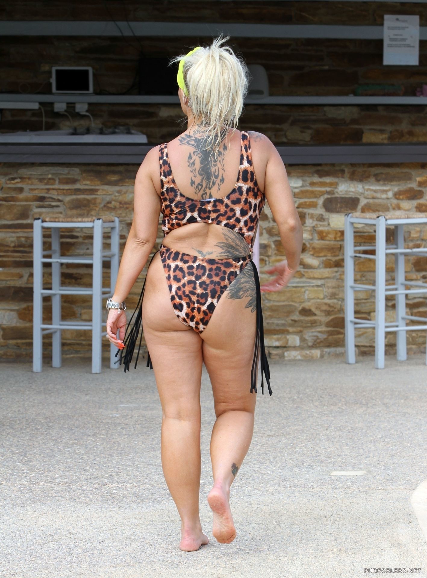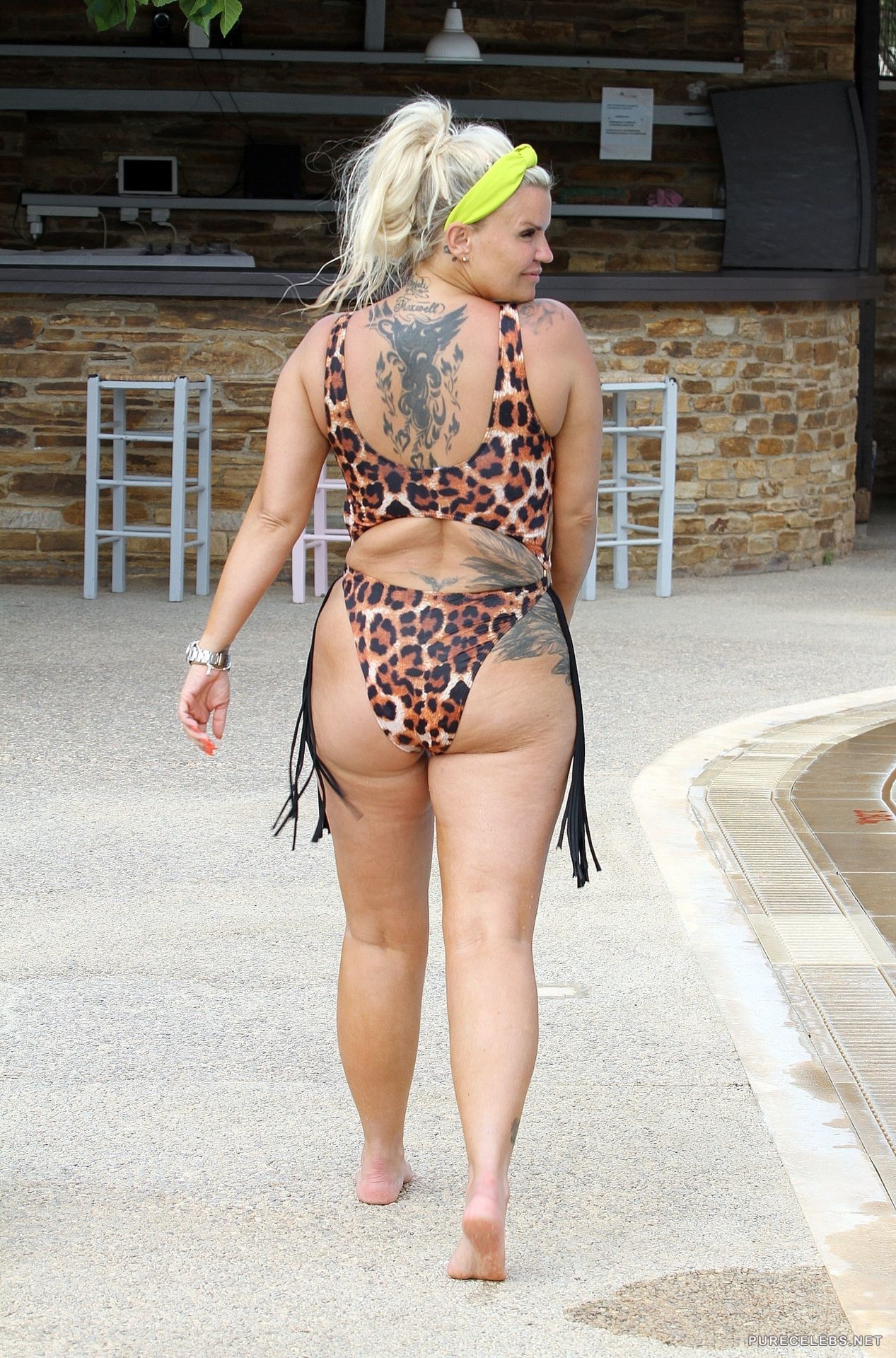 English singer Kerry Katona seemed to have a great time, relaxing by the pool where the paparazzi caught her. The celebrity wore a leopard bikini that perfectly reflected her character. The boobies of a star seemed huge in a tight bra, and her gorgeous peachy posterior looked incredibly seductive. This hot blonde was exactly the center of attention of everyone around her!