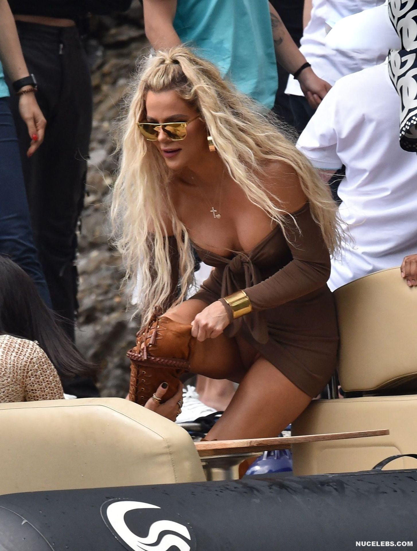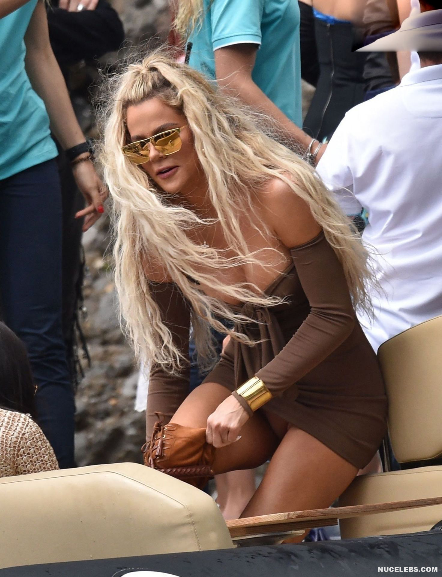 Khloe Kardashian is not shy about posing almost nude in front of the mirror. So, you can see her stunning topless selfies in front of the mirror. Khloe Kardashian, dressed in miniature beige panties, covered her nude juicy tits with her hand and was photographed from different angles. Also, this adorable blonde sparked the imagination of fans by appearing in a petite brown dress. When Khloe Kardashian raised her leg a little, her panties immediately peeked out of her short dress.