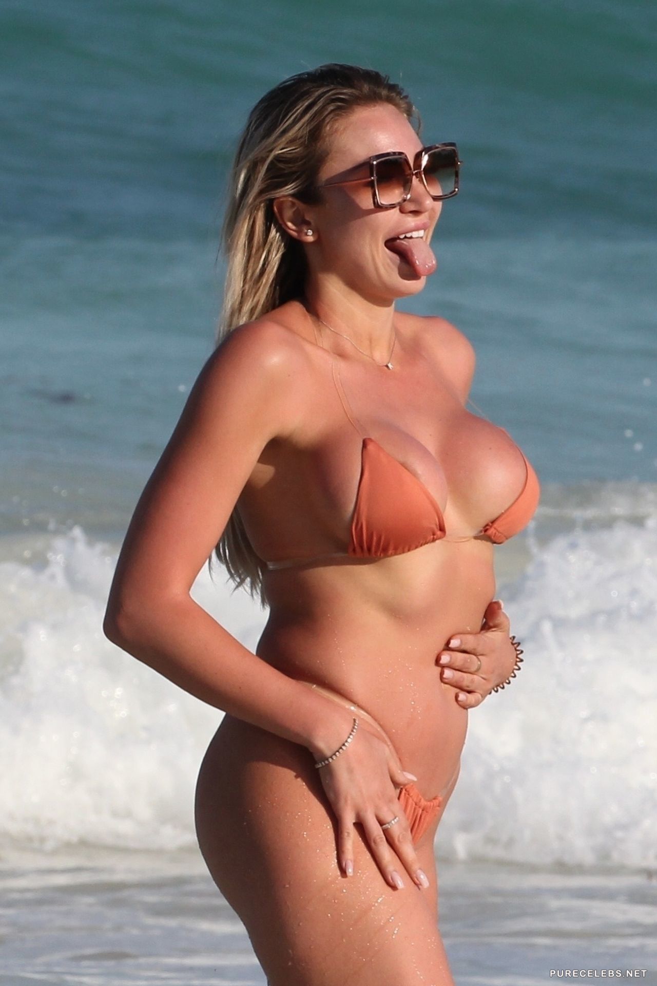 Model Khloe Terae showed off her peachy posterior as she slips into orange bikini during resting on the sea beach. The celebrity looked stunning as she flaunted her curves and gorgeous buttocks in the skimpy two-pieces bikini. Her juicy melons were so huge that it seemed to be about to jump out of her little bra. And at some point it happened and we can admire her naked tit with hard nipple.