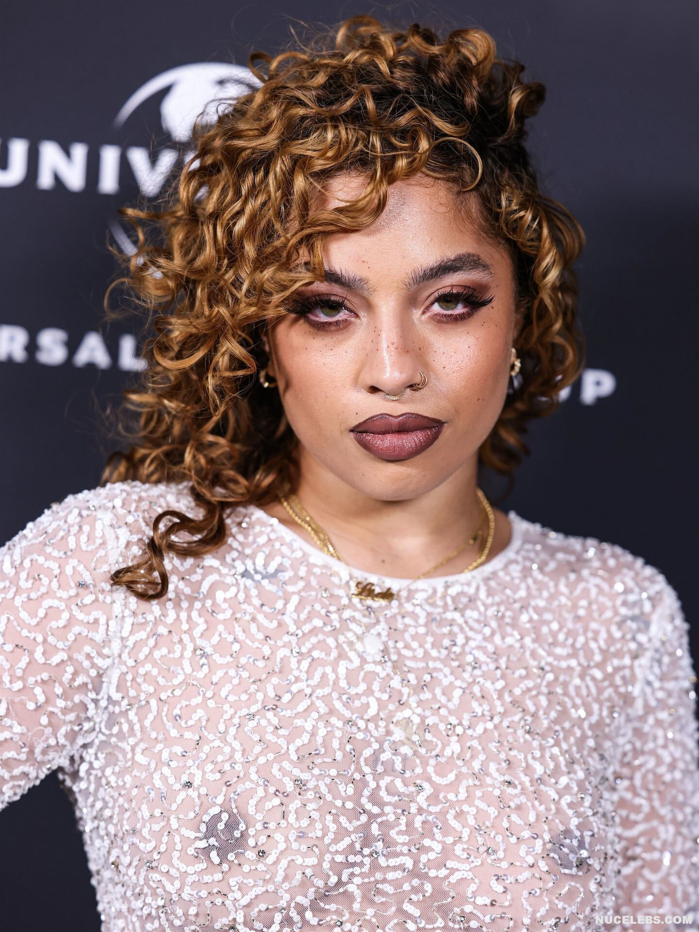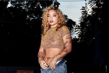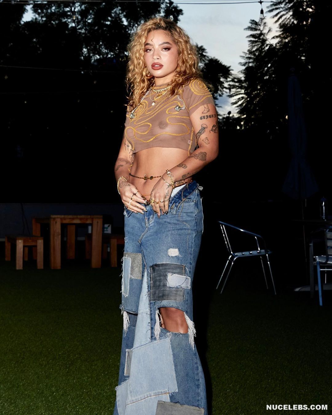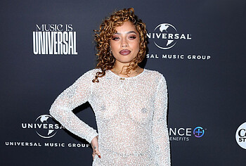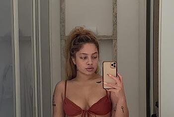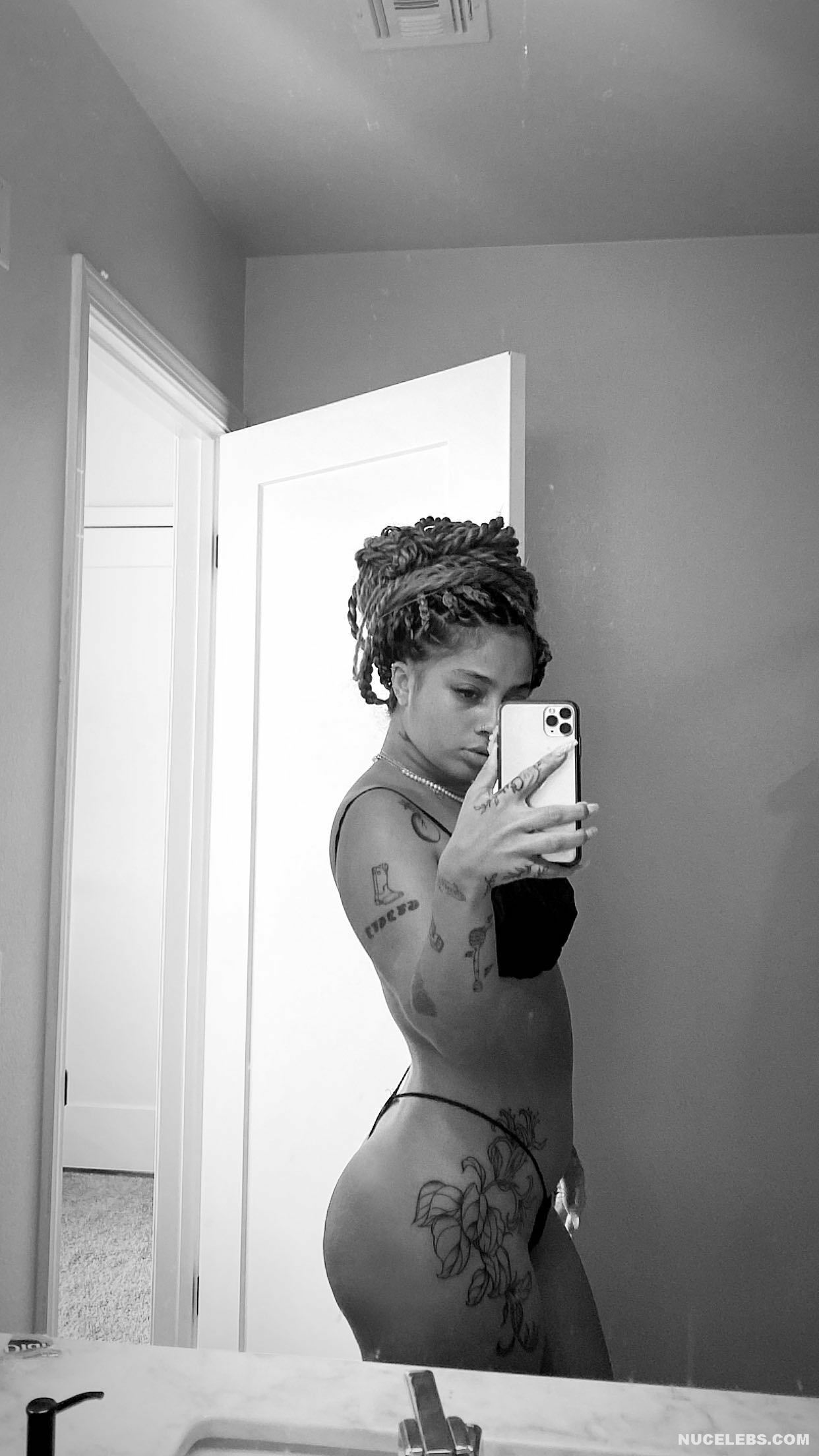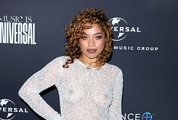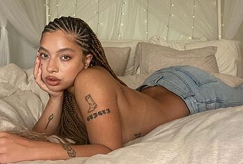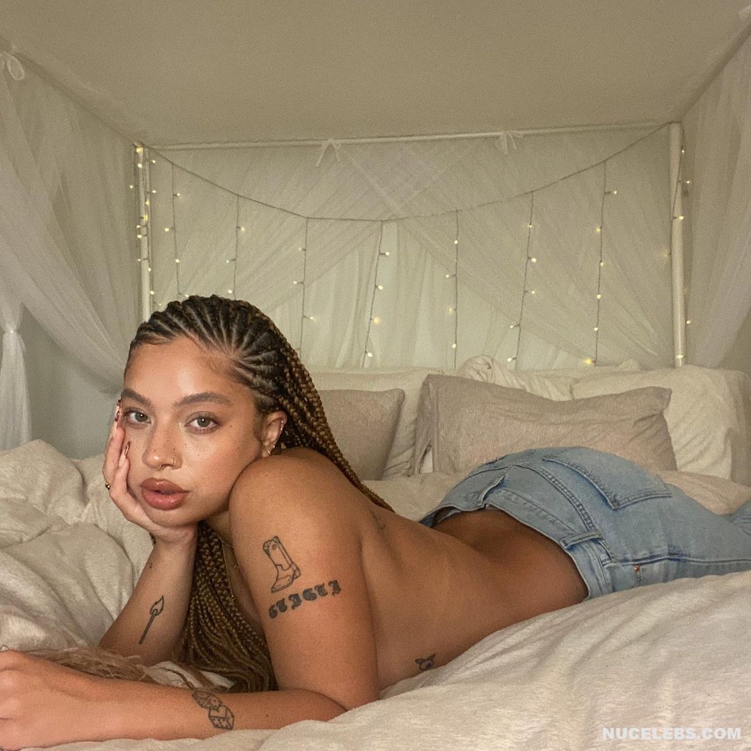 Kiana Ledé loves to tease the audience by appearing topless or in see-through outfits. So, her long white lace dress was so transparent that Kiana Ledé’s nude boobs were on display at the event. But this sweet curly-haired baby posed in a brown transparent top and denim skirt, through which her titties were also visible. Kiana Ledé also pressed her nude boobies against the sheets as she posed on the bed.