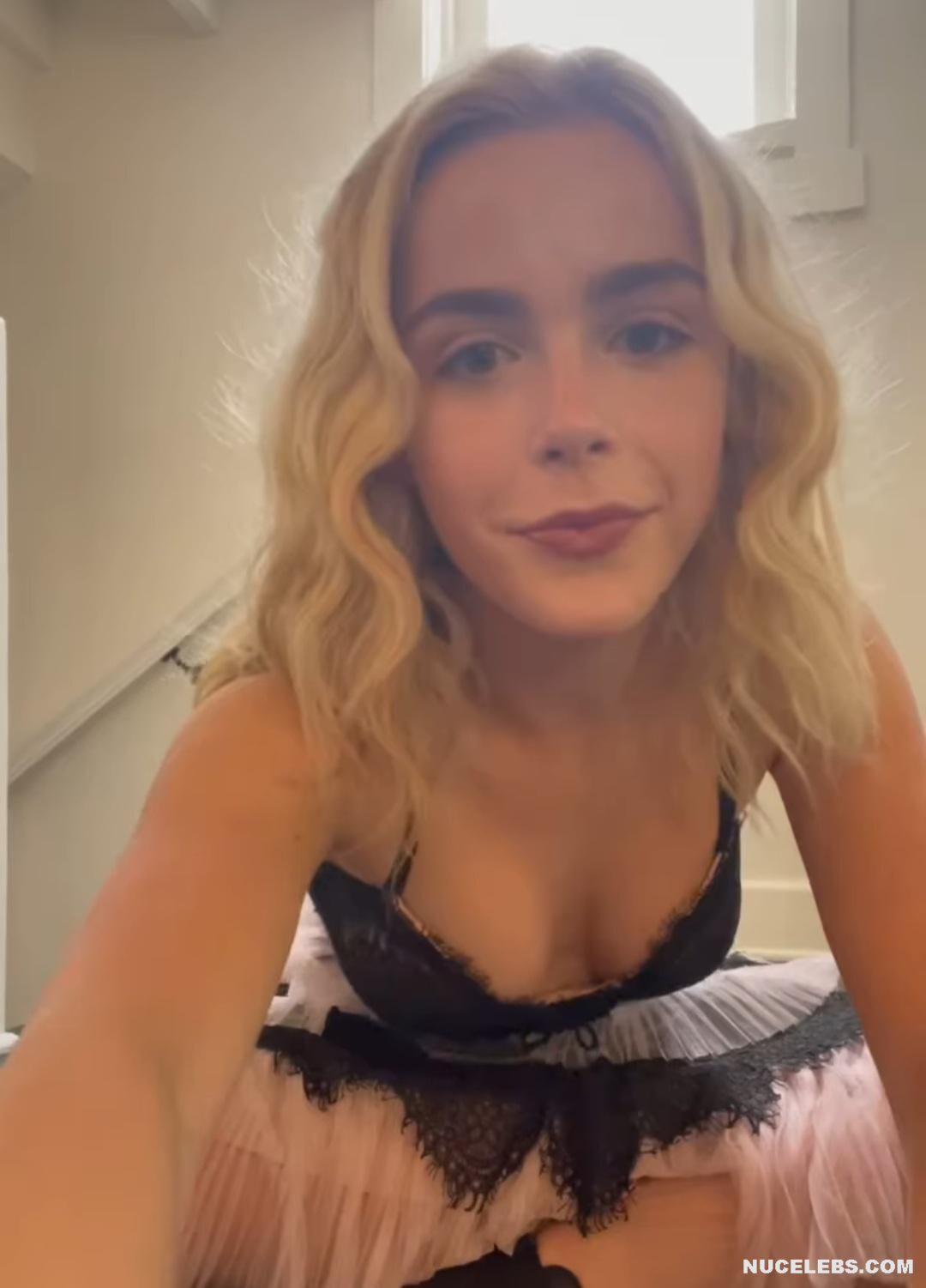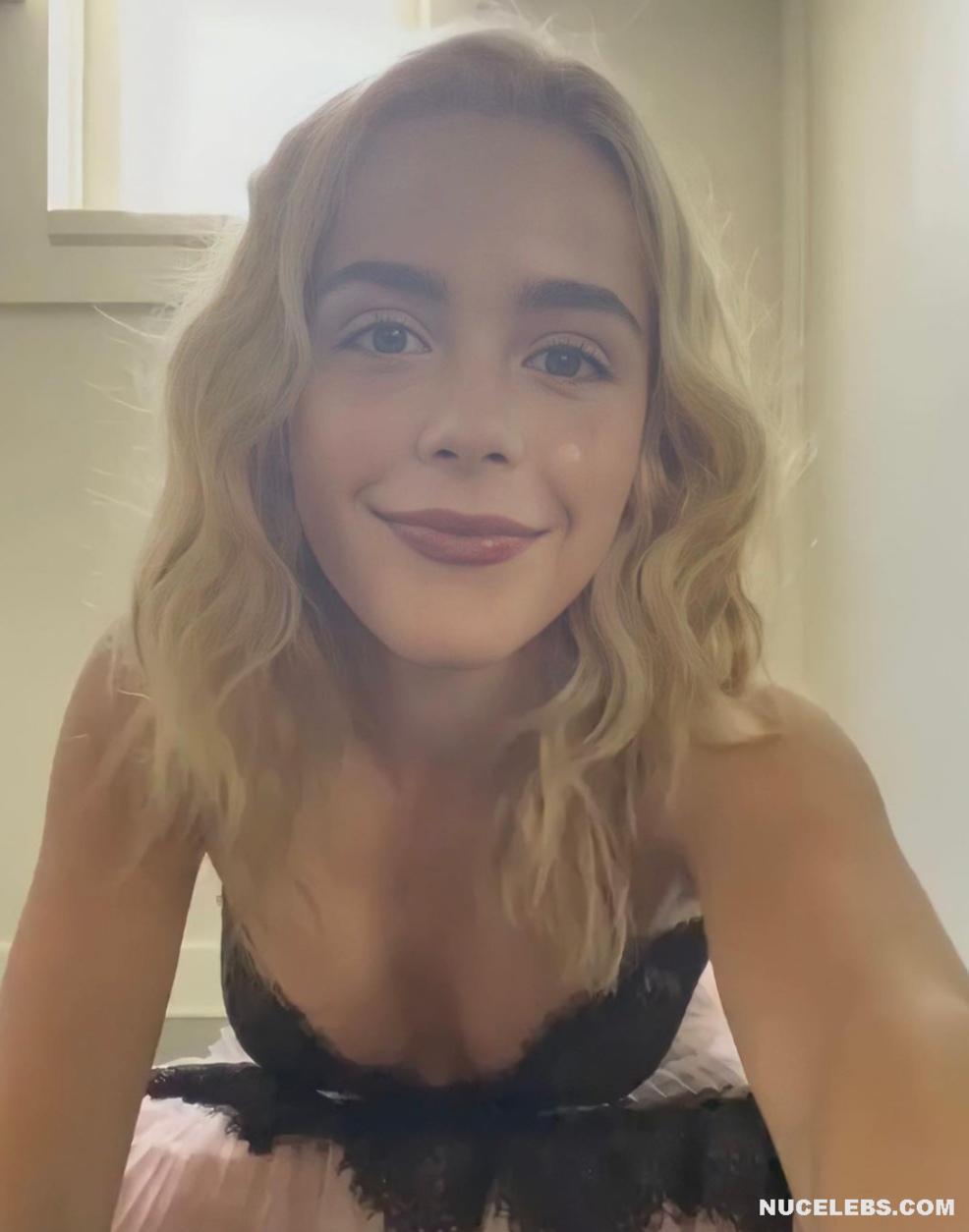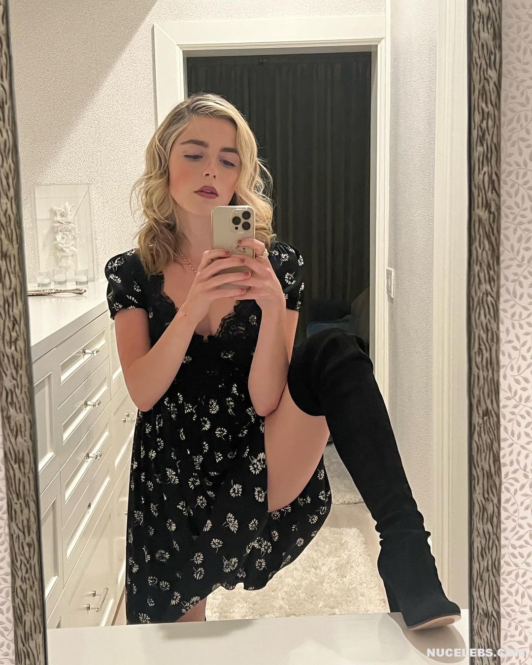 Kiernan Shipka loves to show off her almost nude awesome titties in skimpy outfits. So, this American actress looked amazing in a short black lace dress while sitting on the bed. At the same time, Kiernan Shipka almost jumped out of the low neckline, and her white panties also peeked out from under the dress. Also, this celebrity showed off her boobs with poking nipples in a white lace bra in other pics.