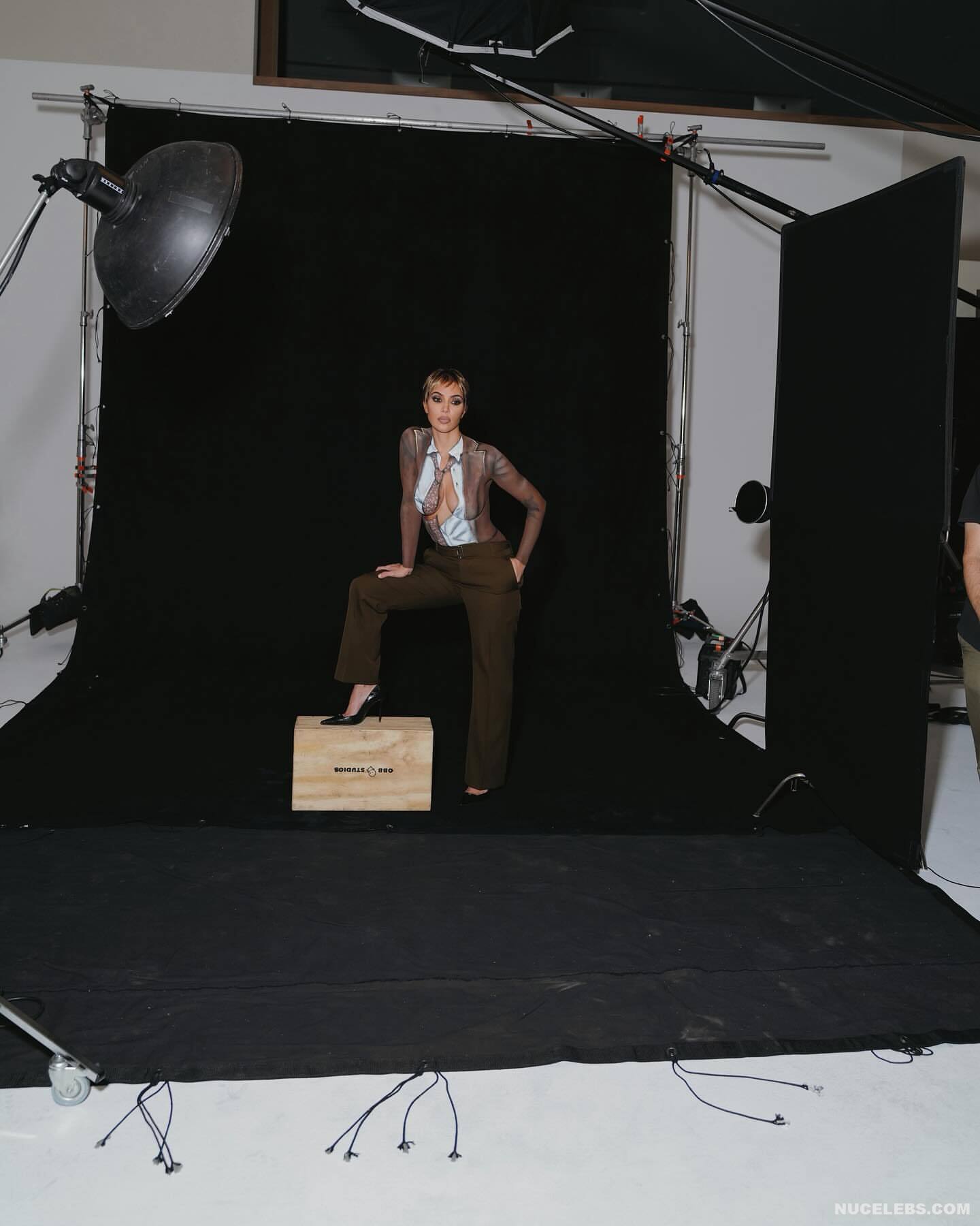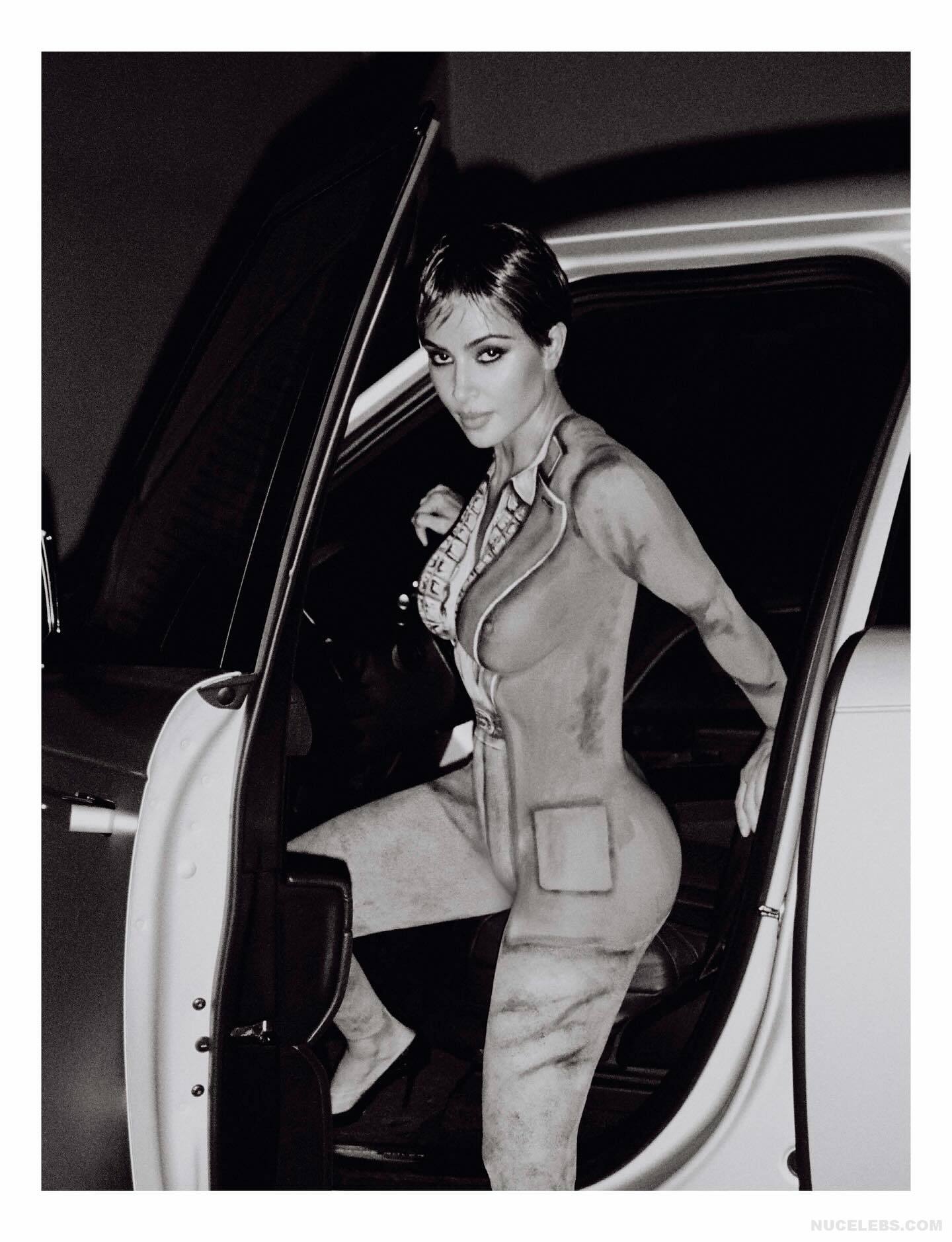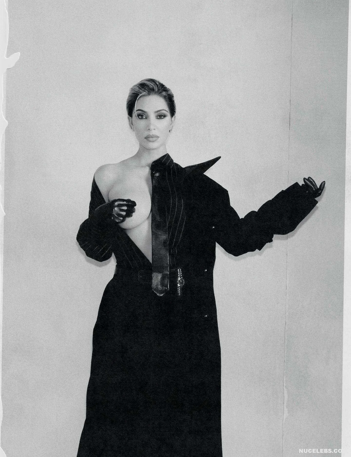 Don’t miss Kim Kardashian naked tits! During the photo shoot, Kim decided not to wear the top part of her outfit and just do her makeup. As you can see, it was obvious that something was missing. We can enjoy not only Kim Kardashian boobs, but also her erect nipples, which gave away her idea with the makeup.