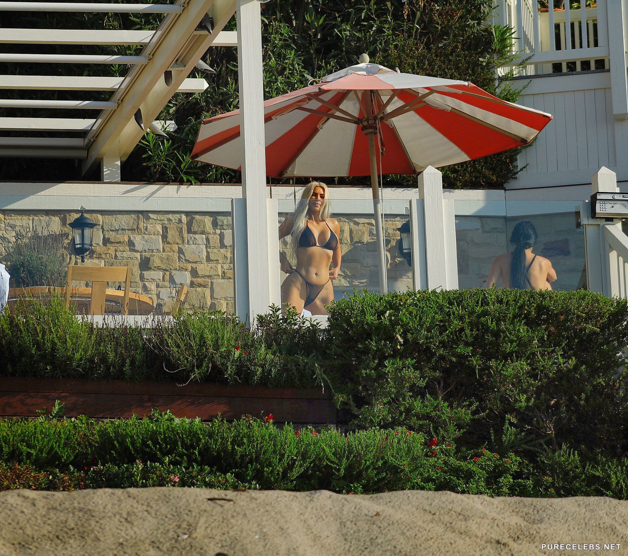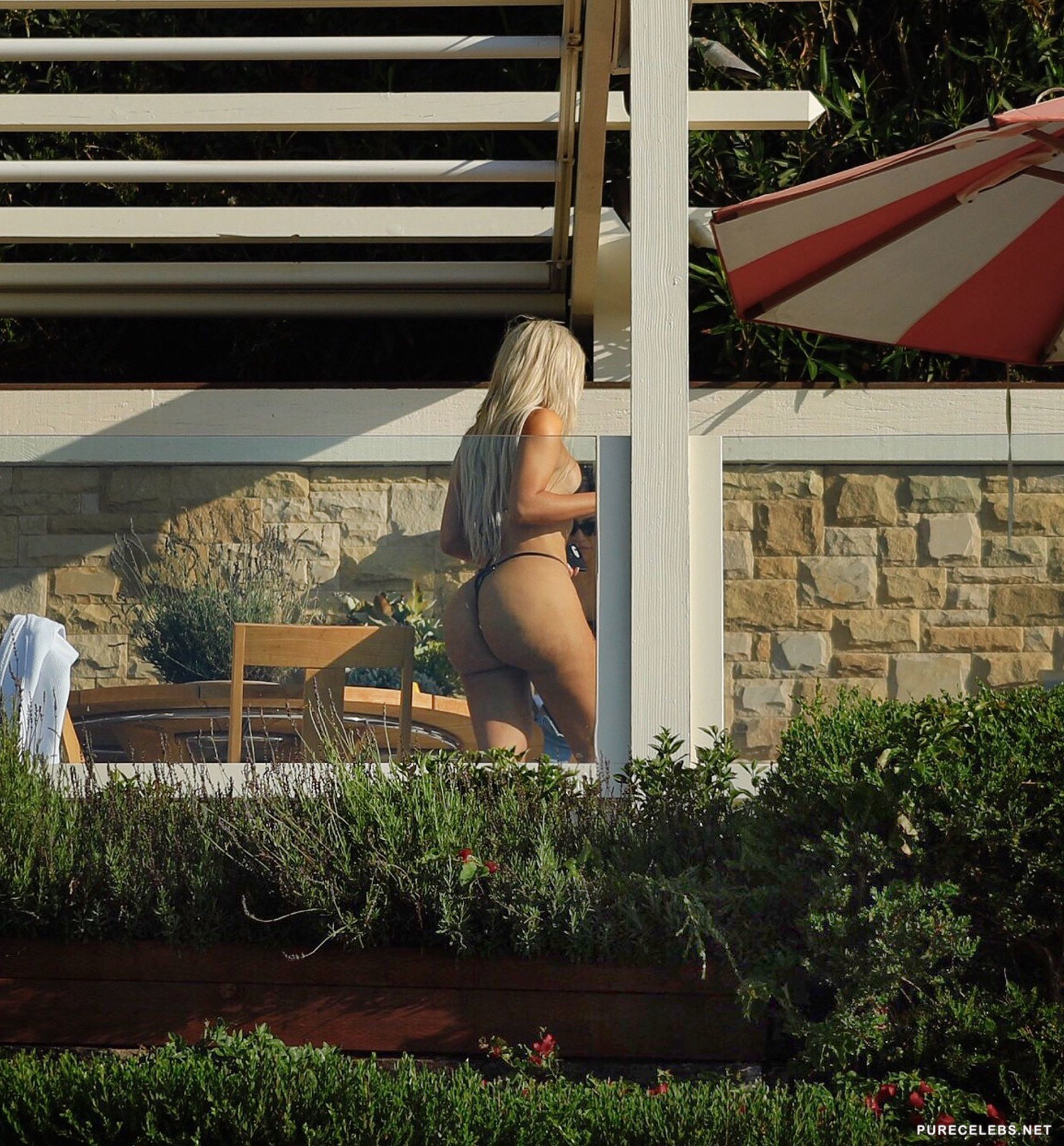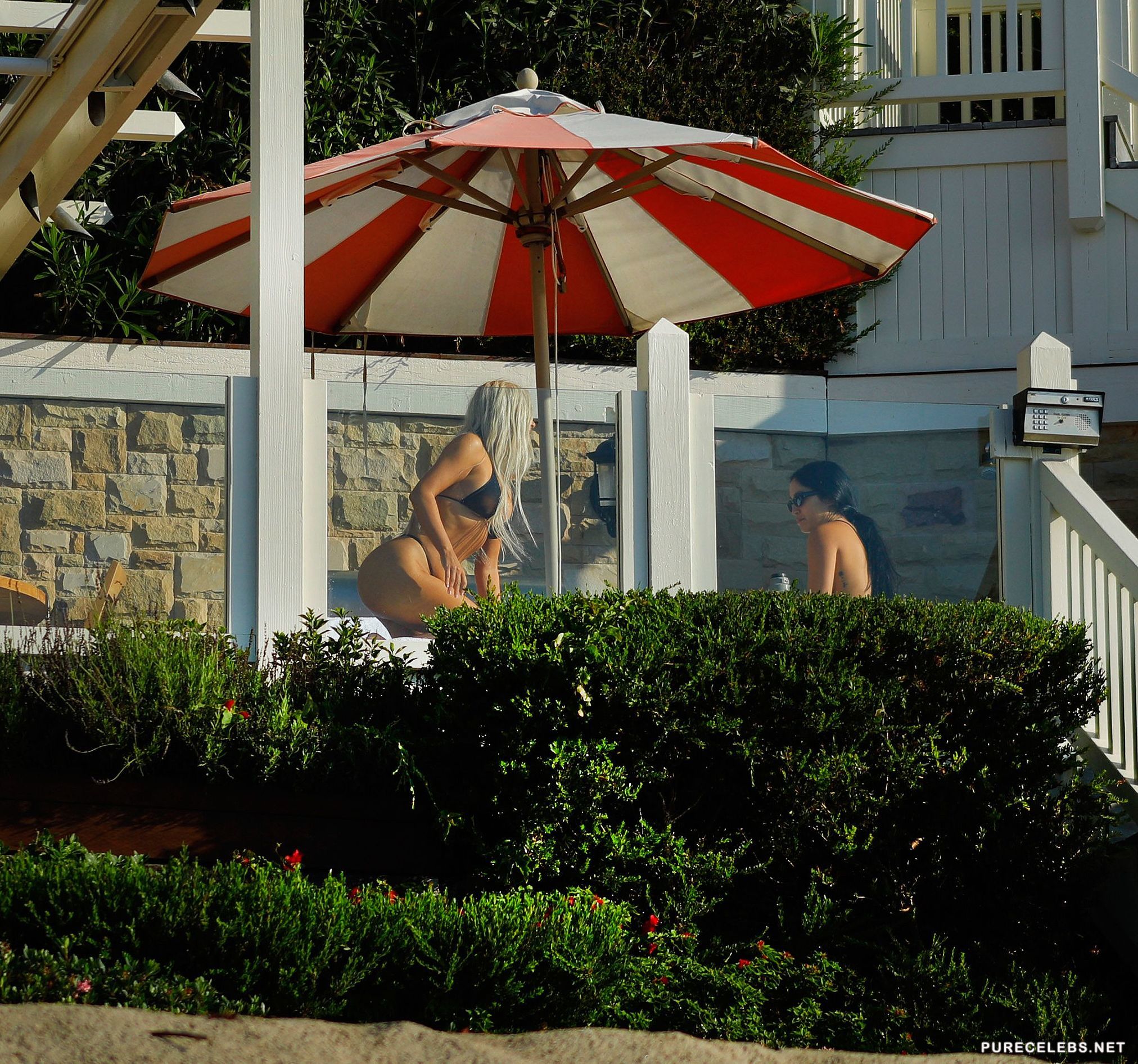 Famous for releasing making her nude photos and sex videos public, Kim Kardashian West has another treat for her fans. The reality TV star was photographed sunbathing topless and in a tiny bikini while vacationing in Malibu. The miniature thong was barely enough to cover her pussy, but not nearly enough to cover her luscious ass. The hot blond enjoyed laying on the beach and playing in the water with her equally hot friend.