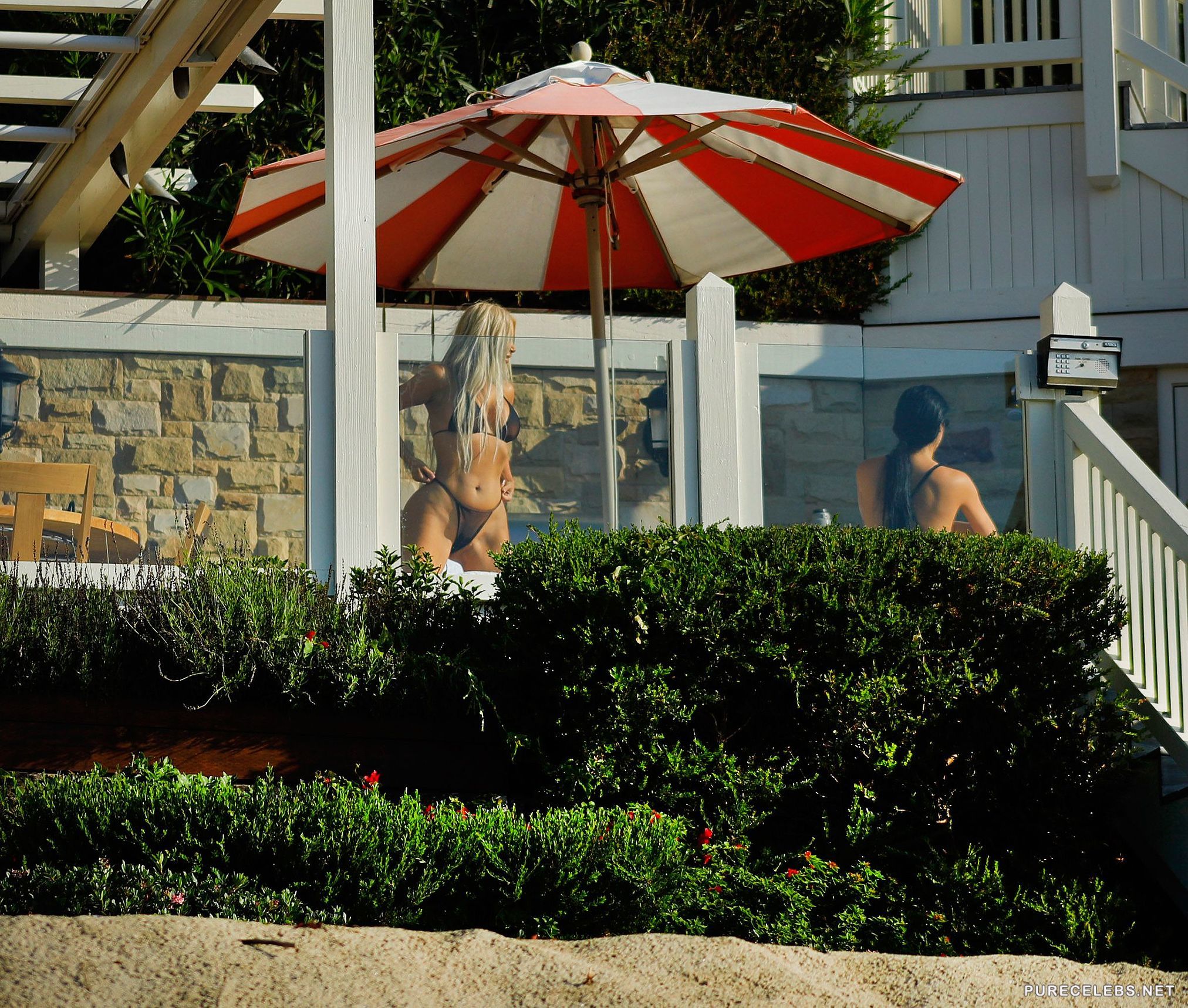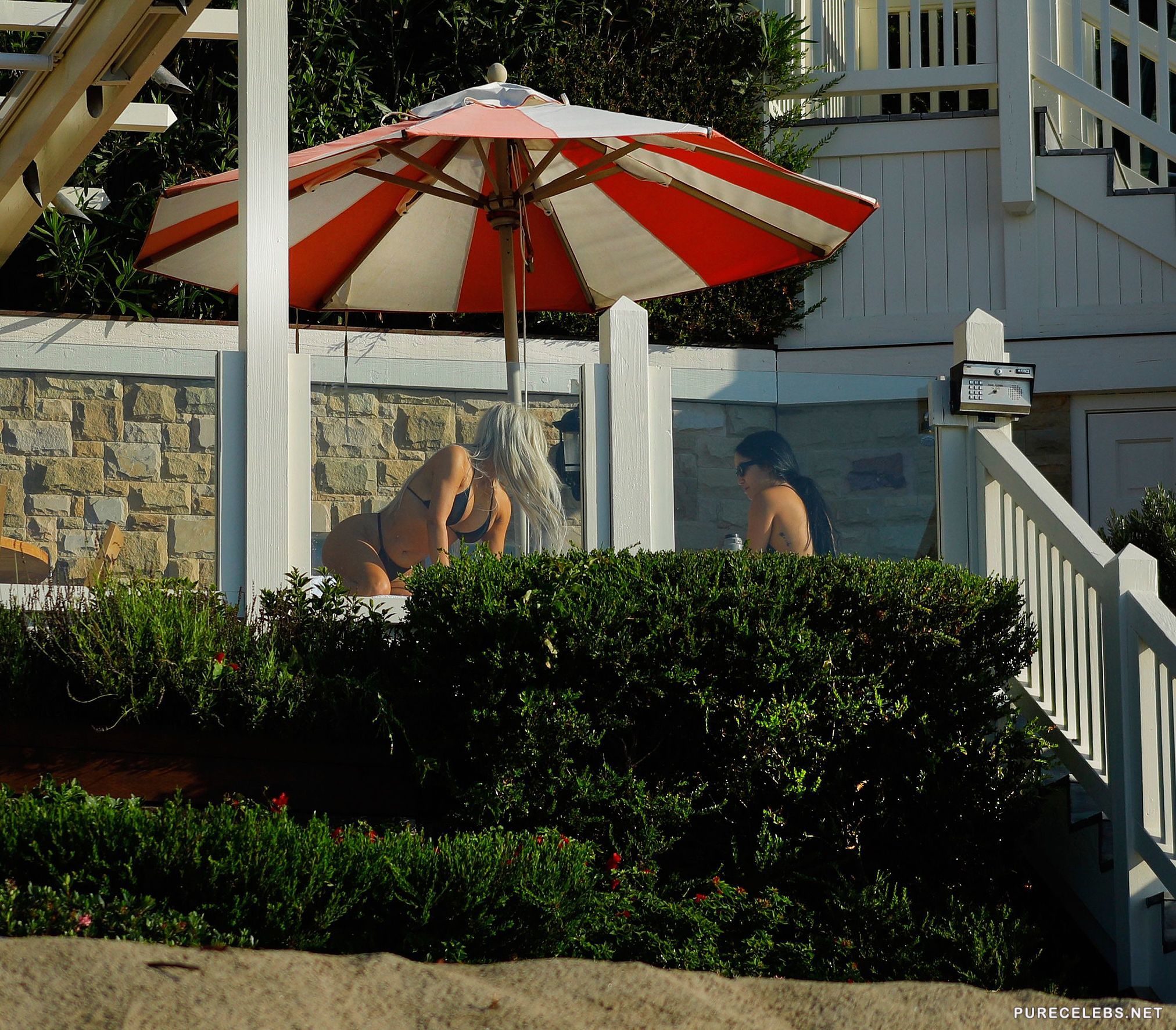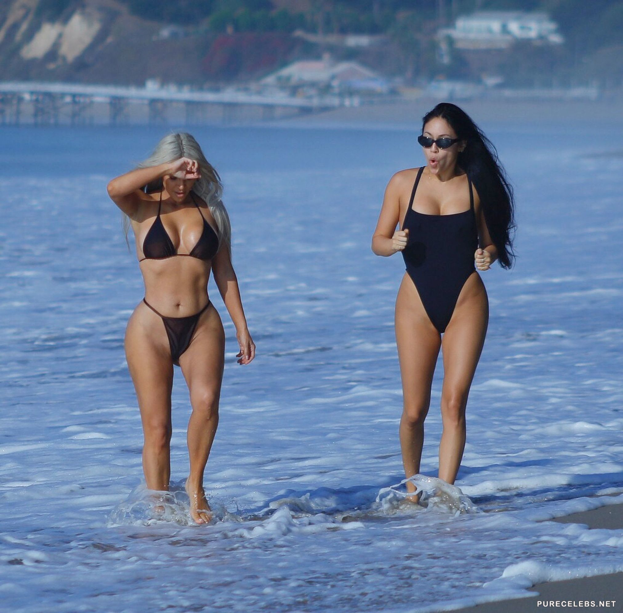 Famous for releasing making her nude photos and sex videos public, Kim Kardashian West has another treat for her fans. The reality TV star was photographed sunbathing topless and in a tiny bikini while vacationing in Malibu. The miniature thong was barely enough to cover her pussy, but not nearly enough to cover her luscious ass. The hot blond enjoyed laying on the beach and playing in the water with her equally hot friend.