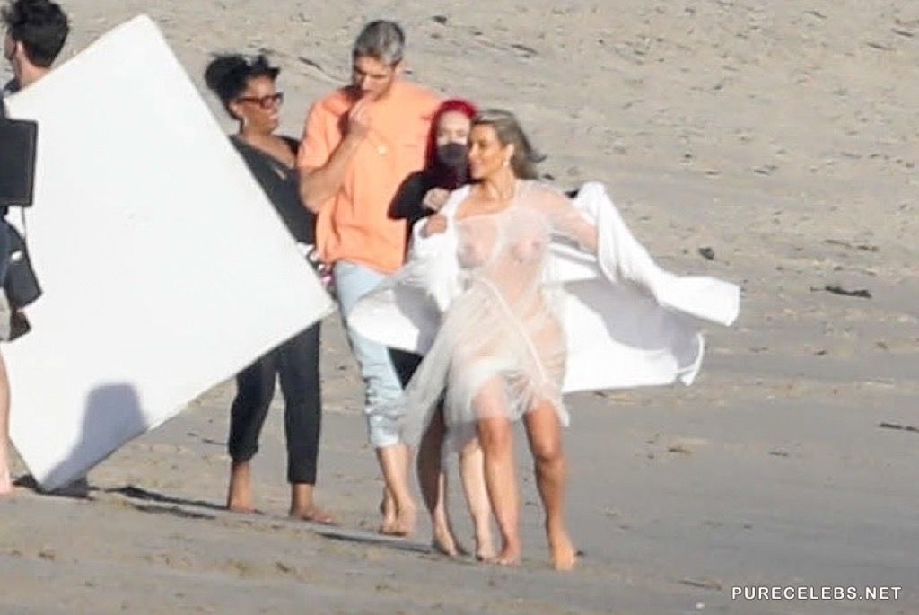 Kim Kardashian has a lot going on in her life right now, she and her celebrity rapper husband Kanye West are expecting another child via surrogate and she still has to work on her mega popular reality TV show Keeping up with the Kardashians. However, she took time from her busy schedule to get in front of the camera for the US edition of Elle magazine and show off her naked tits in a beach photo shoot.