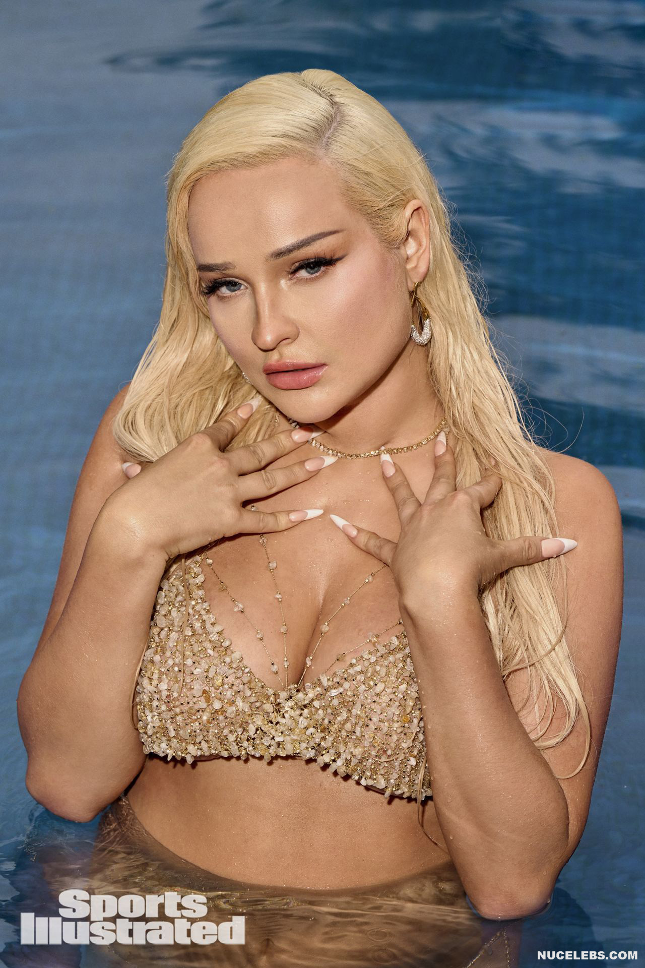 Kim Petras angelic features are highlighted by her expressive blue eyes. Her ethereal beauty is further accentuated by her long, flowing golden locks. Therefore, it is not surprising that this German singer appeared in the pages of Sports Illustrated Swimsuit 2023. For all of us, this is a great chance to admire Kim Petras huge breasts peeking out of the plunging black swimsuit. Also, check out Kim Petras’ big peach booty that she showed off in a pink swimsuit. This celebrity was happy to demonstrate her body from different angles to captivate her audience.