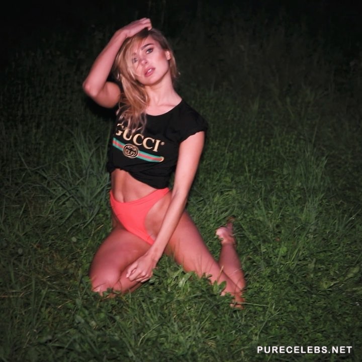 Swimwear designer Kimberley Garner is simply obliged to demonstrate her amazing body in tight bikinis, because fashion begins with her. Recently, this hot blonde appeared before everyone in a blue swimsuit with a white print, which was very suitable for her. In it, her boobs seemed incredibly large and juicy, ready at any moment to slip out of a tight bra. A narrow thong perfectly emphasized her seductive round ass.