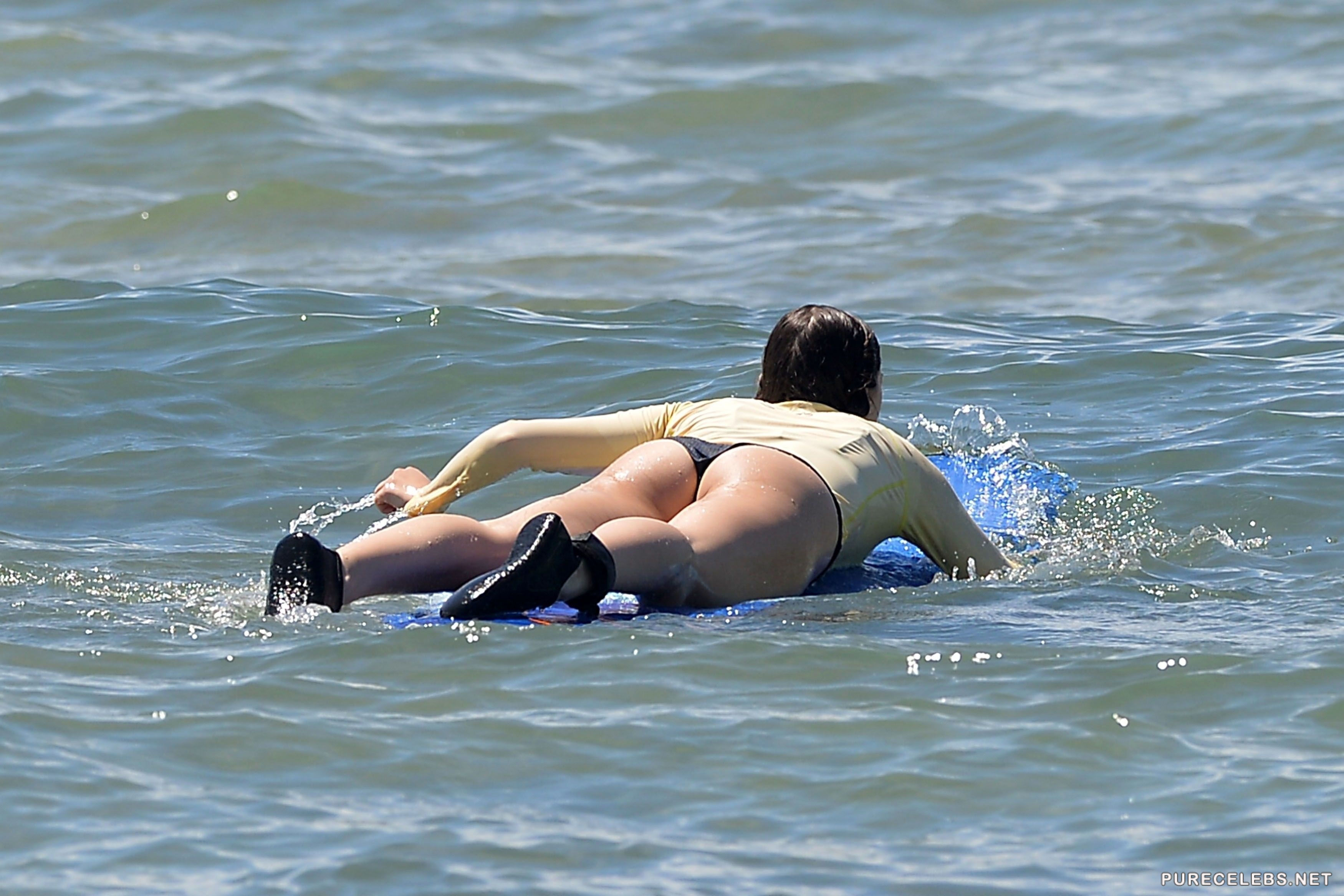 Kira Kosarin, an American actress well known for her role as Phoebe Thunderman on the Nickelodeon series The Thundermans. The 20-year-old actress is enjoying some time off from working in the tropical paradise. She is swimming and surfing, exposing her ass in bikini thong. Later she is hanging out with her friends in her now completely wet swimming suit, with camel toe clearly showing.