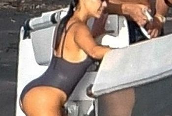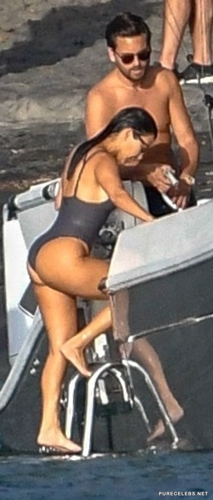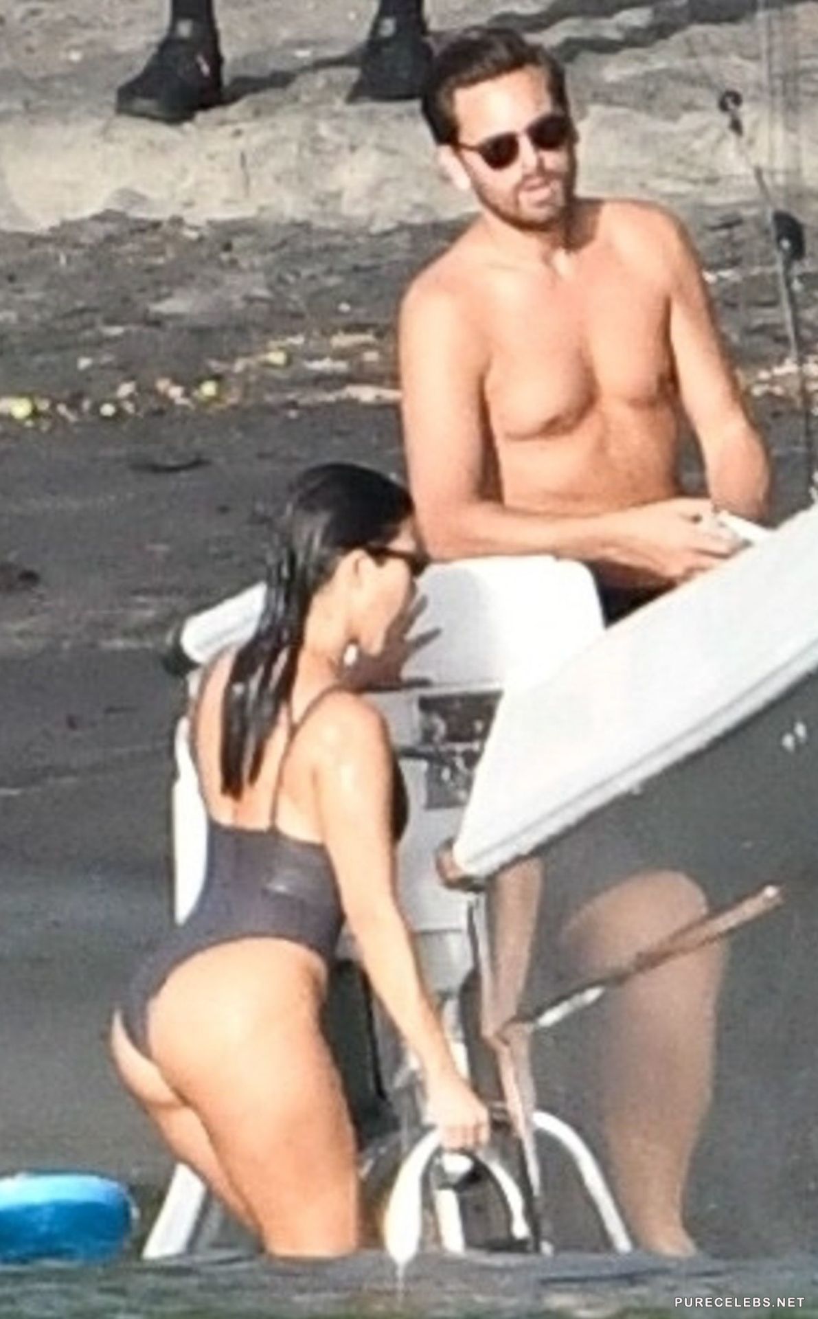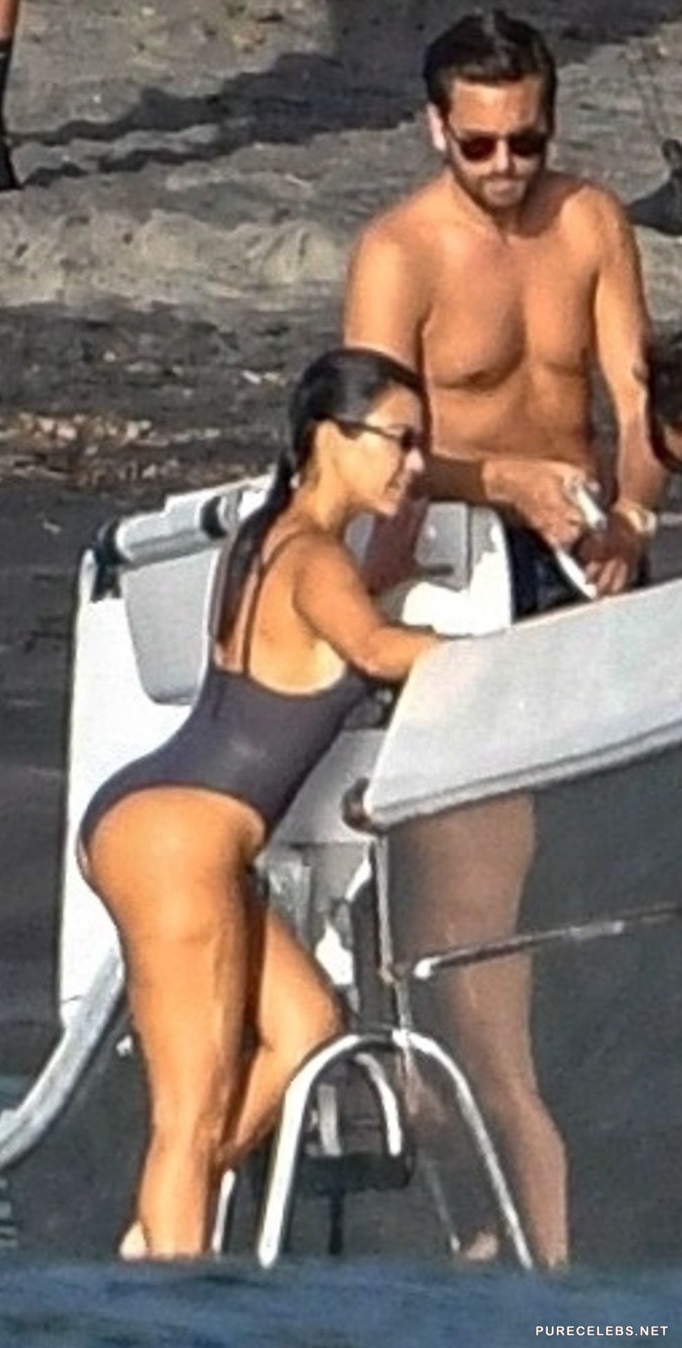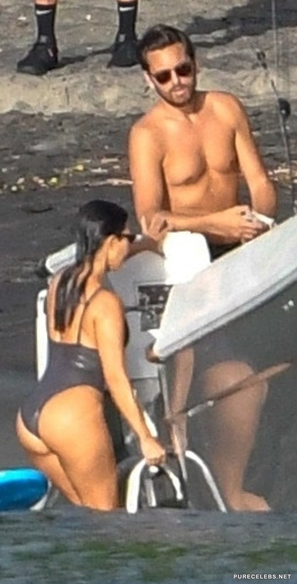 The socialite Kourtney Kardashian was caught by paparazzi during her vacation on the beach. The celebrity was wearing a coffee-colored swimsuit that remarkably emphasized the curves of her gorgeous body. Her juicy peach ass looked just incredible in a wet swimsuit when she came out of the water. And her huge awesome tits seemed to be able to jump out of her little swimsuit. This star looks just incredible!