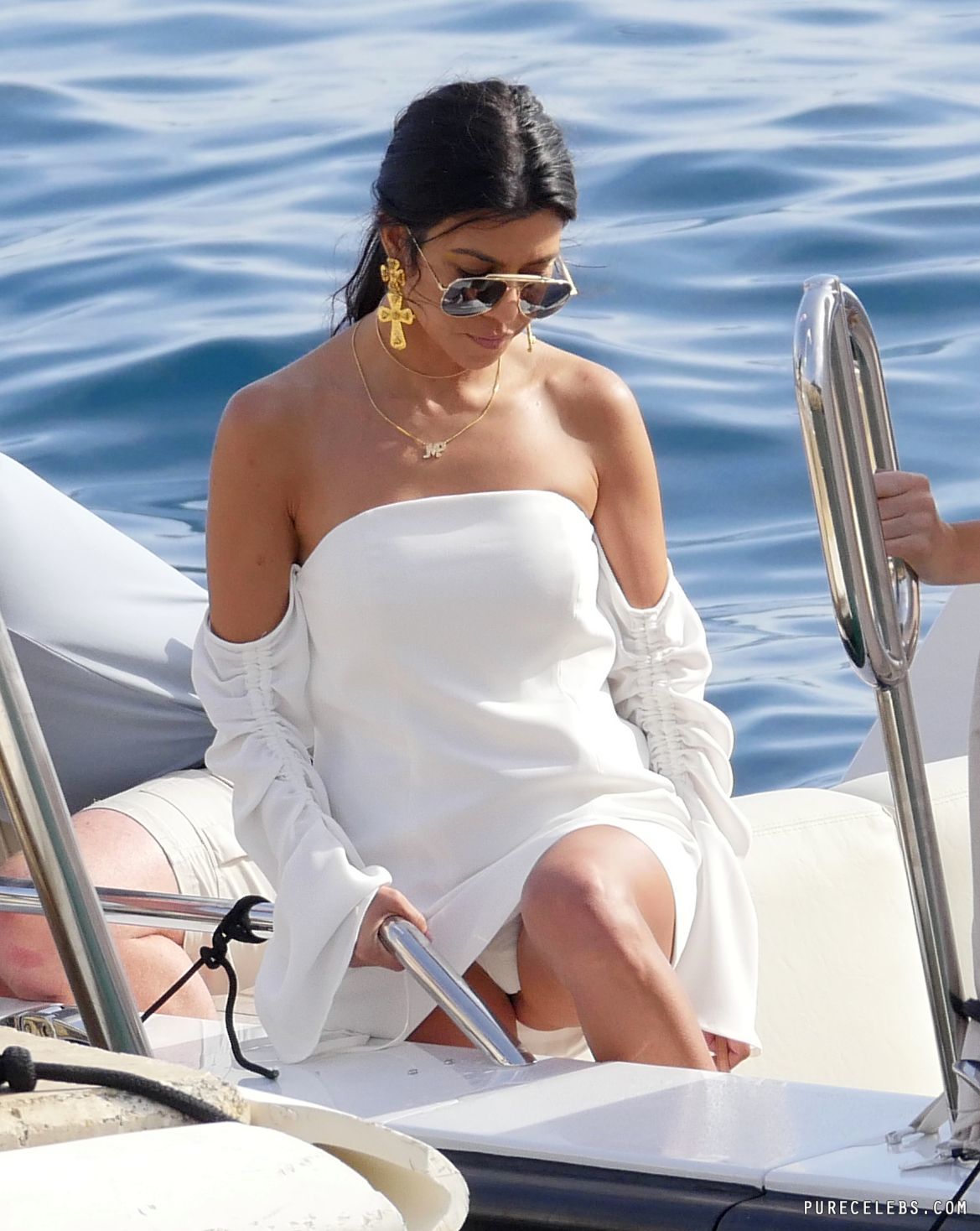 Socialite Kourtney Kardashian almost flashed her nude pussy during her vacation on a yacht. The celebrity was wearing a short white dress. And when she got on the yacht, paparazzi managed to photograph her little white panties. Great upskirt moment, right? By the way, her chic tits were also ready to jump out of her little dress at any moment.