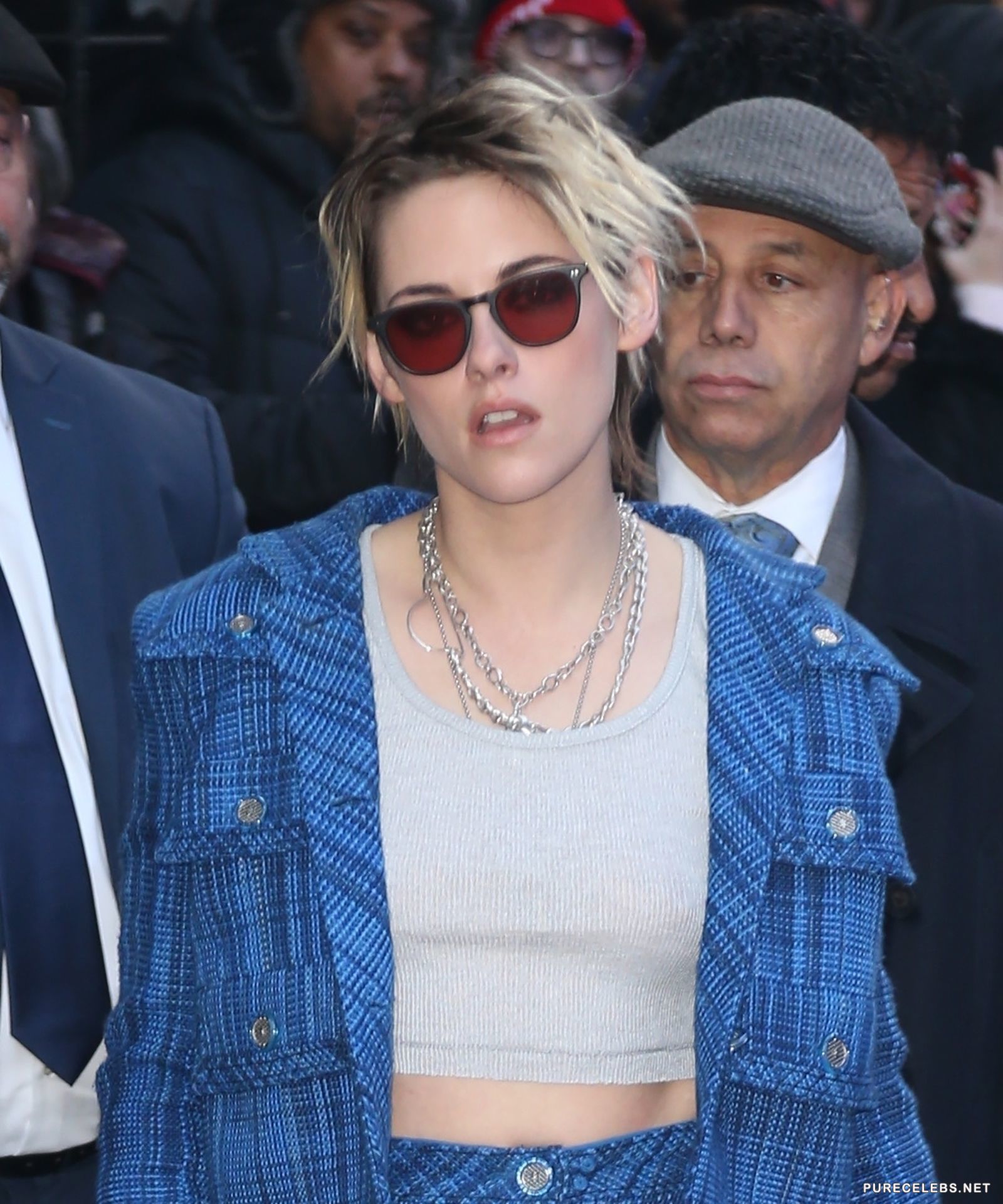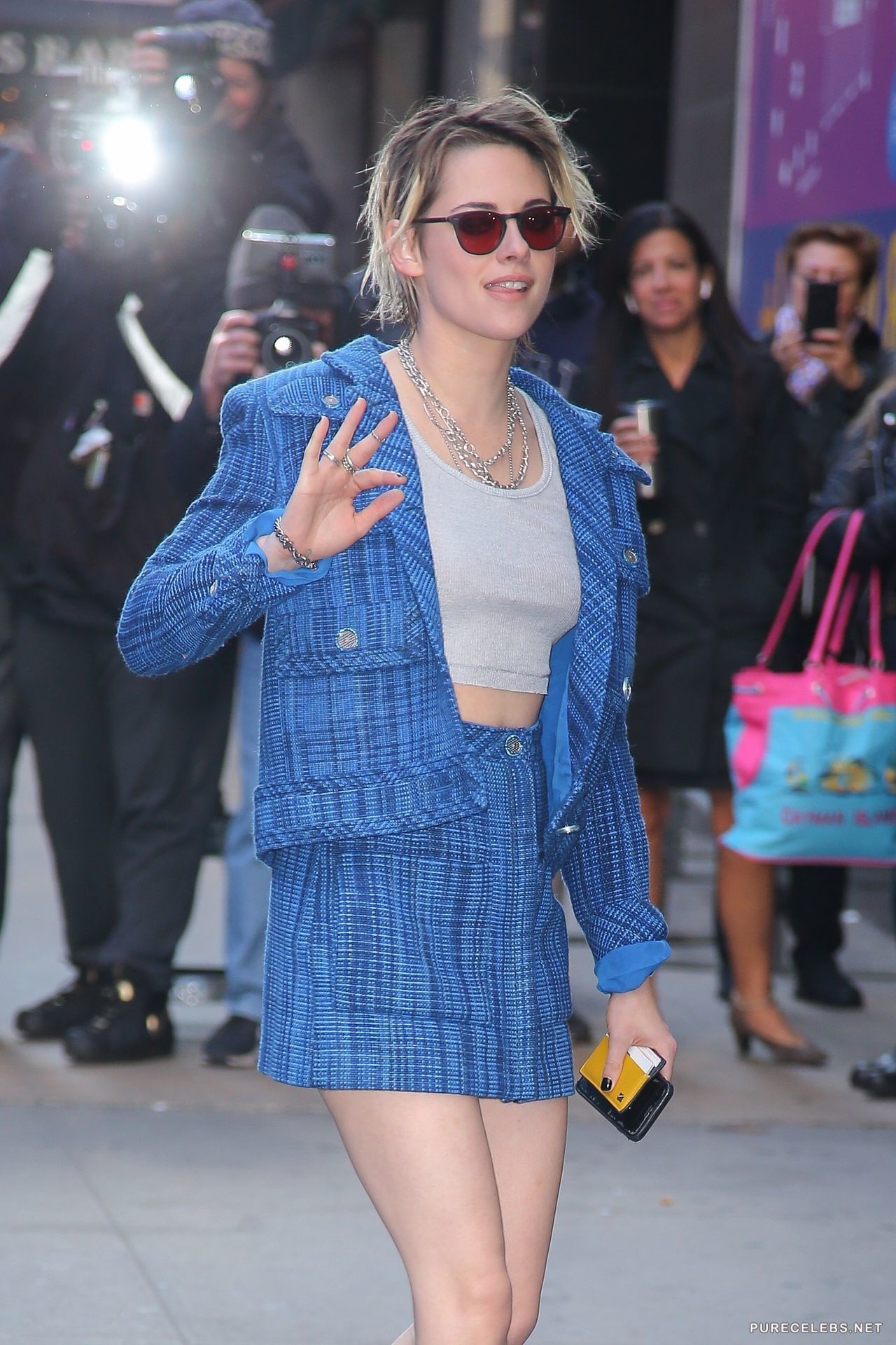 Paparazzi follow American actress Kristen Stewart everywhere, and her provocative photos often appear on the net. Not so long ago, paparazzi caught this beauty at an event dressed in a pretty blue suit. Her short skirt perfectly demonstrated her slim legs and barely covered her booty. And under her jacket was a white top, through the thin fabric of which her awesome tits with poking nipples were perfectly visible!