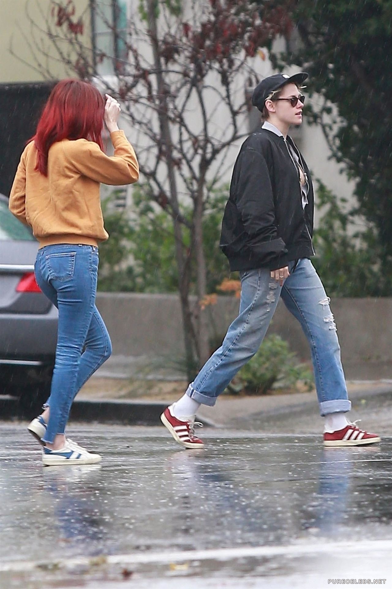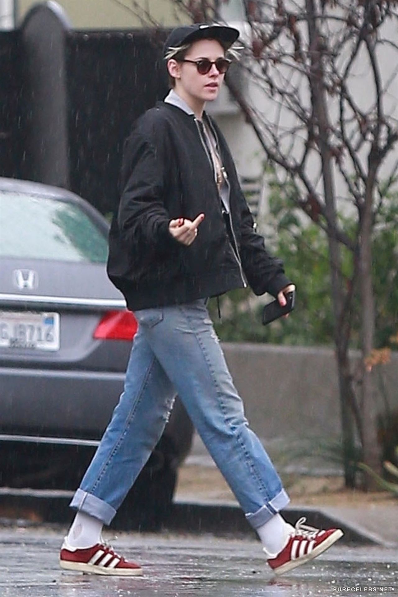 Kristen Stewart is outdoors with her friend and she is wearing a very inconspicuous outfit. She hopes that no one will recognize her, but one determined reporter manages to find her. She also forgets to wear her bra today so we can see her large tit slipping from her shirt. It is a cool day, so her nipples must be really hard when exposed to air.