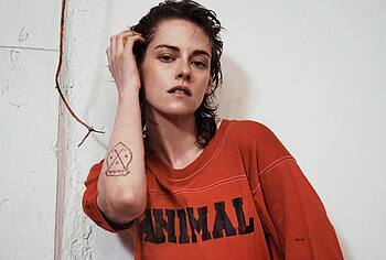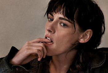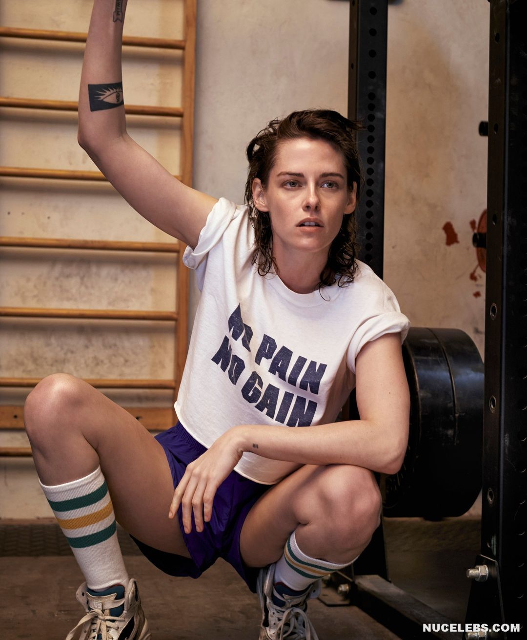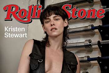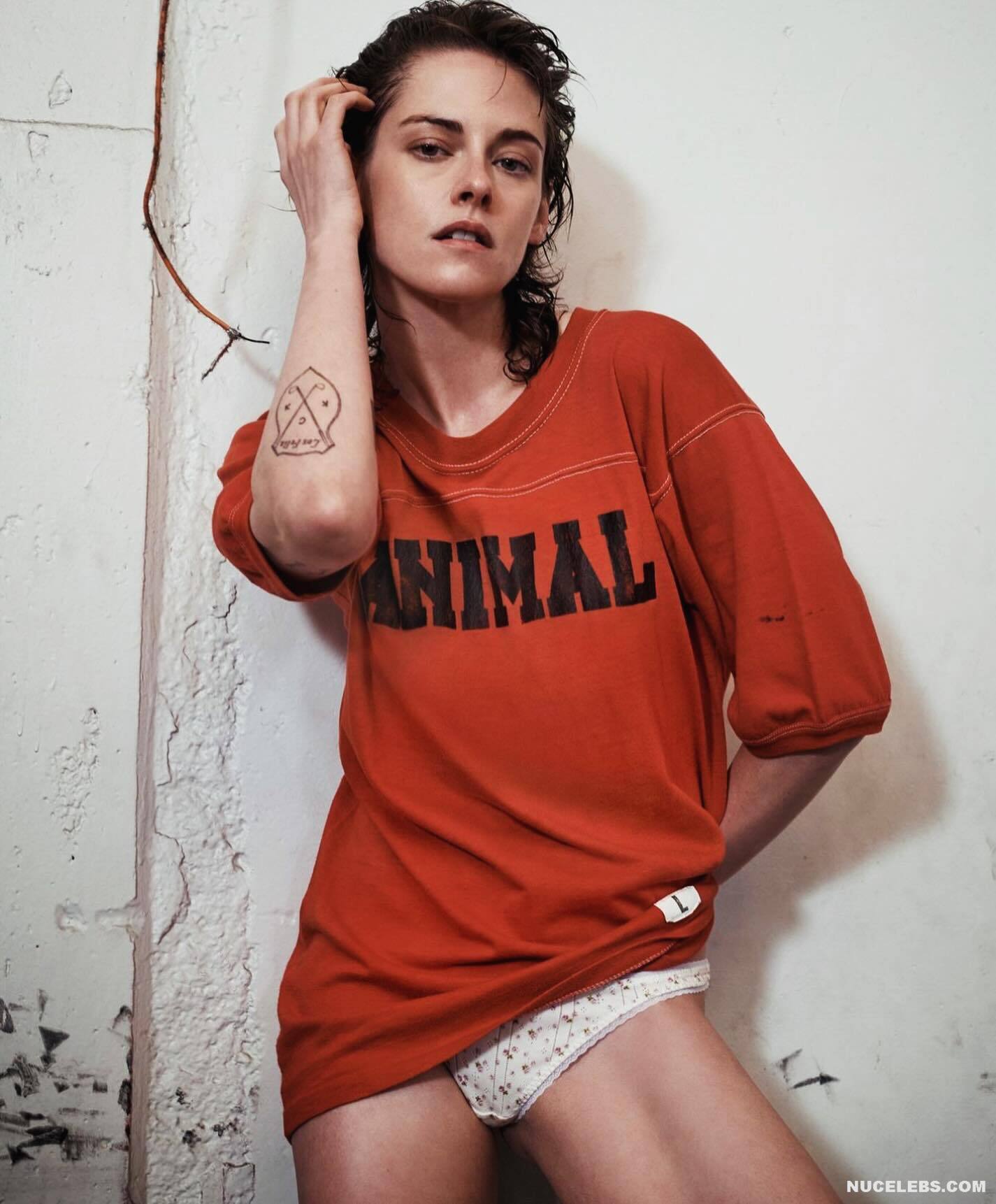Kristen Stewart was incredibly sexy on the cover of the magazine. So, the hand of this American actress was in striped panties and it looked like she was caressing her pussy with it. A black leather vest only partially covered Kristen Stewart’s nude boobs. The celebrity also flaunted her bare back while changing clothes in the gym. She also looked super sexy while working out!