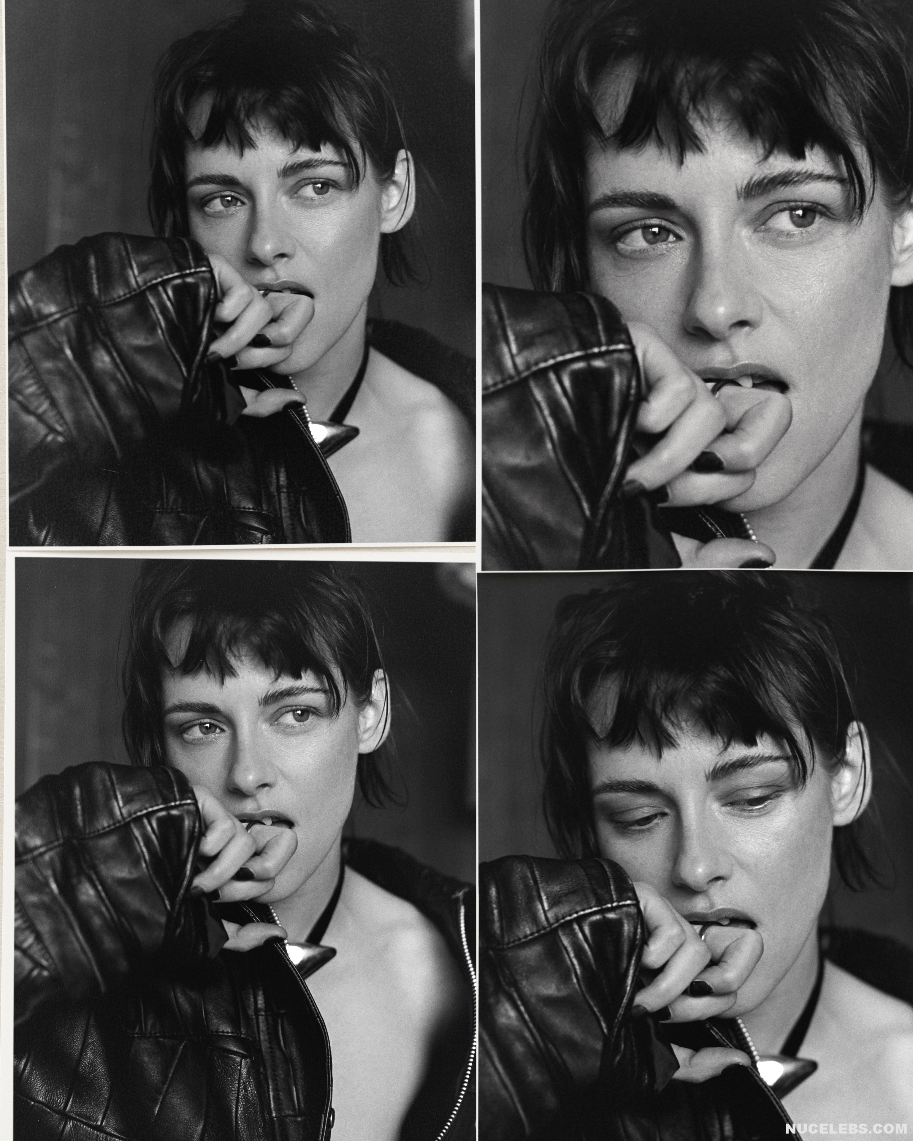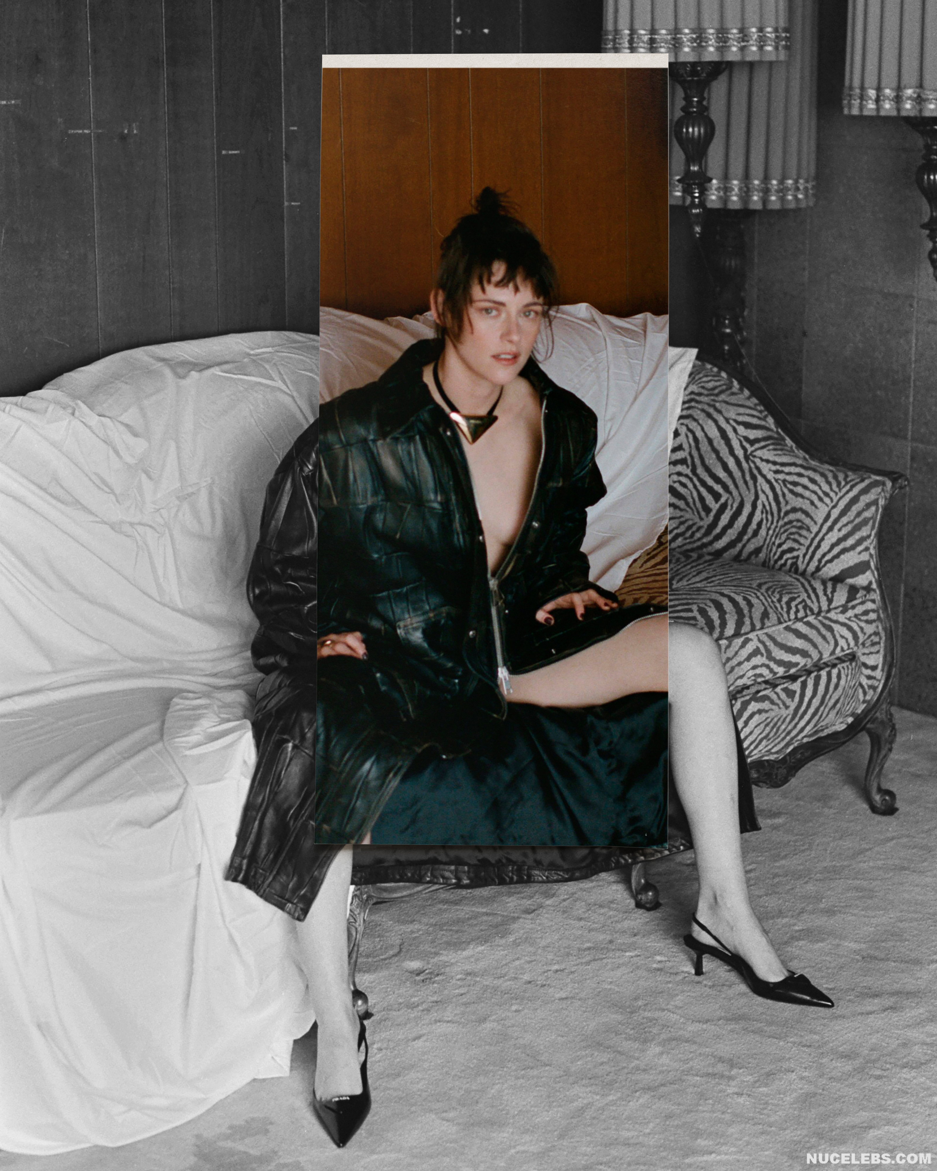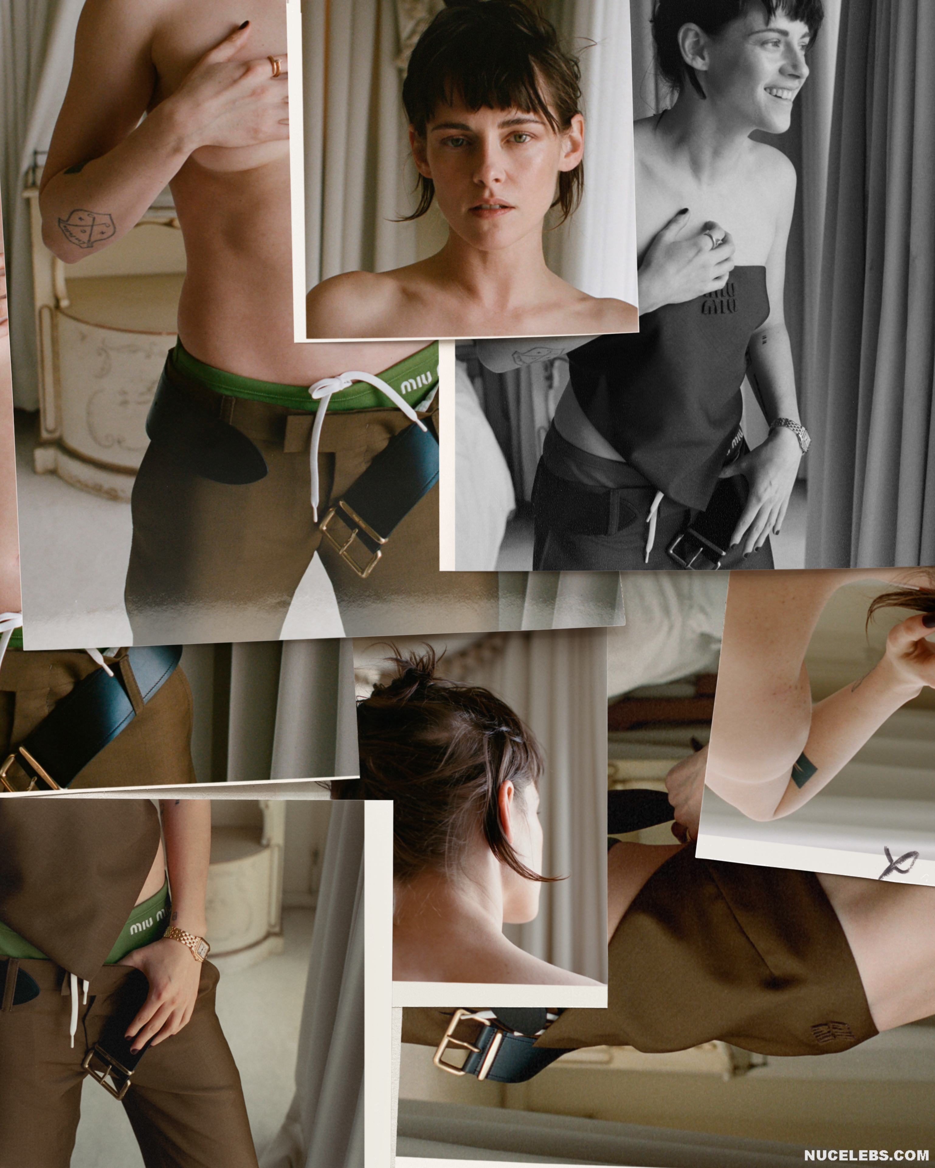 Kristen Stewart posed topless during one of her latest photo shoots! First, this adorable brunette showed off the sides of her sweet boobies in a white unbuttoned shirt as she sat on the bed. Then the 33-year-old celebrity posed in a miniature black bra with silver rhinestones and small black shorts… However, this was not enough for her! So Kristen Stewart dropped her bra and posed, covering her nude small titties with her palms!