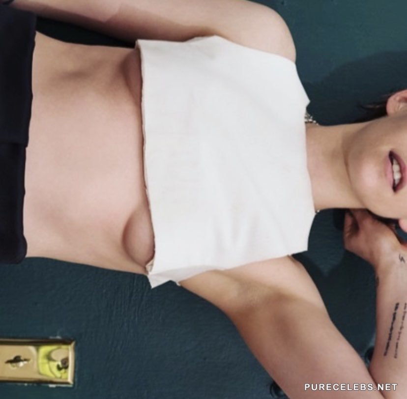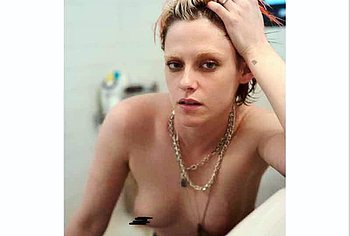 American actress Kristen Stewart that were not previously published have appeared on the network. On them you can see her in a very provocative way. The girl is lying on her back, and her white top is so short that you can see the bottom of her naked boobs. But even more pleasure you get from the photo on which the star is posing topless and you can enjoy the view of her awesome tits with hard nipples.