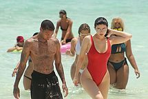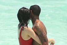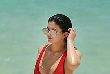 Socialite and reality TV star Kylie Jenner can’t keep the paparazzi off of her, so if you can’t beat ’em, join them. She put on a bikini bathing suit reminiscent of Baywatch and went into the warm tropical waters with her tattoo covered black lover, all while being photographed. What we ended up with is a gallery filled with candid pictures of her big ass in a wet thong.