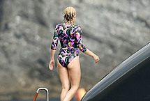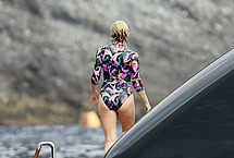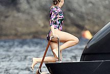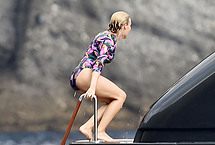Ripe blonde Australian singer Kylie Minogue is one of the hottest babes around despite her age. Celebs never age as good as she has, so it’s no wonder paparazzi are still hot on her heels. This time we get the chance to see this stunner coming out of the water and onto a yacht wearing a one piece bikini, completely wet, and utterly irresistible. How does she do it?