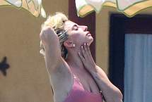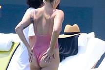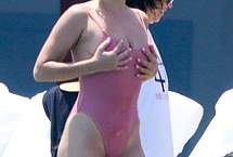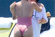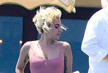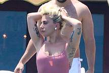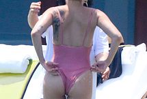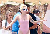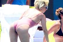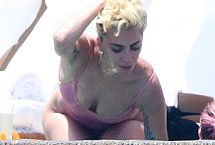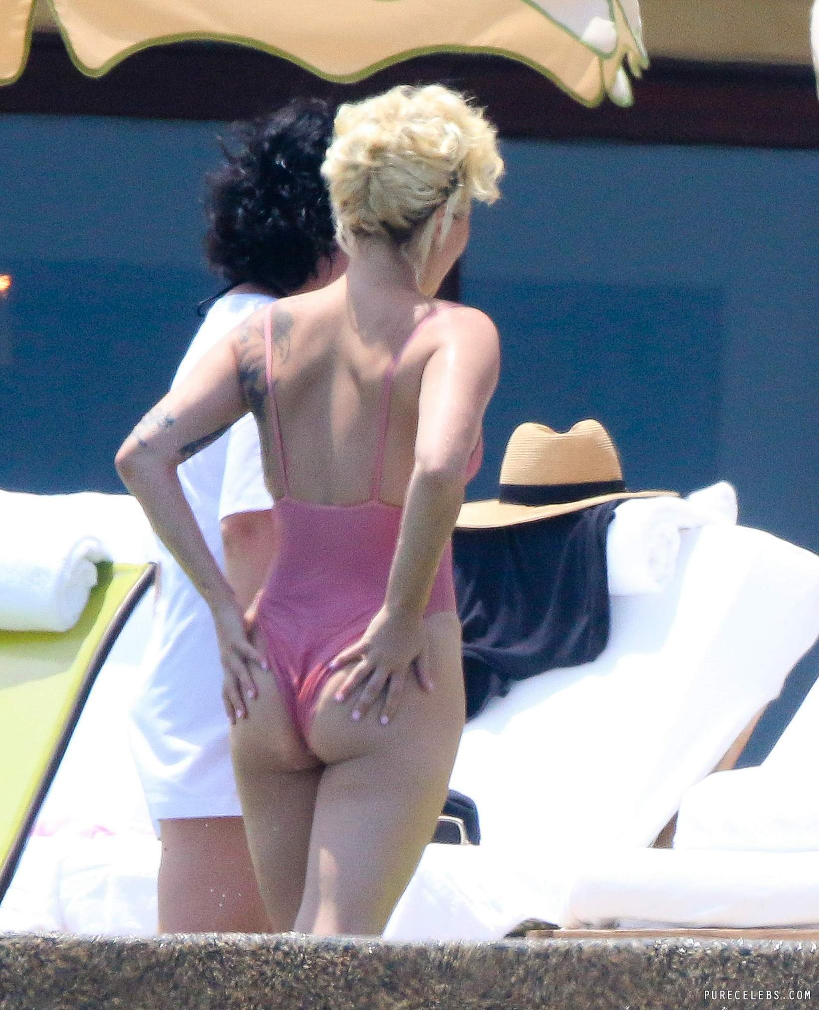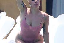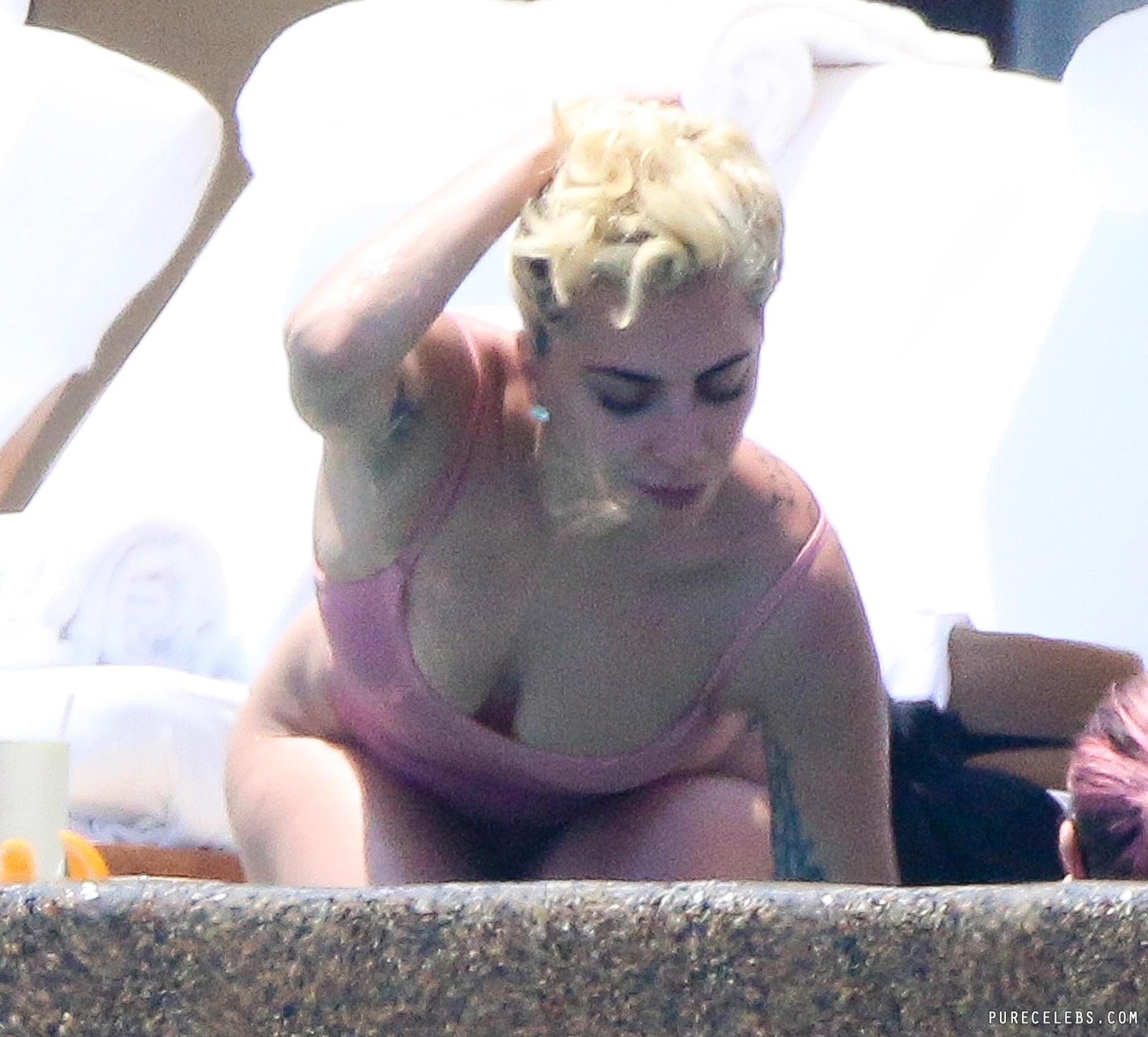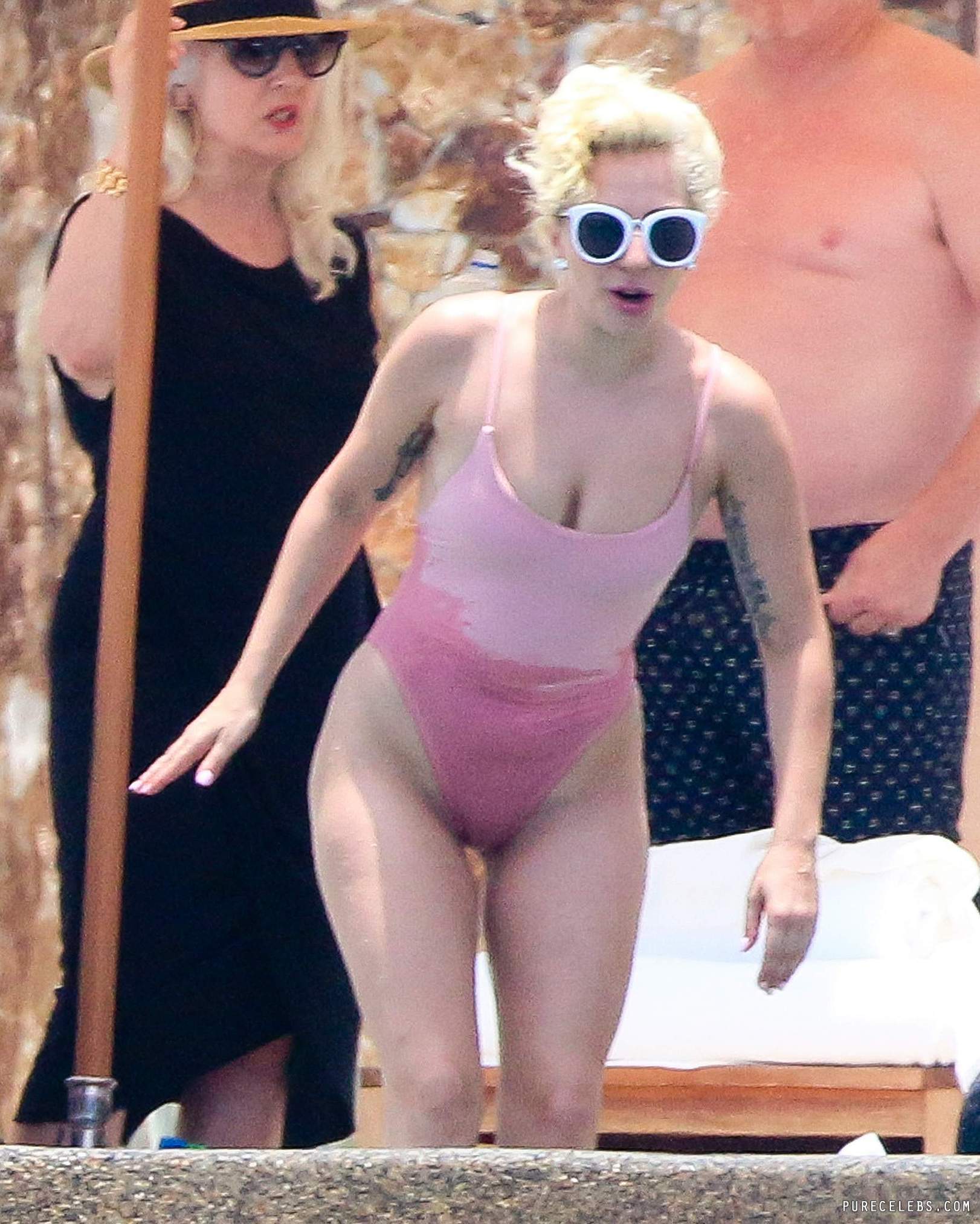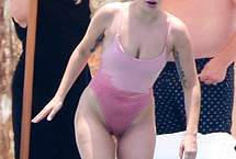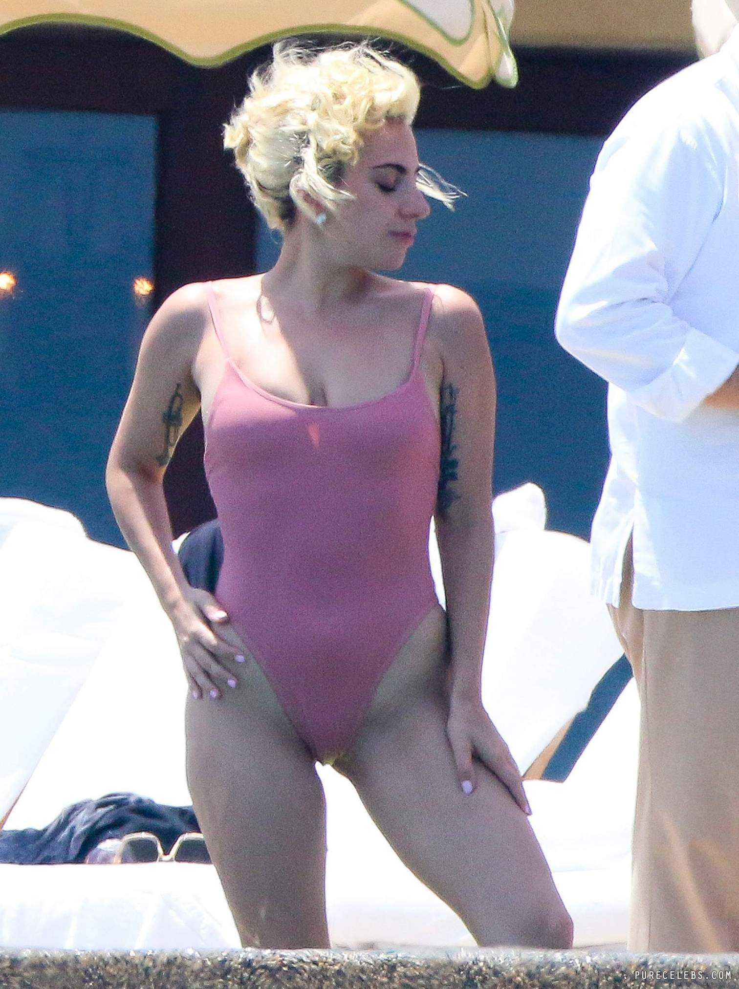 Blond singer Lady Gaga isn’t the type of celebs that is shy when it comes to her body, but she wasn’t counting on paparazzi to be with her on vacation. Wearing a one piece bikini, this hot booty babe went about her business, and ended up posing with the pokies coming through and her wet swimsuit climbing up her pussy in this set of candid beach photos.