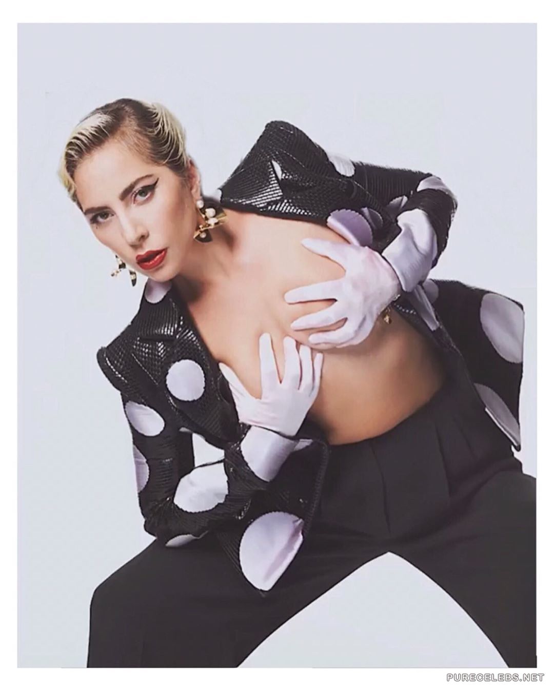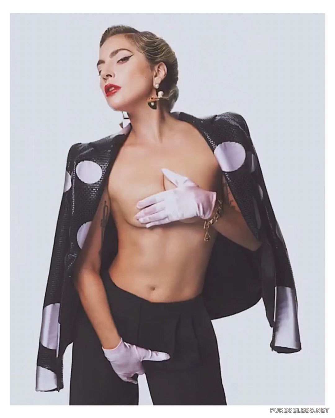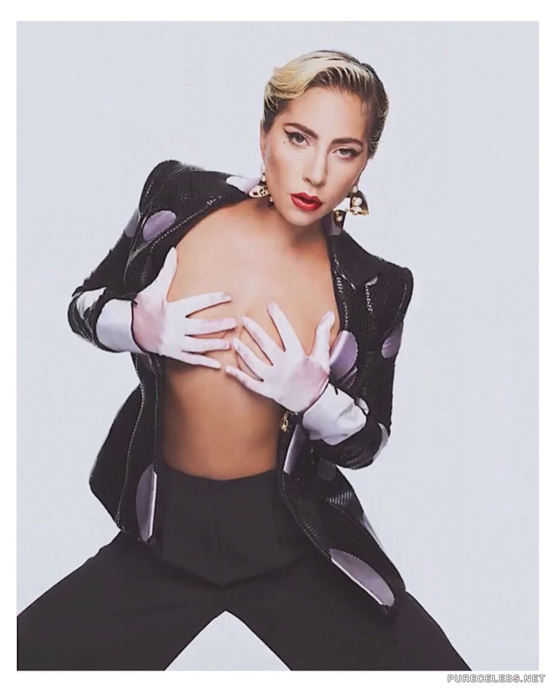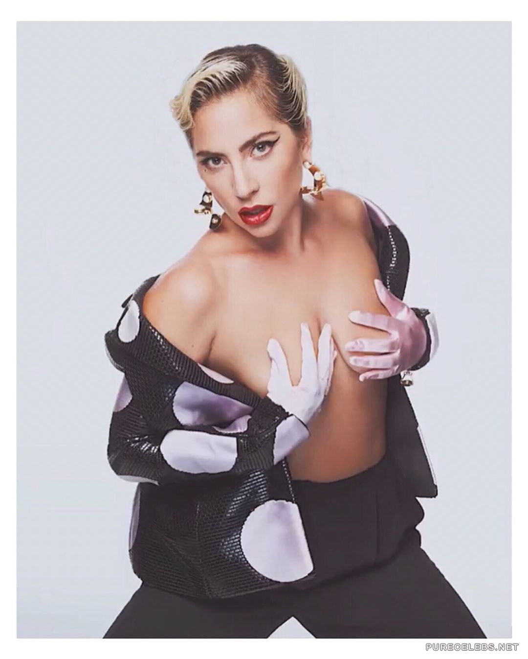 Everyone has long been accustomed to the fact that the American singer Lady Gaga is an incredibly shocking and scandalous celebrity. In addition, this girl is also very sexy, as you can see by looking at her photos that have recently hit the net. On them a charming blonde poses in an open jacket on her naked body. The star covers her juicy boobs with white gloves in her hands and it looks very seductive!