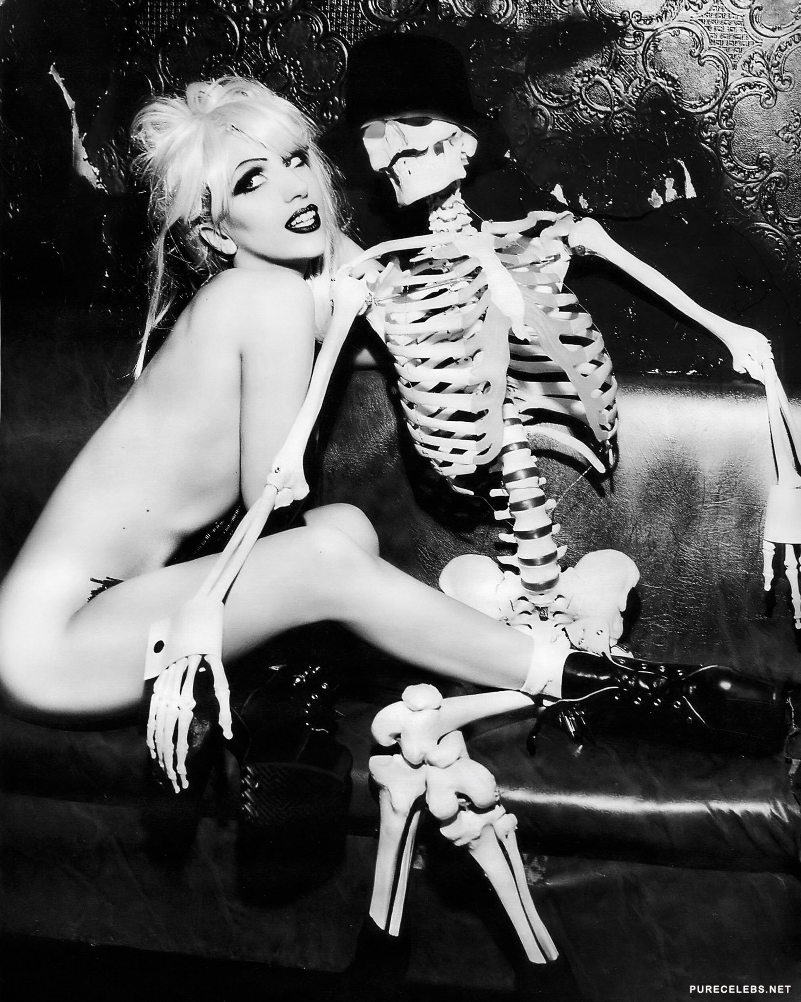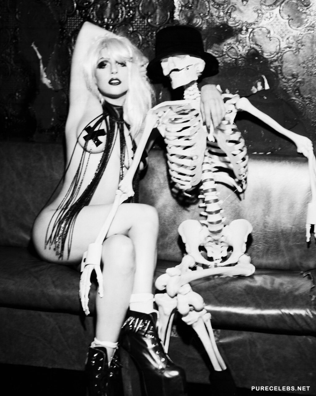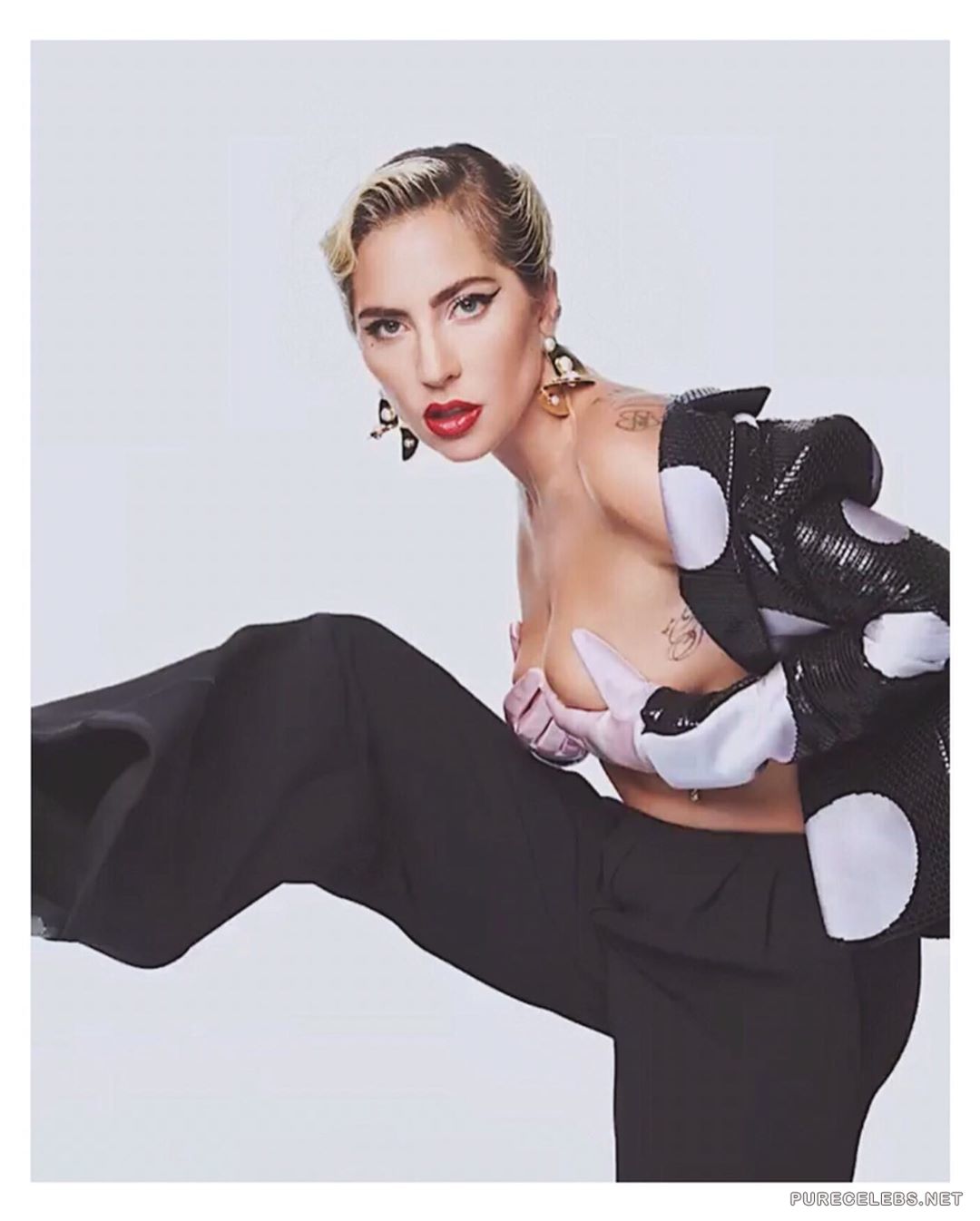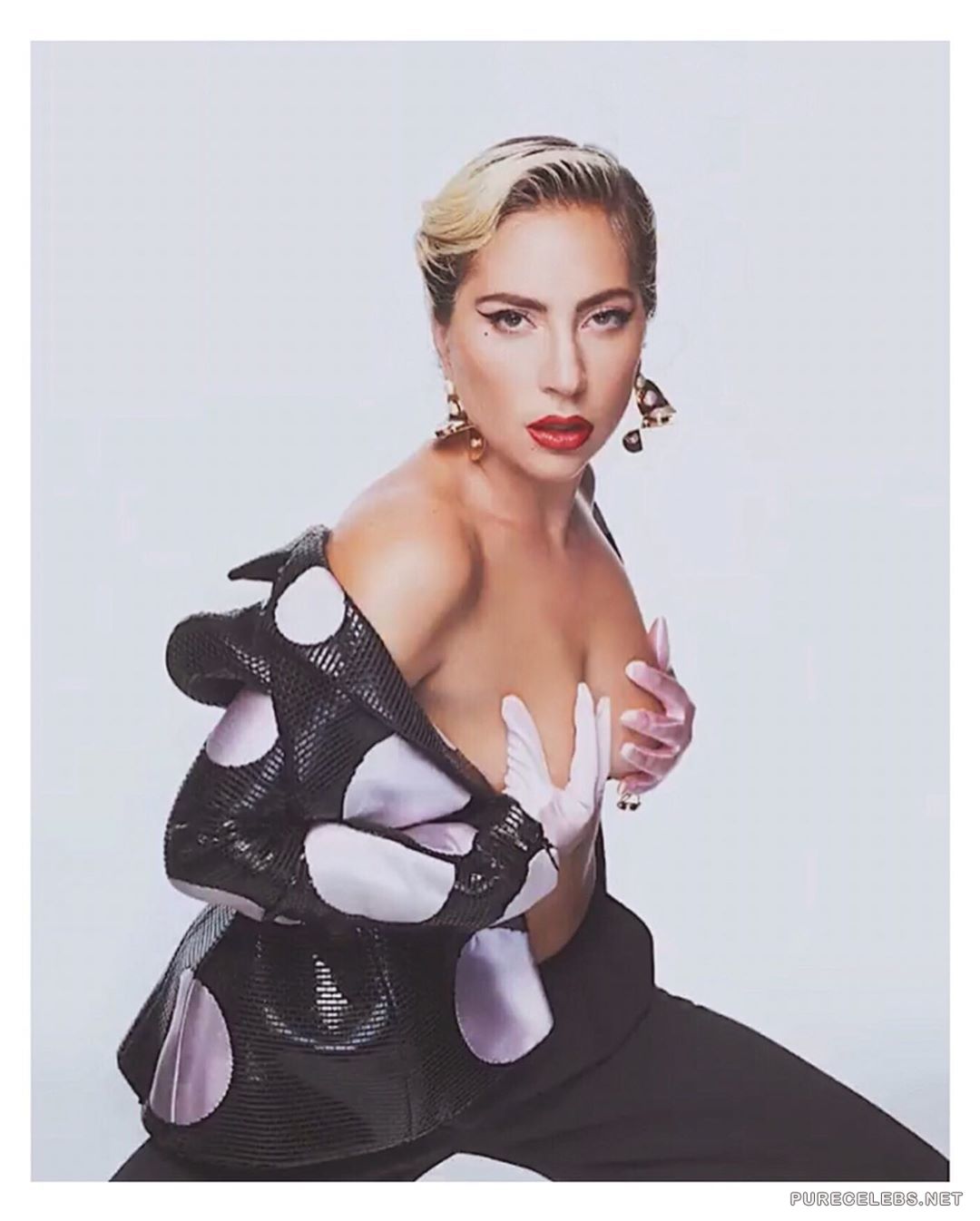 Everyone has long been accustomed to the fact that the American singer Lady Gaga is an incredibly shocking and scandalous celebrity. In addition, this girl is also very sexy, as you can see by looking at her photos that have recently hit the net. On them a charming blonde poses in an open jacket on her naked body. The star covers her juicy boobs with white gloves in her hands and it looks very seductive!