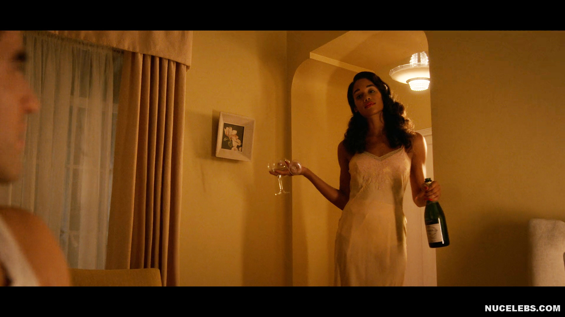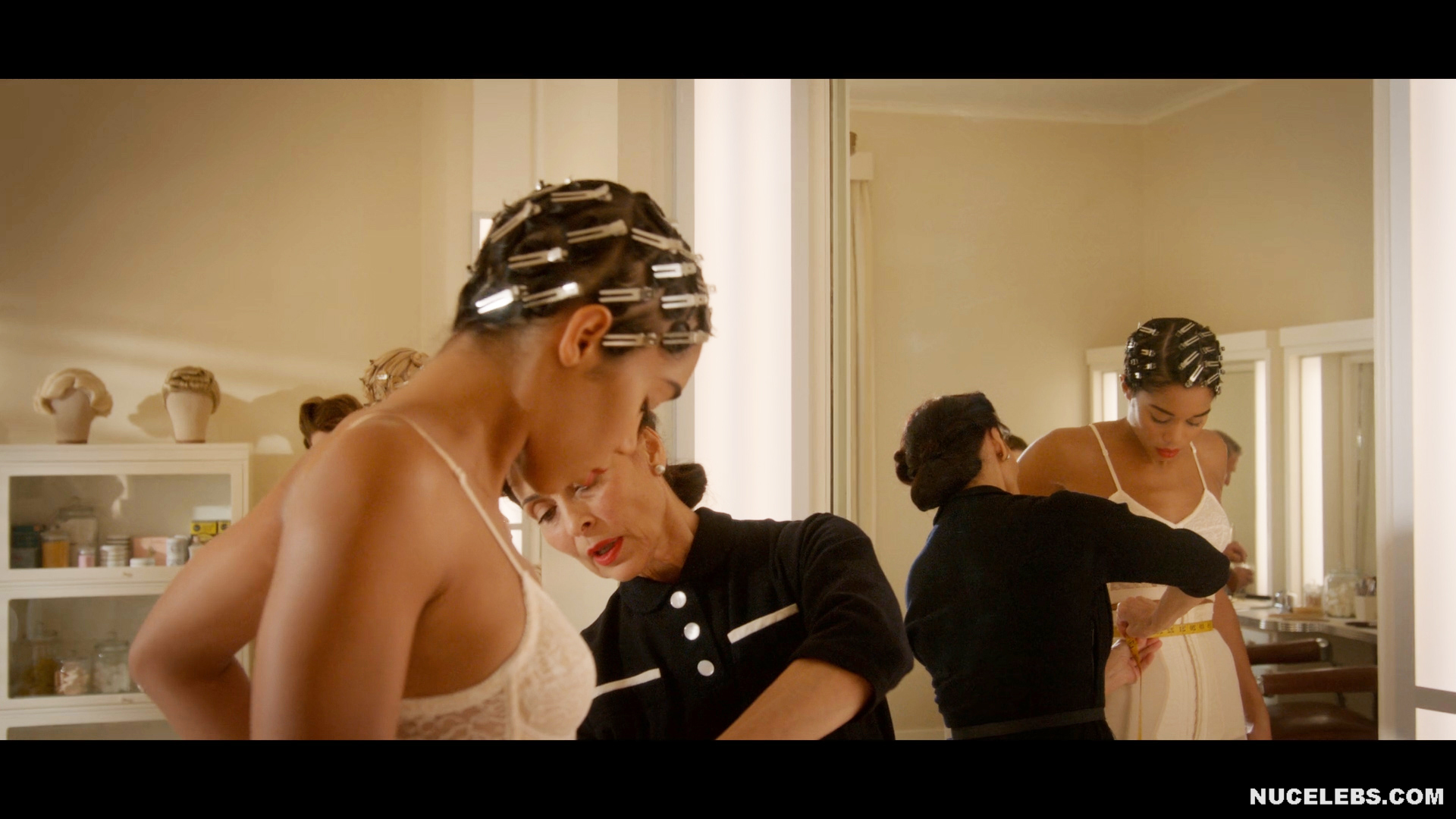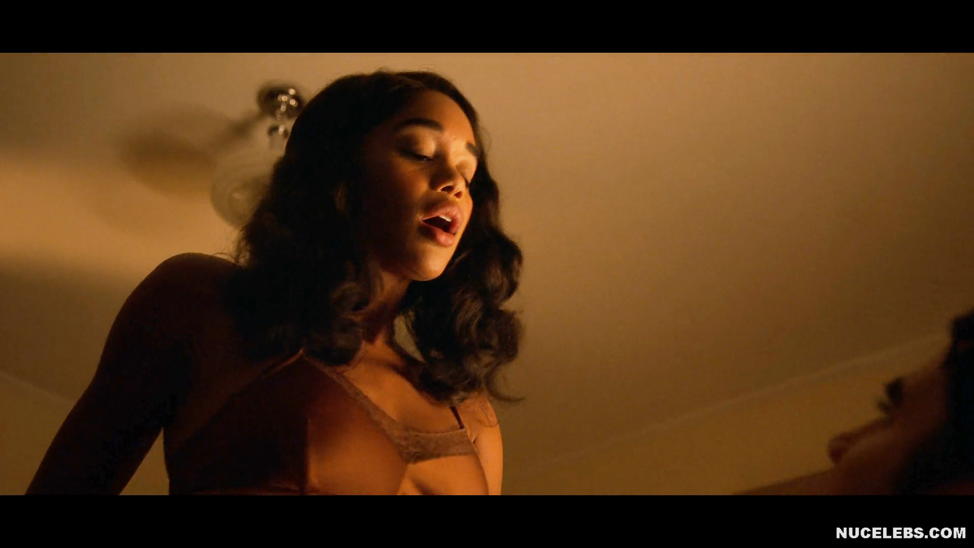 Actress Laura Harrier, 31, did a stunning striptease on the Hollywood miniseries. At first, this girl was dressed in a long nightgown, which she threw off during the dance. After that, this beauty was in stockings, panties and a bra. She so confidently began to seduce the guy that he could not resist her. And in another scene, Laura Harrier nude had cowgirl sex with a guy. You could also see Laura Harrier nude boobs with small nipples as she splashed in the bubble bath.