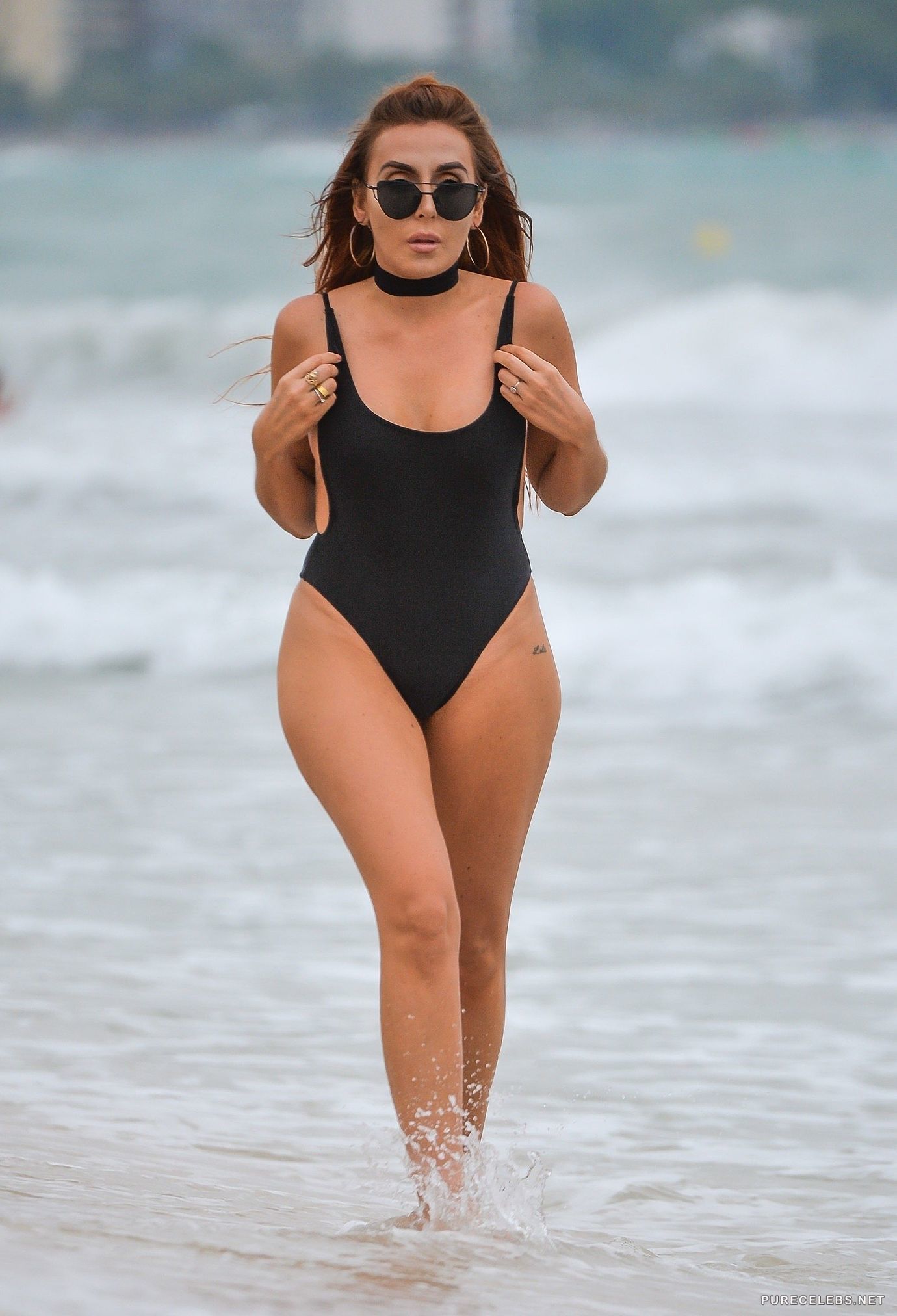 Football player Wayne Rooney’s drunk night out made party girl Laura Simpson famous and now the paparazzi just can’t get enough of this sexy brunette. She was recently photographed at the beach in a tiny black thong swimsuit. Laura invested considerable effort into repeatedly adjusting her outfit so as not to expose her nipples and pussy. The best part of these candid photos are definitely the shots of Laura’s plump ass.