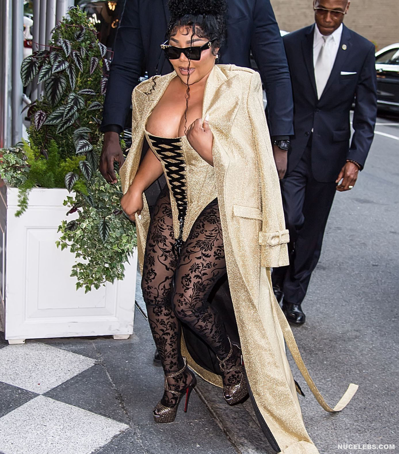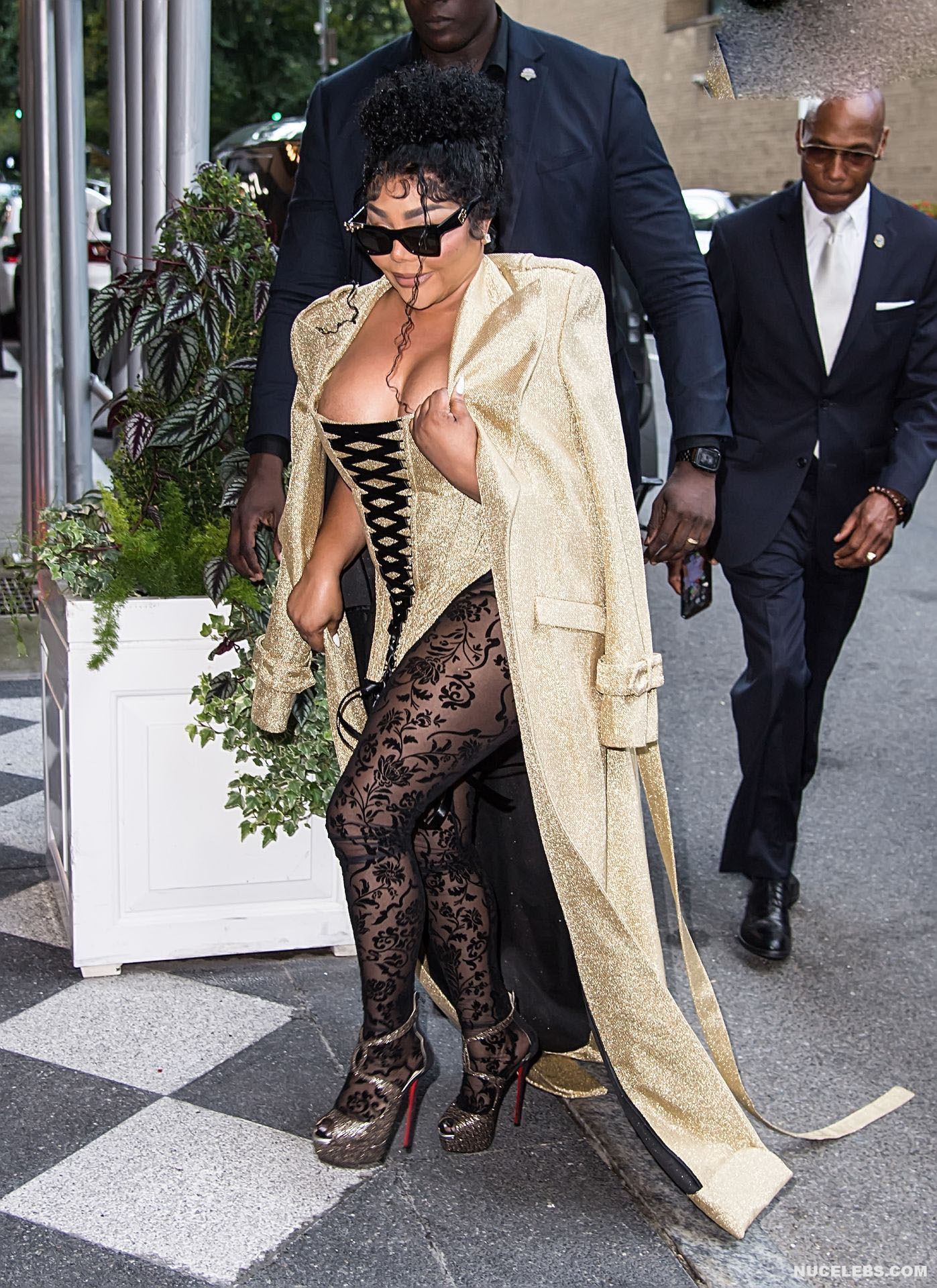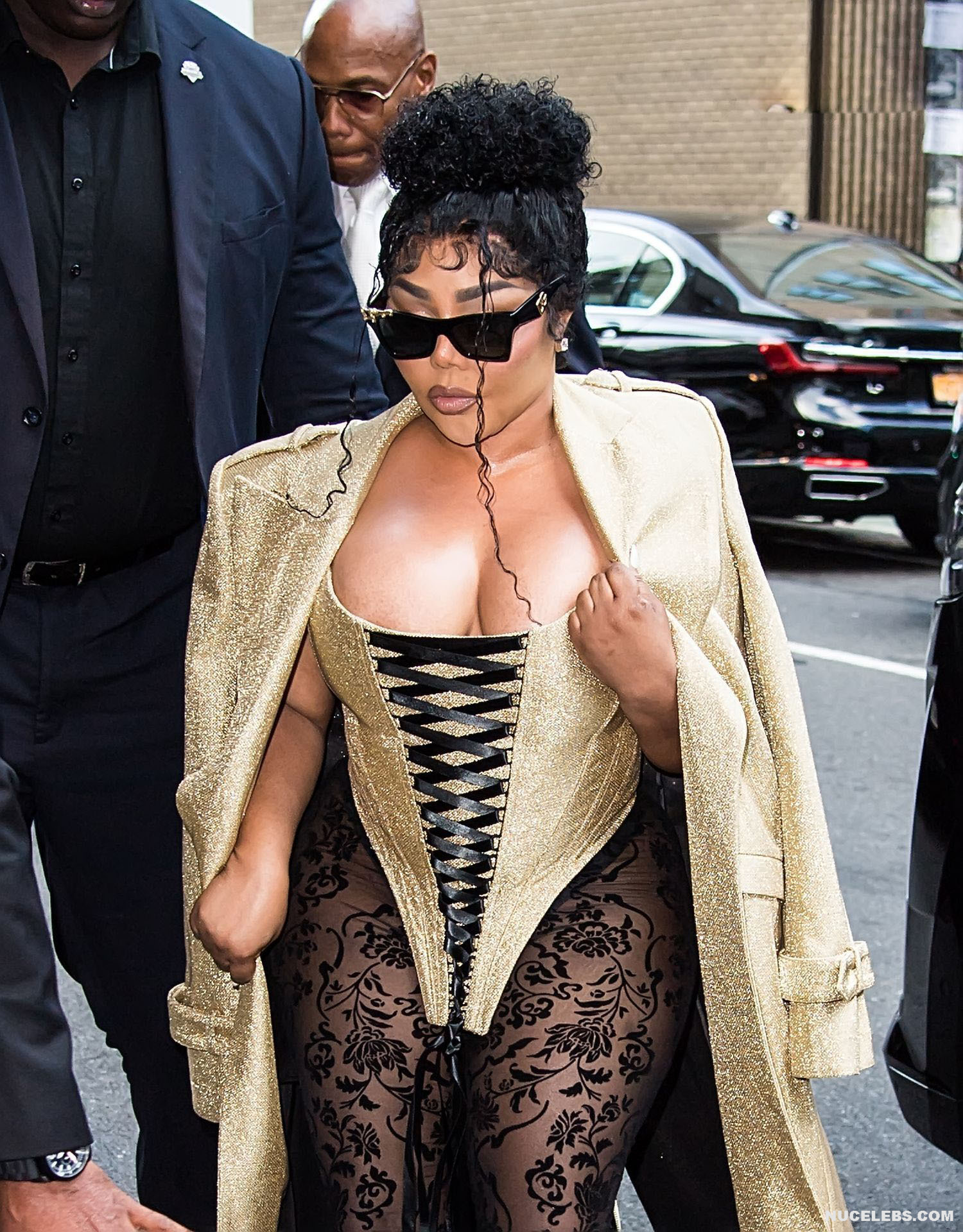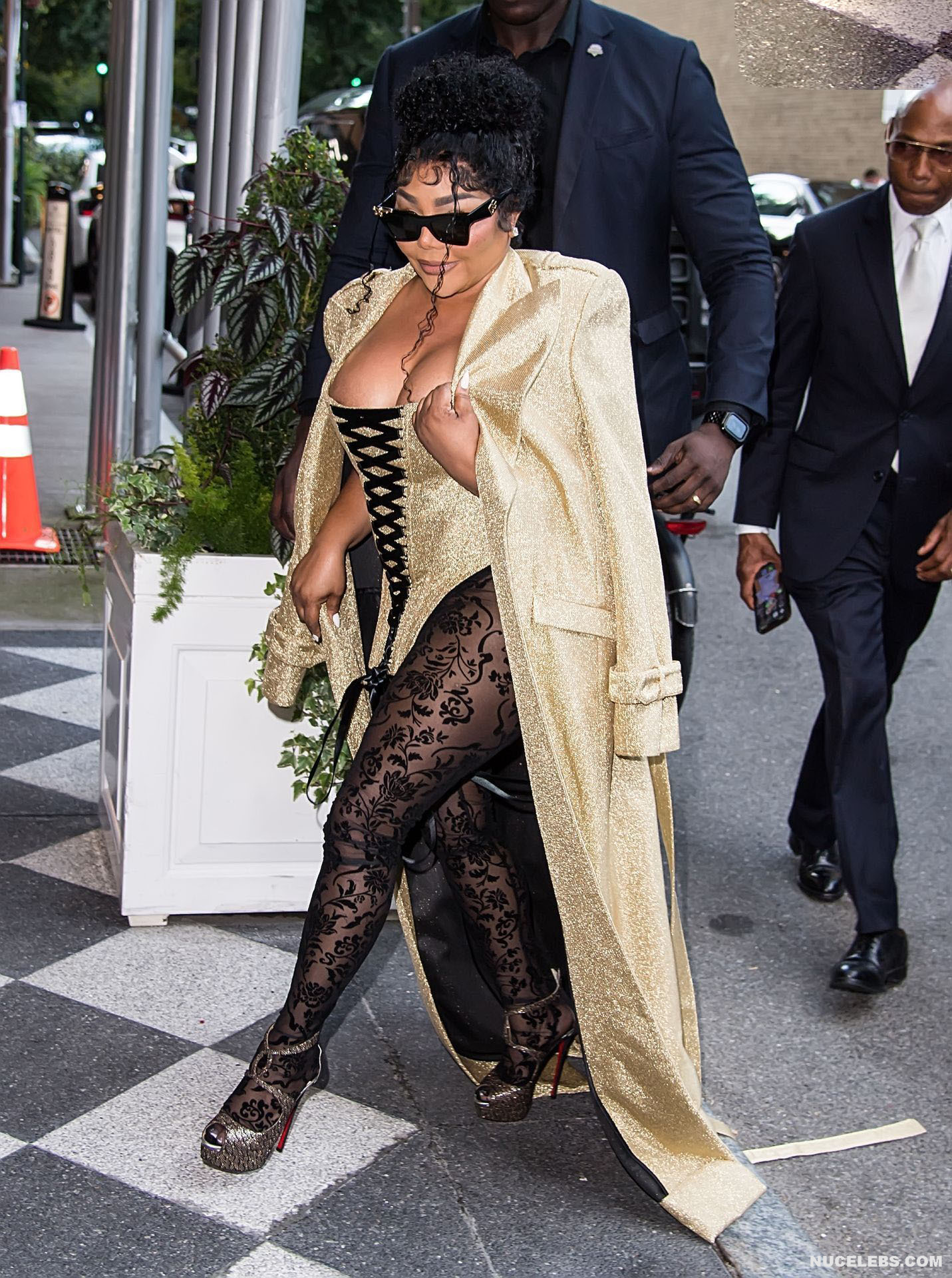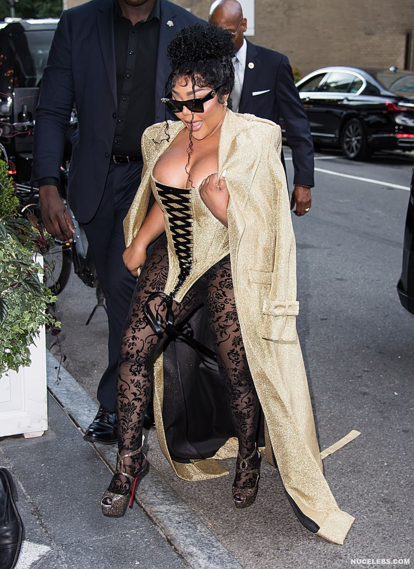 Lil Kim’s charm is undeniable, and she moves with an elegance that leaves everyone in awe. When this singer appeared on the street in a corset, black fantasy tights, and a long golden coat, she made everyone turn around. Her perfectly styled hair added to her captivating allure. However, what attracted the most attention was Lil Kim’s huge juicy tits, the nipples of which slipped out for a moment!