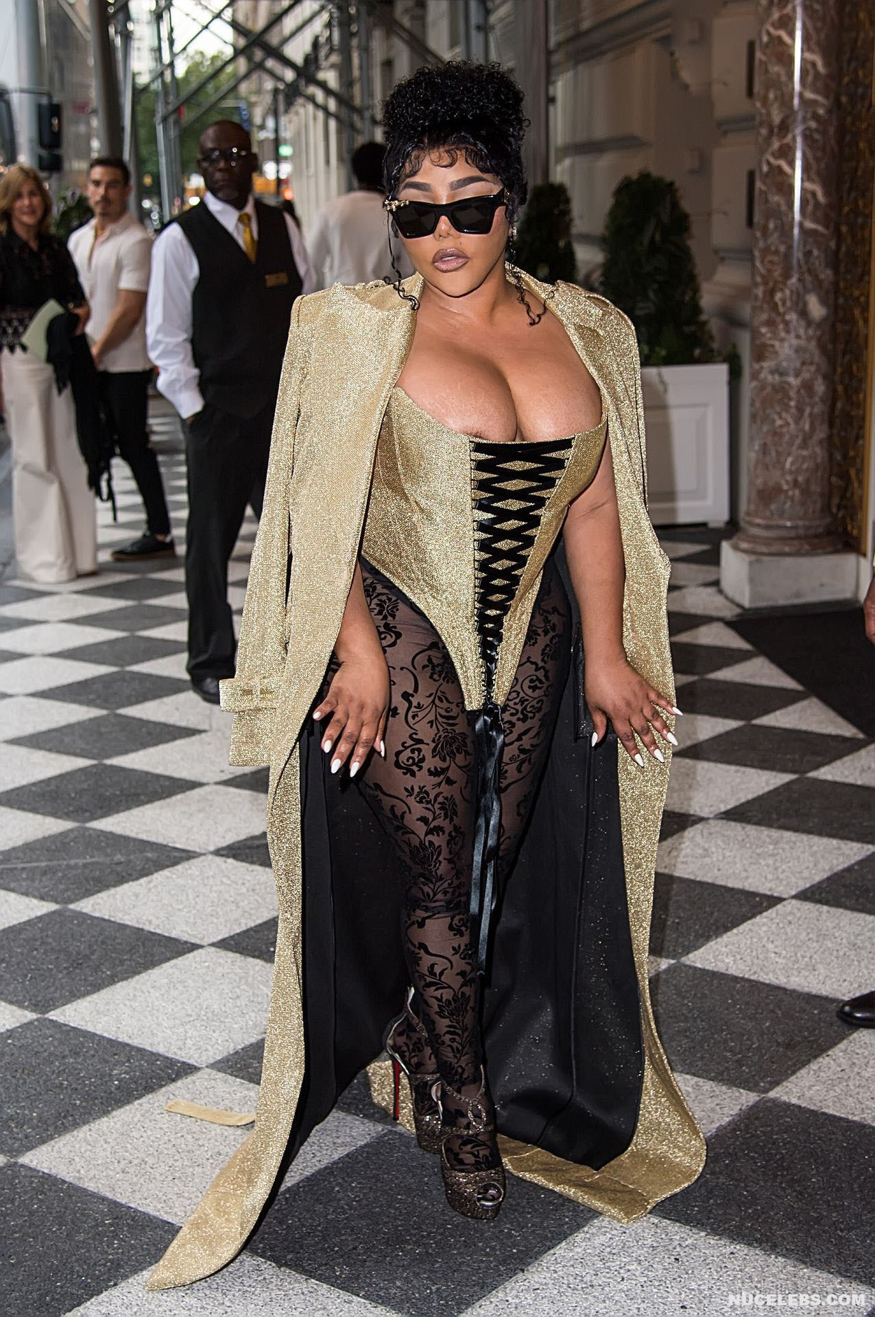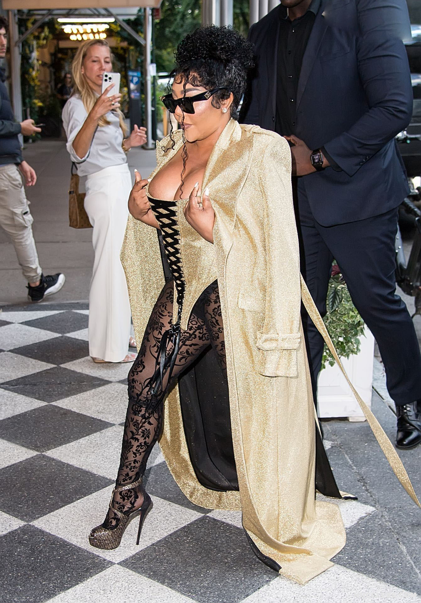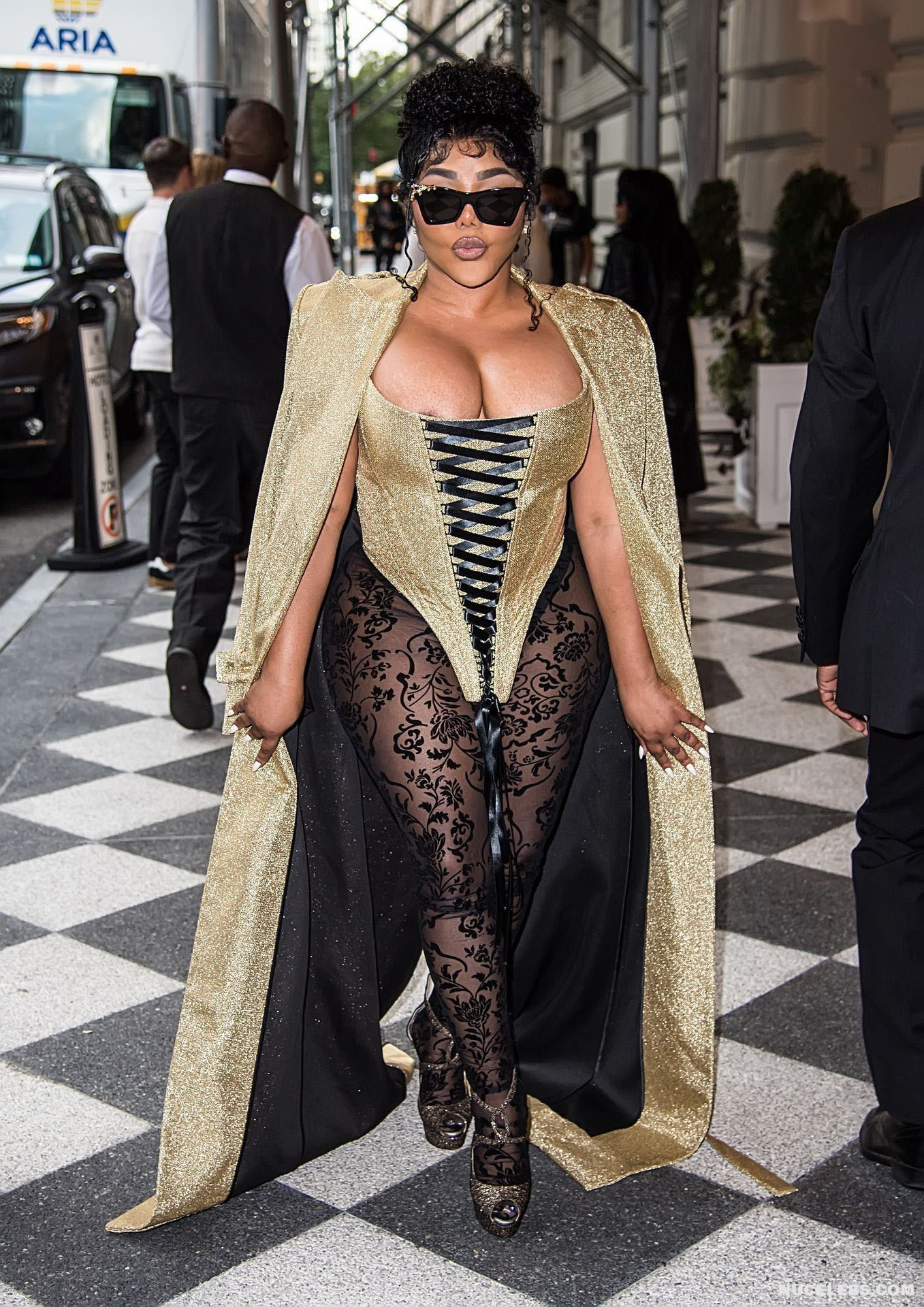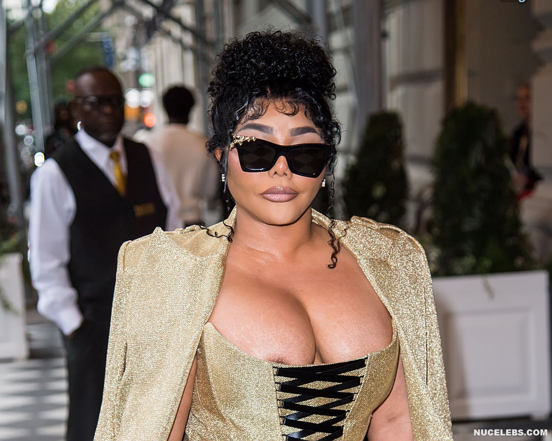 Lil Kim’s charm is undeniable, and she moves with an elegance that leaves everyone in awe. When this singer appeared on the street in a corset, black fantasy tights, and a long golden coat, she made everyone turn around. Her perfectly styled hair added to her captivating allure. However, what attracted the most attention was Lil Kim’s huge juicy tits, the nipples of which slipped out for a moment!