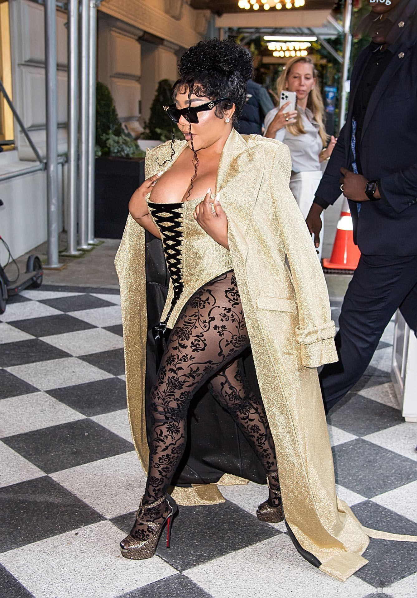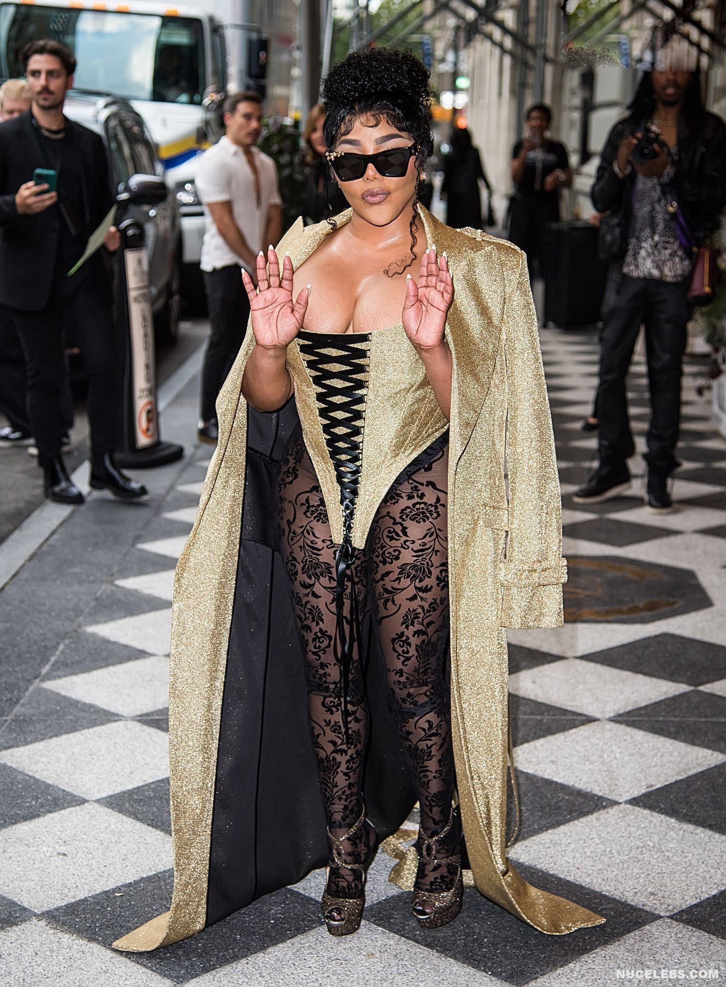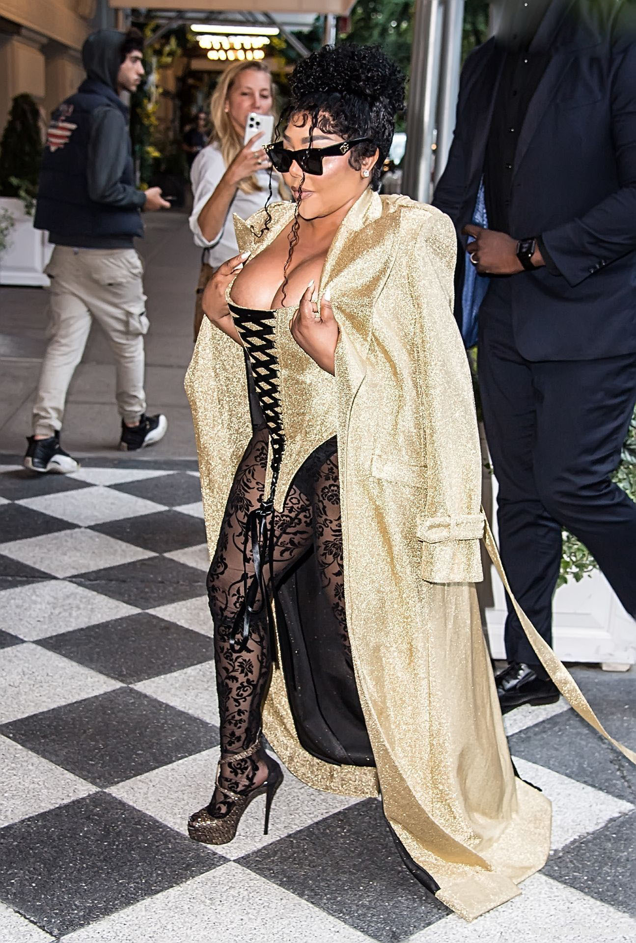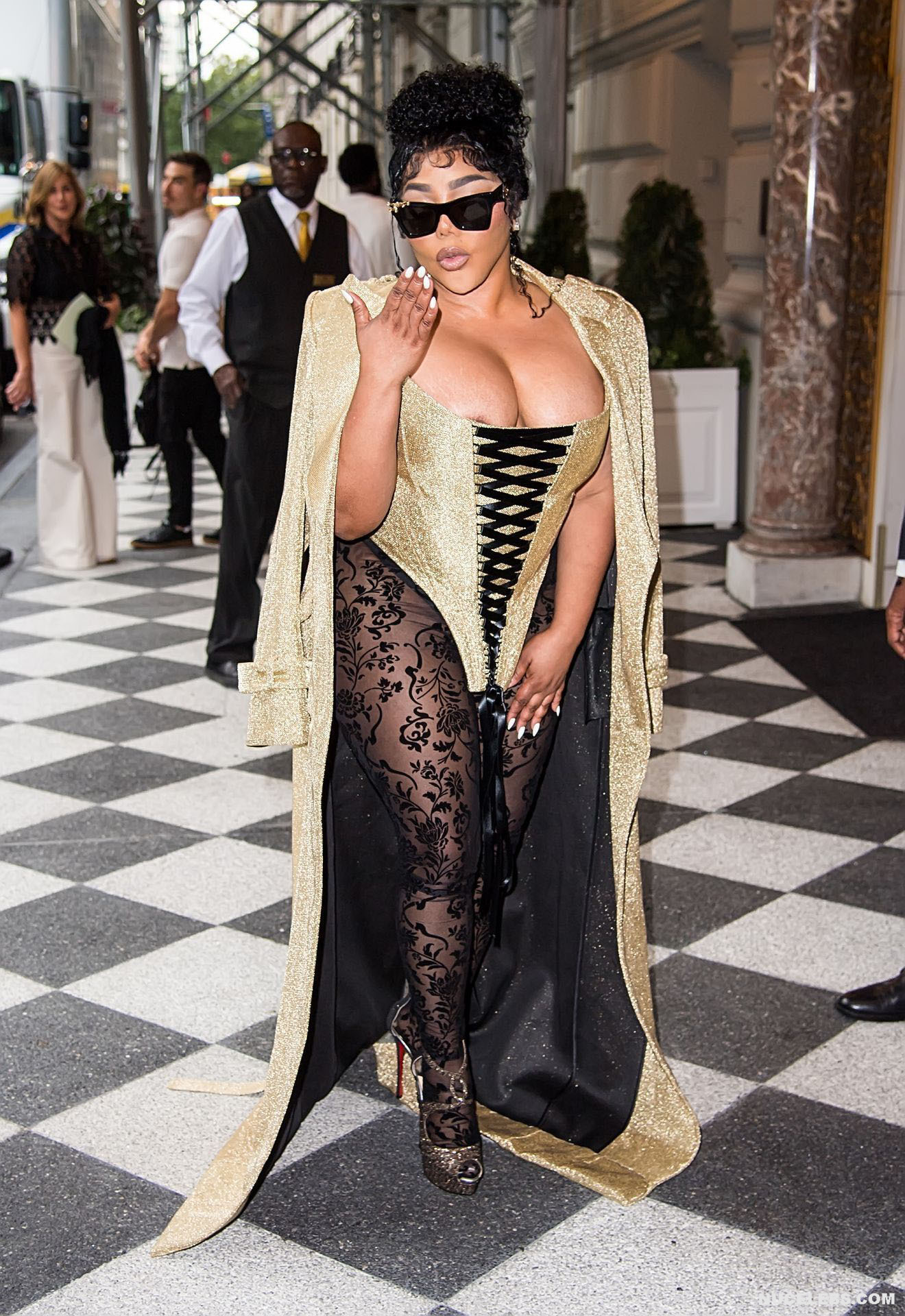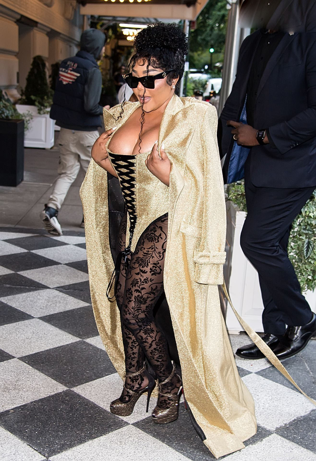 Lil Kim’s charm is undeniable, and she moves with an elegance that leaves everyone in awe. When this singer appeared on the street in a corset, black fantasy tights, and a long golden coat, she made everyone turn around. Her perfectly styled hair added to her captivating allure. However, what attracted the most attention was Lil Kim’s huge juicy tits, the nipples of which slipped out for a moment!