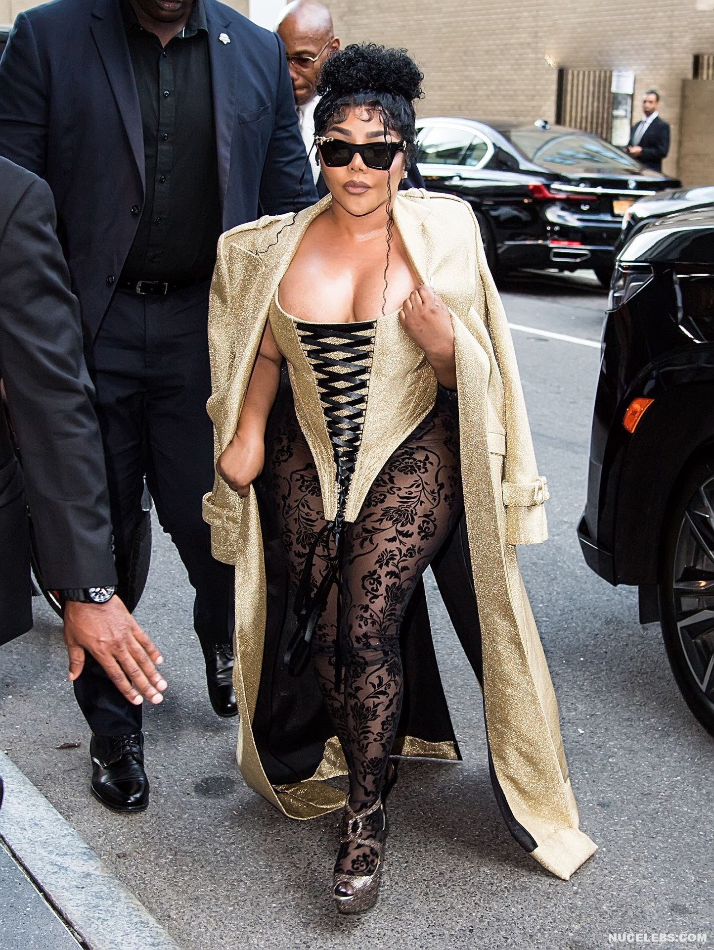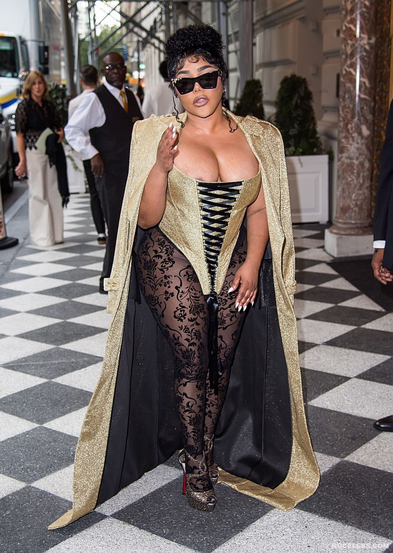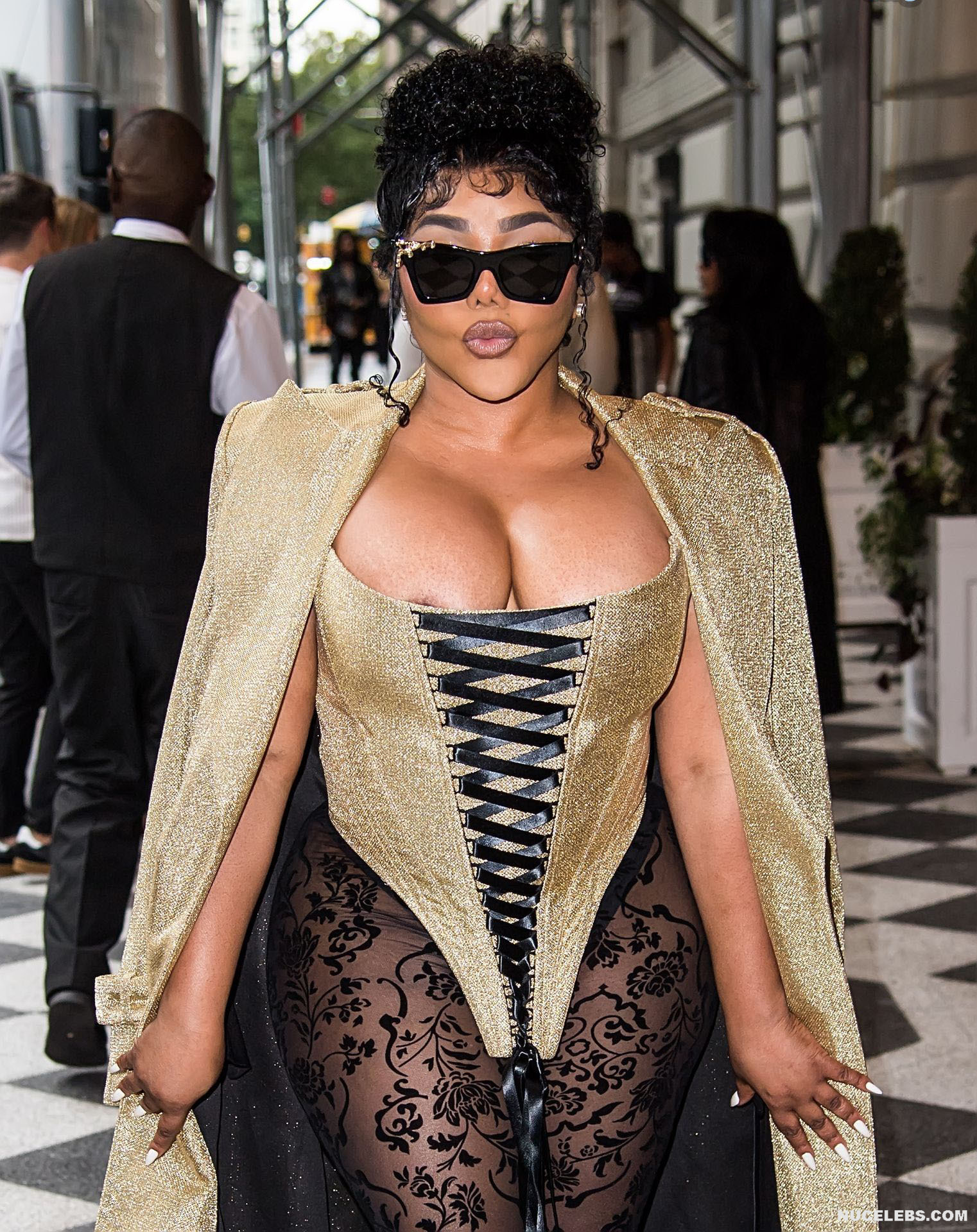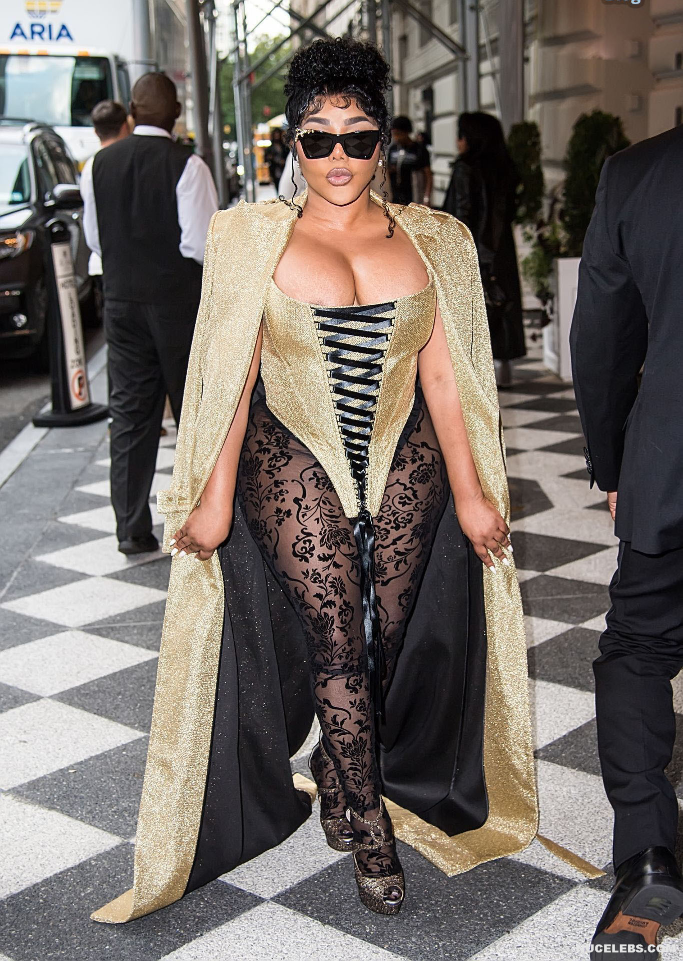 Lil Kim’s charm is undeniable, and she moves with an elegance that leaves everyone in awe. When this singer appeared on the street in a corset, black fantasy tights, and a long golden coat, she made everyone turn around. Her perfectly styled hair added to her captivating allure. However, what attracted the most attention was Lil Kim’s huge juicy tits, the nipples of which slipped out for a moment!