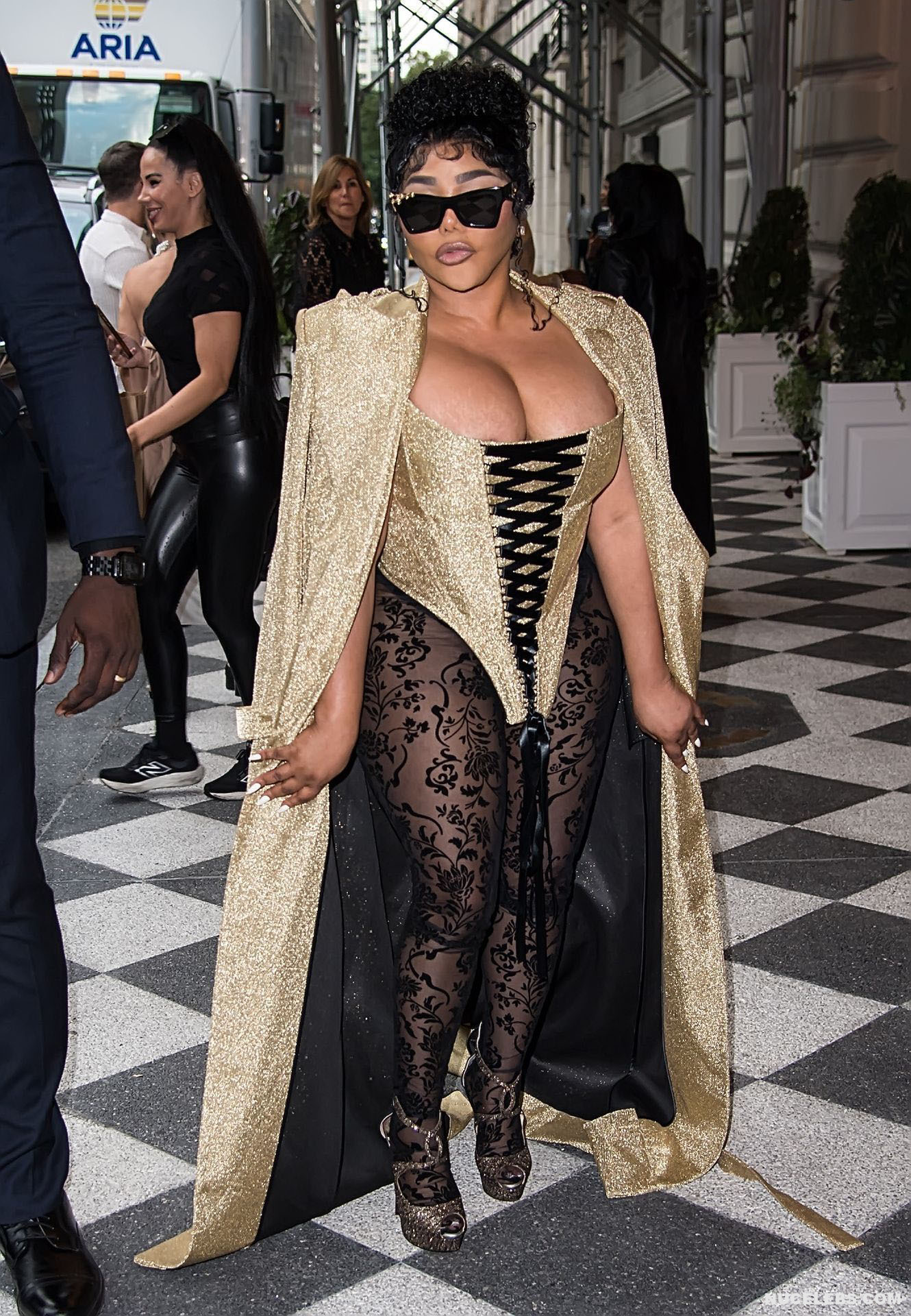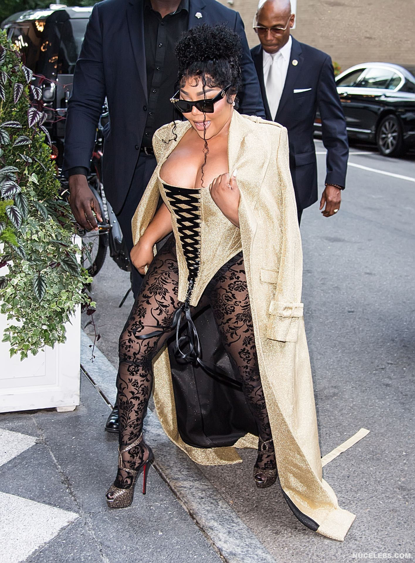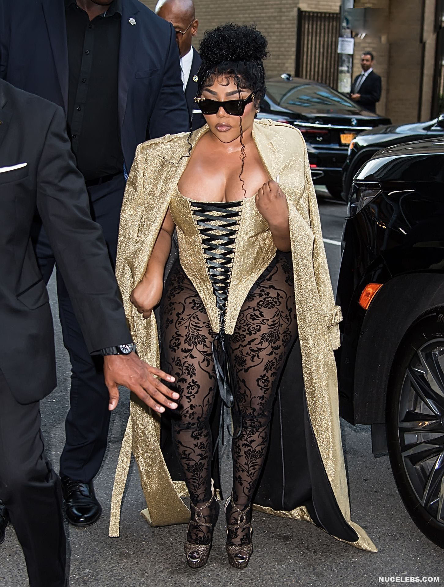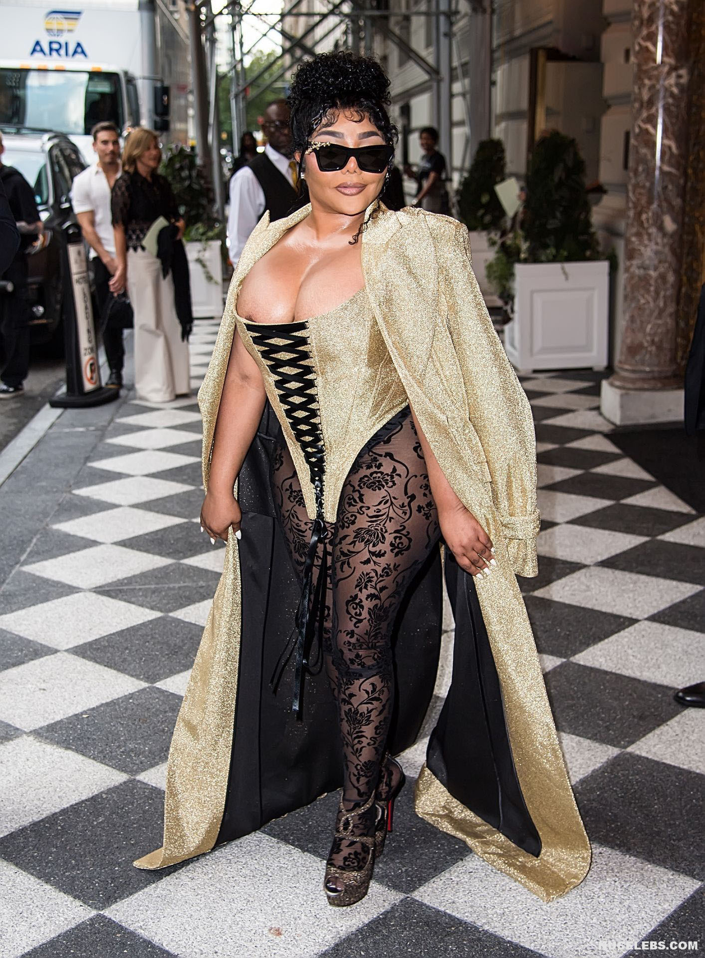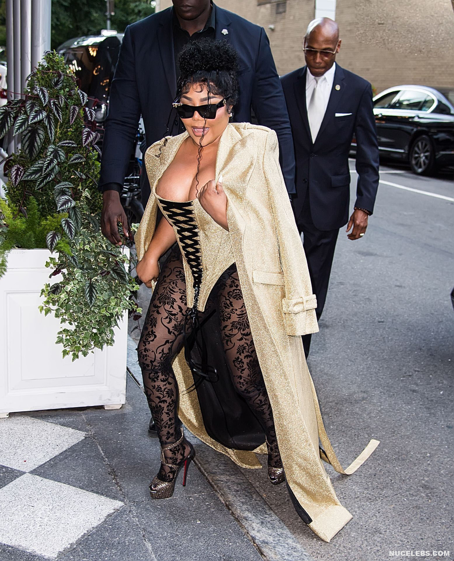 Lil Kim’s charm is undeniable, and she moves with an elegance that leaves everyone in awe. When this singer appeared on the street in a corset, black fantasy tights, and a long golden coat, she made everyone turn around. Her perfectly styled hair added to her captivating allure. However, what attracted the most attention was Lil Kim’s huge juicy tits, the nipples of which slipped out for a moment!