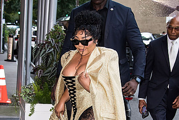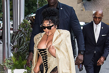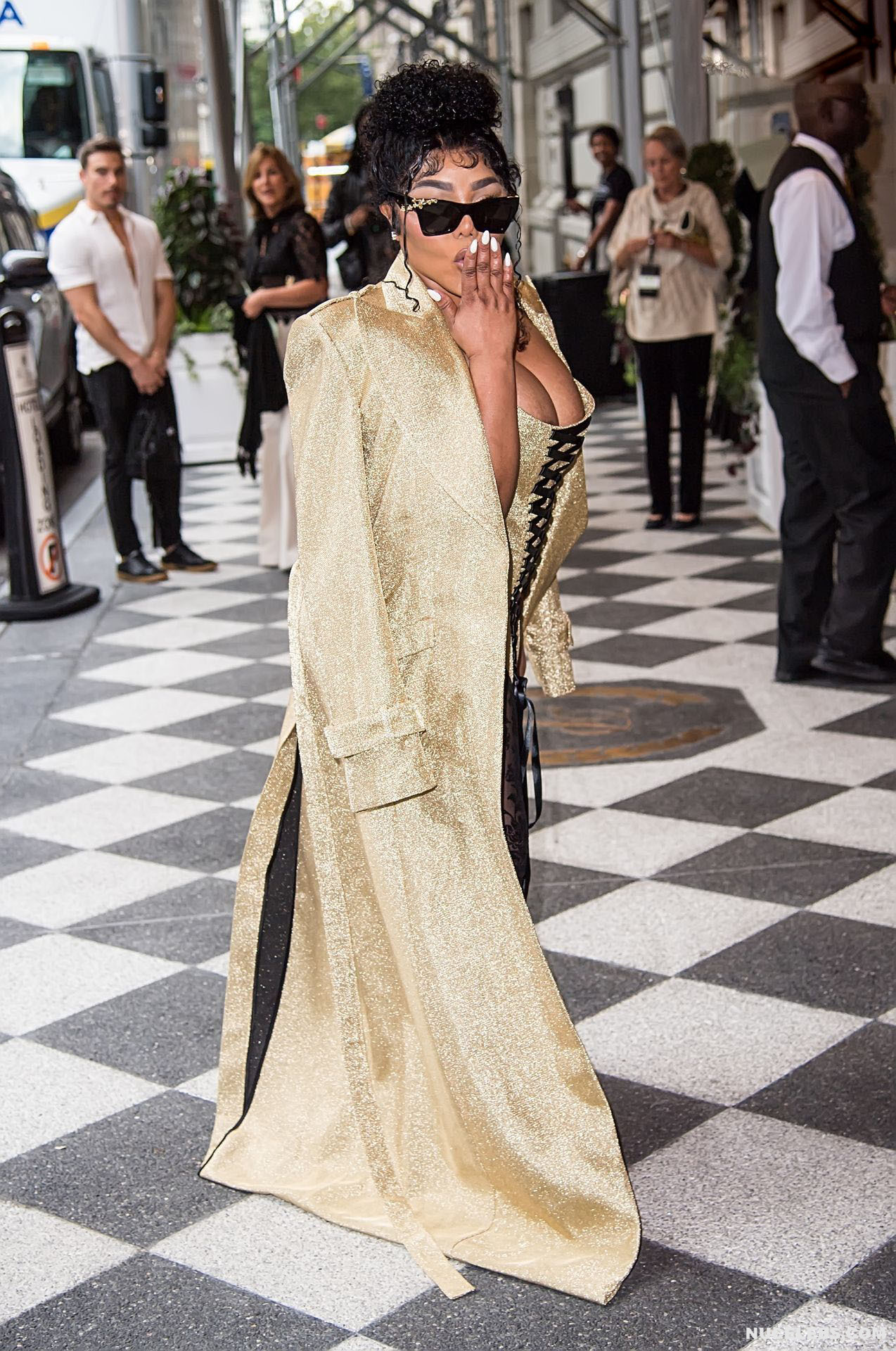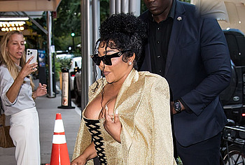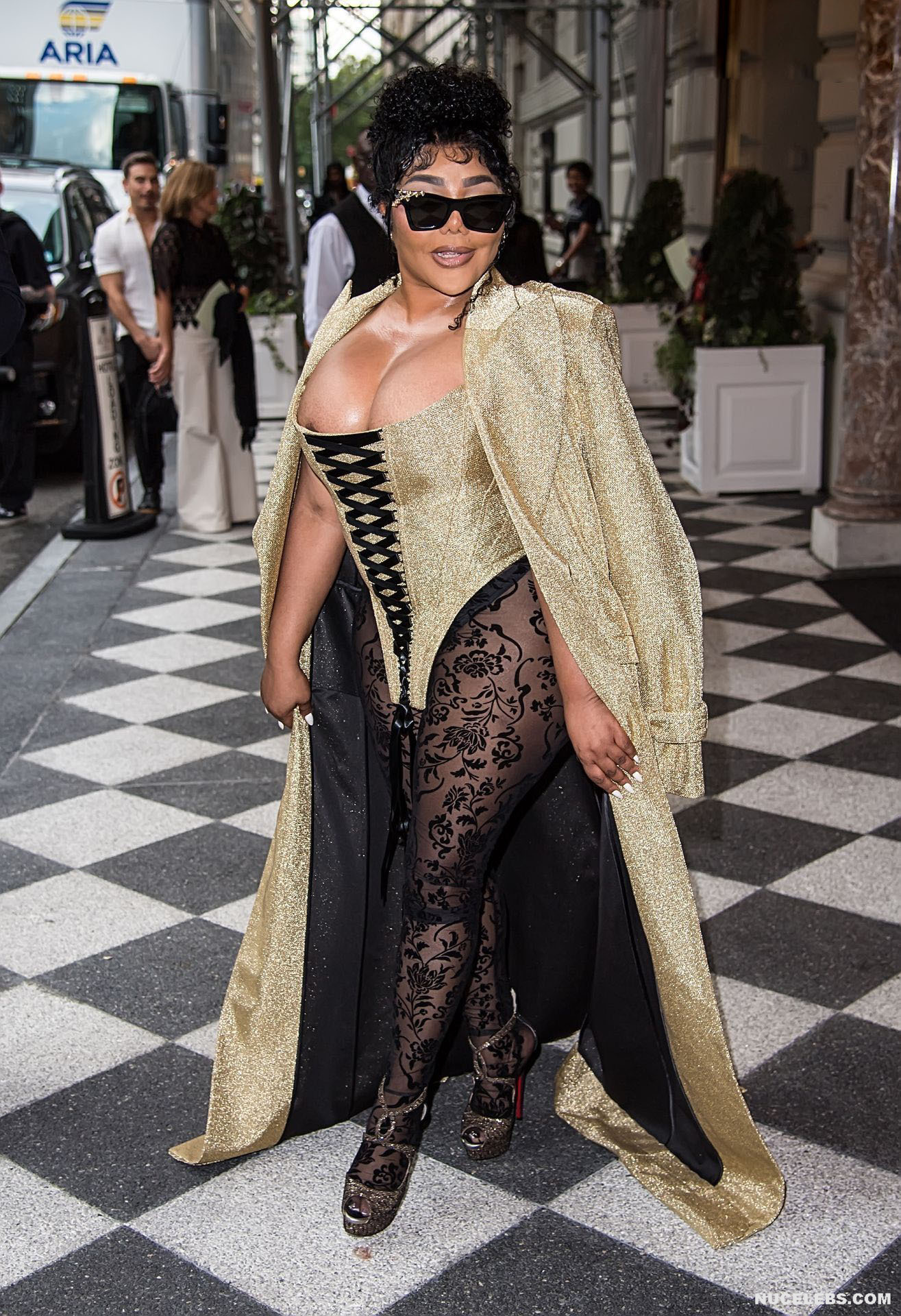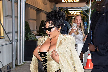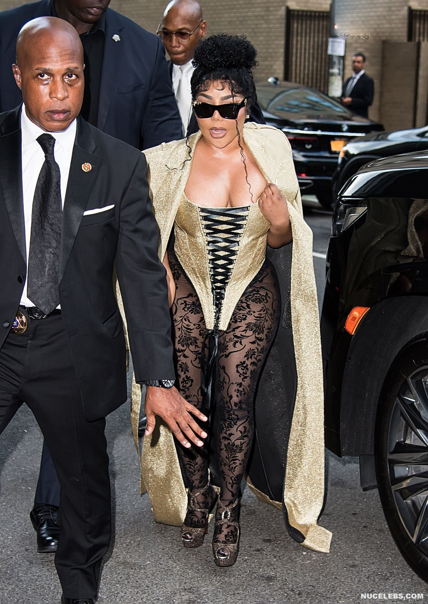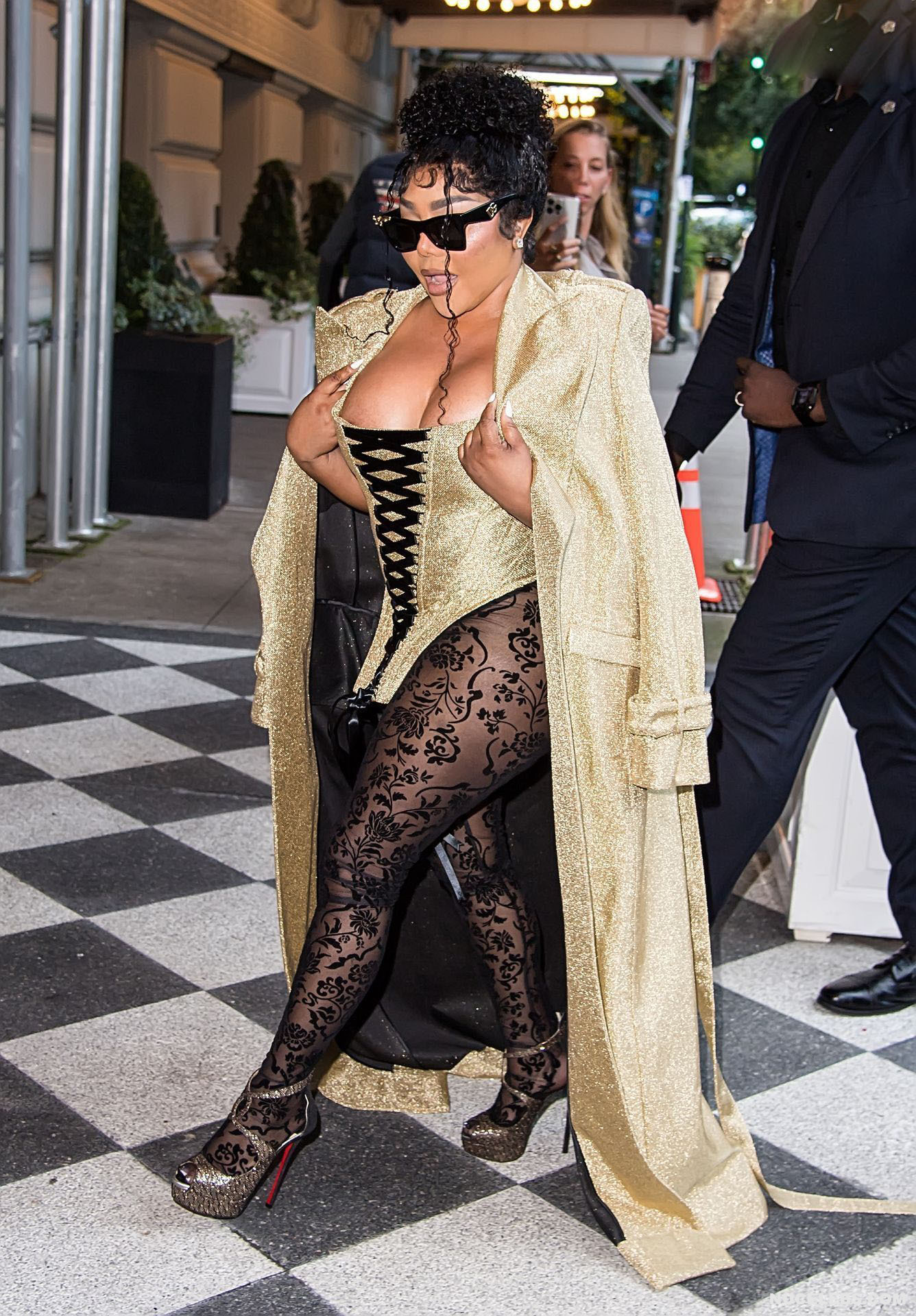 Lil Kim’s charm is undeniable, and she moves with an elegance that leaves everyone in awe. When this singer appeared on the street in a corset, black fantasy tights, and a long golden coat, she made everyone turn around. Her perfectly styled hair added to her captivating allure. However, what attracted the most attention was Lil Kim’s huge juicy tits, the nipples of which slipped out for a moment!