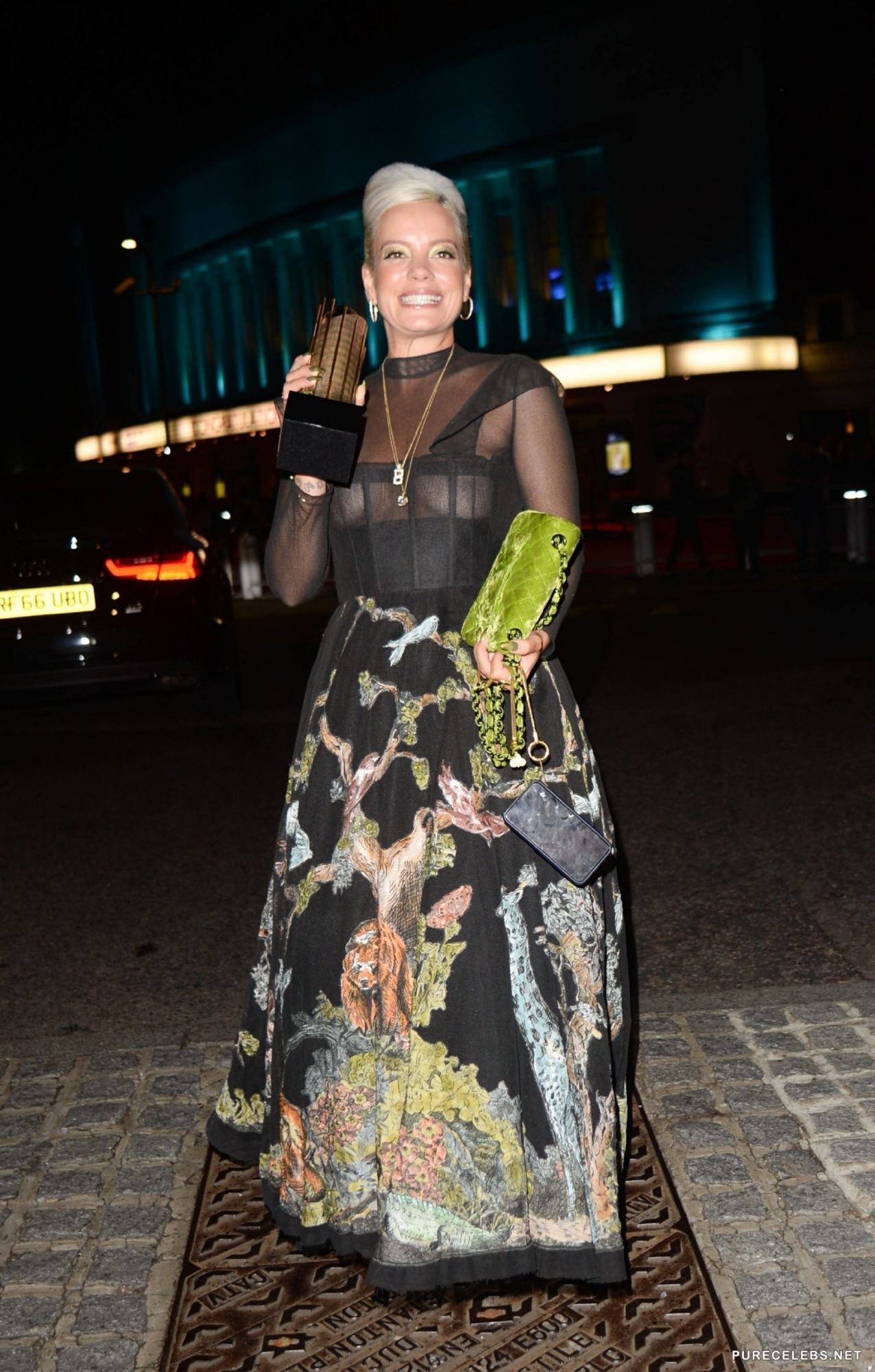 English singer and songwriter, Lily Allen is showing us her new trophy as well as her tits, in a black, see- through dress, along with a big, beautiful smile. We like the way she puts together color of her clothes with the pattern and most of all, we like the way her tits are displayed for us to admire, even though they are not big, they look just fine.