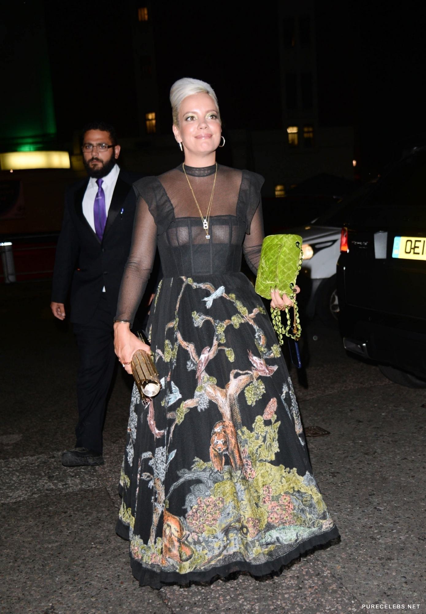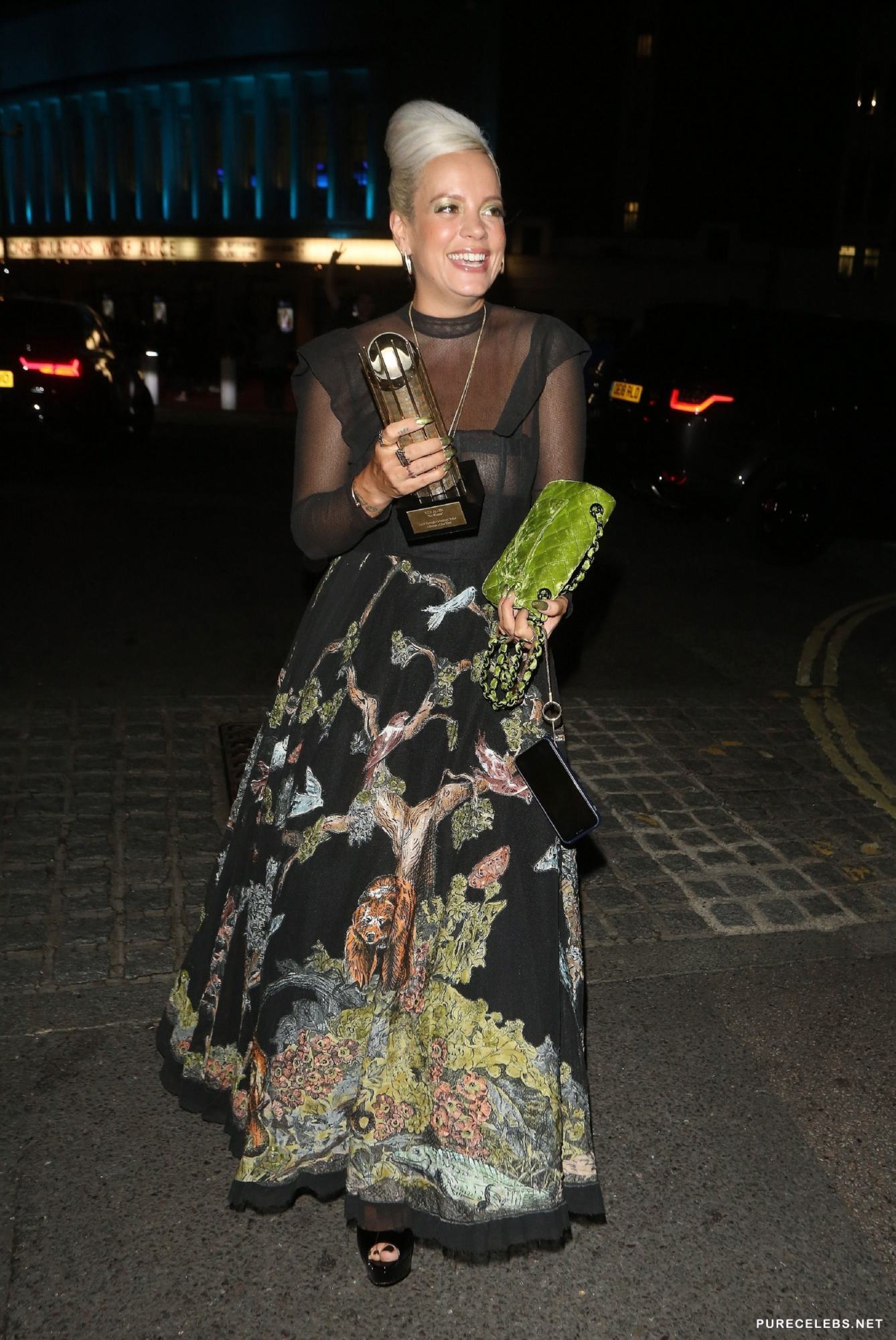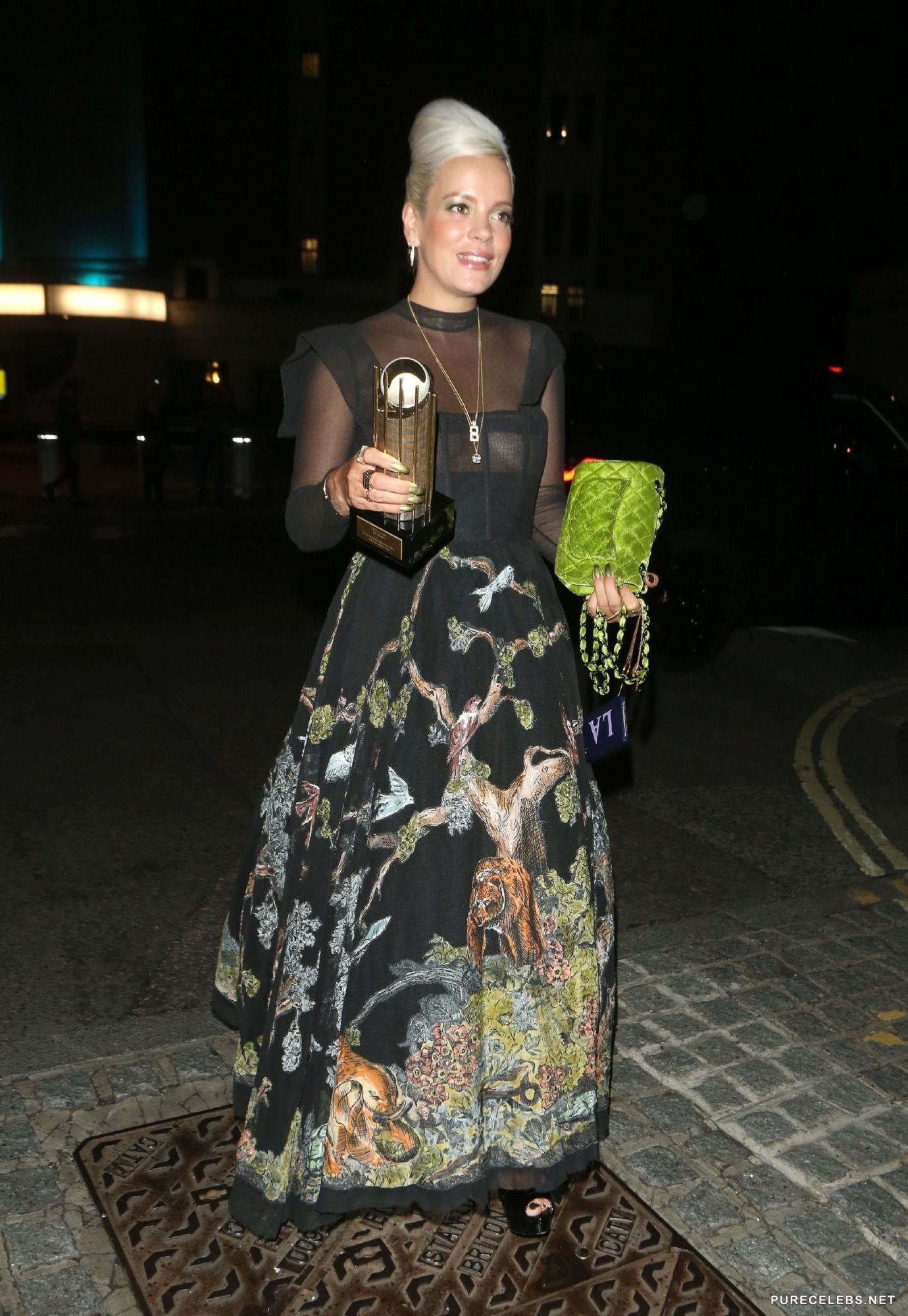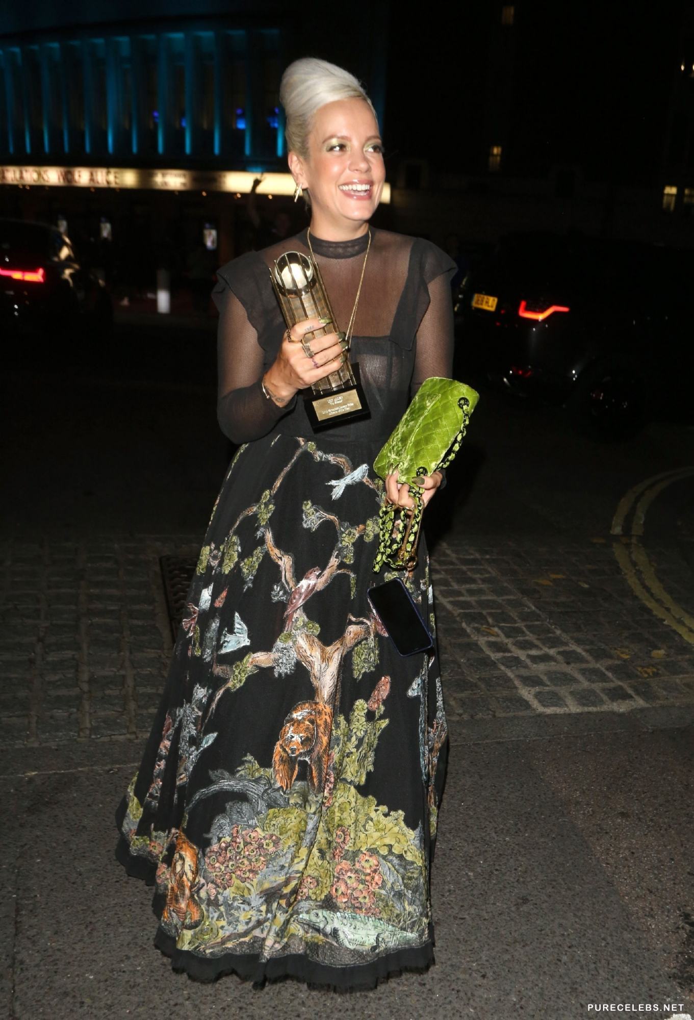 English singer and songwriter, Lily Allen is showing us her new trophy as well as her tits, in a black, see- through dress, along with a big, beautiful smile. We like the way she puts together color of her clothes with the pattern and most of all, we like the way her tits are displayed for us to admire, even though they are not big, they look just fine.