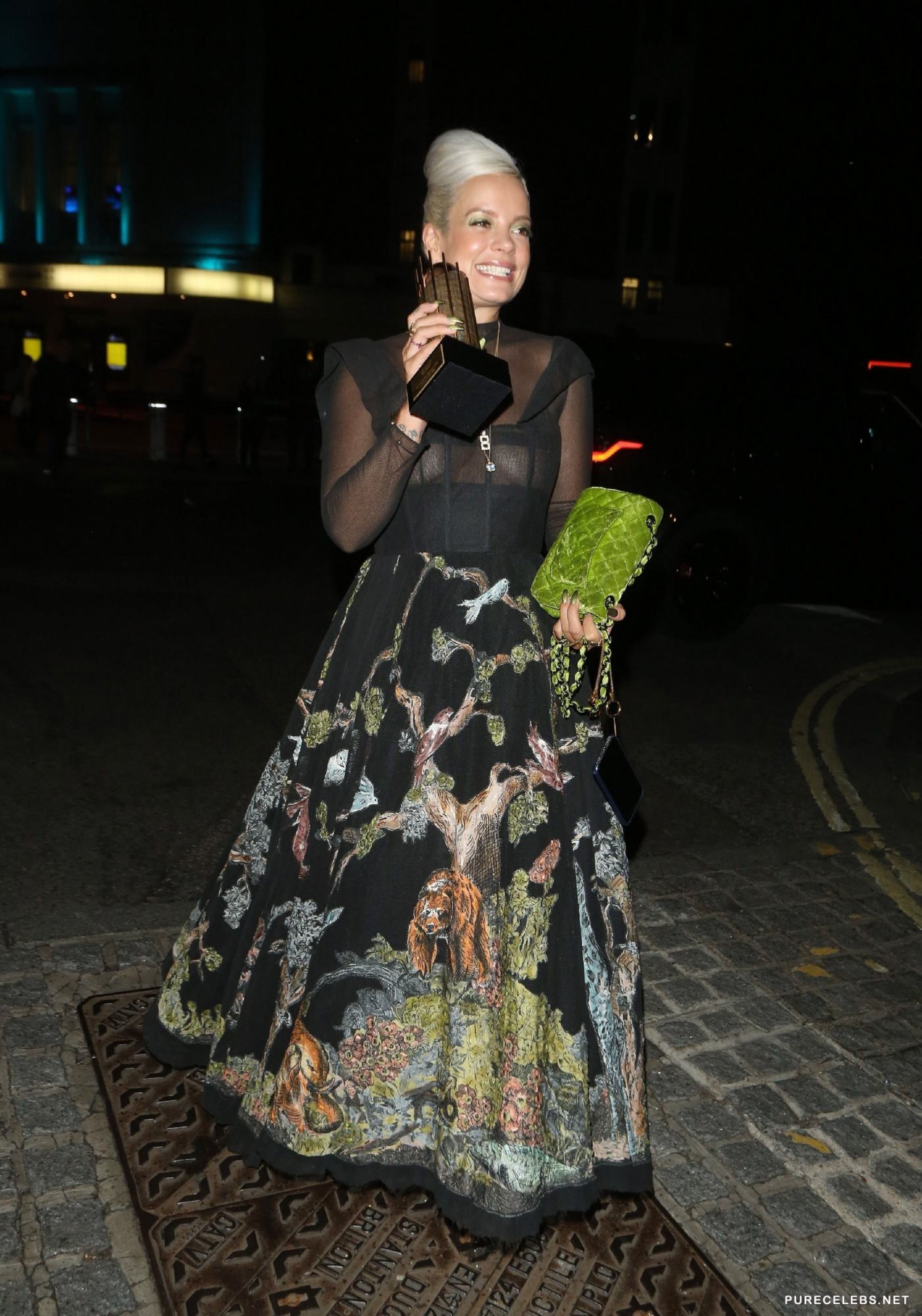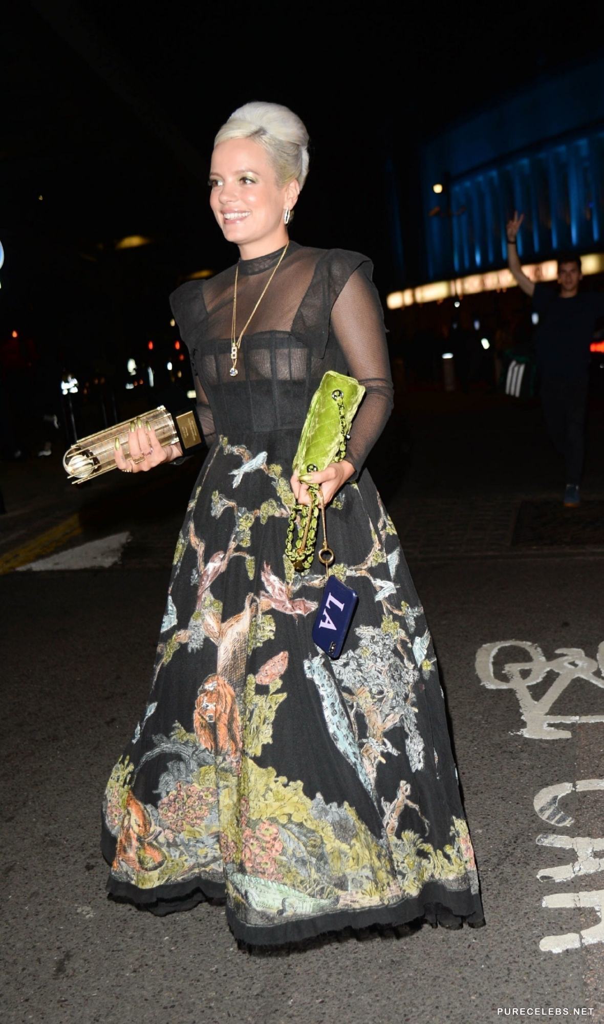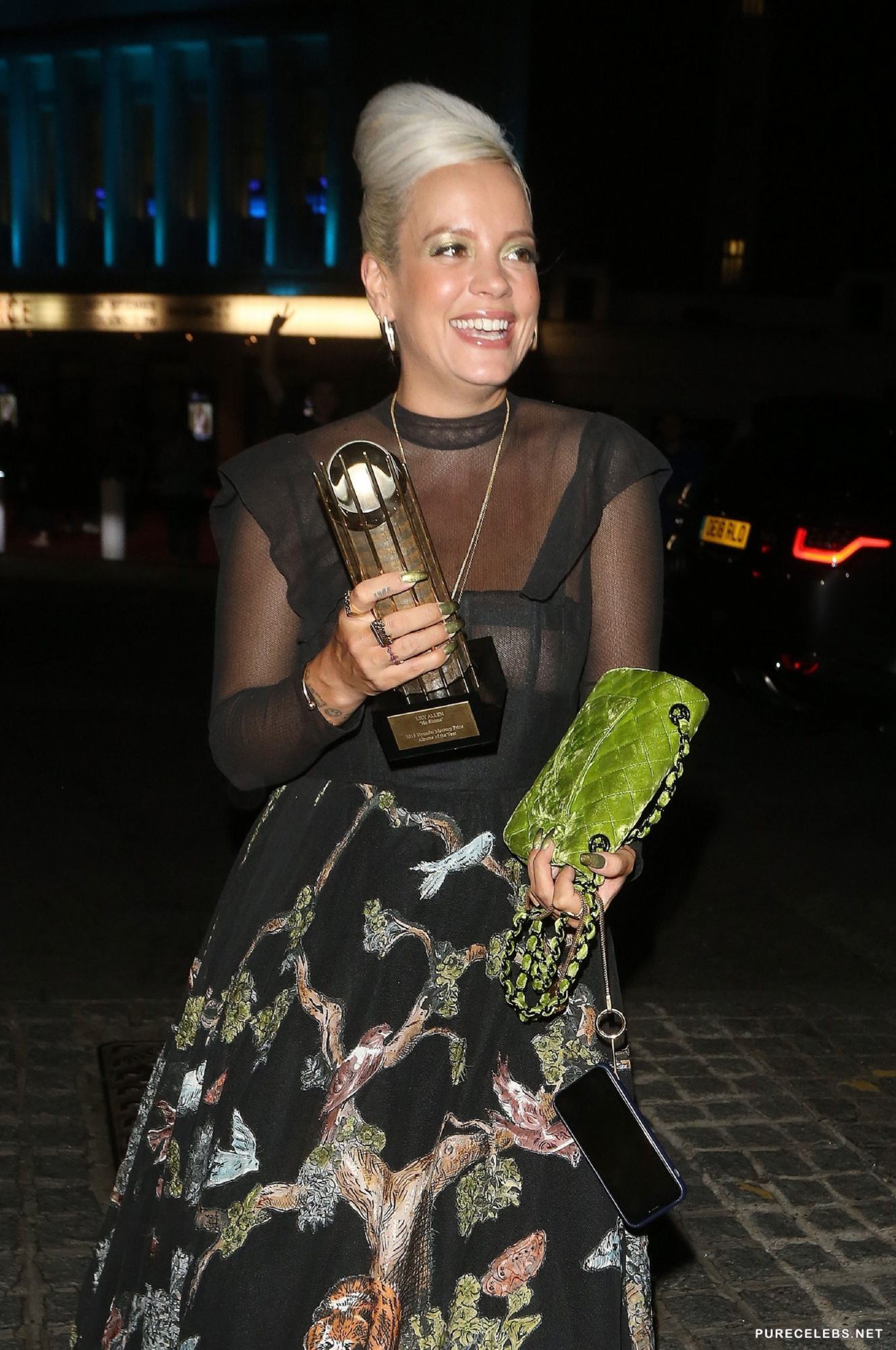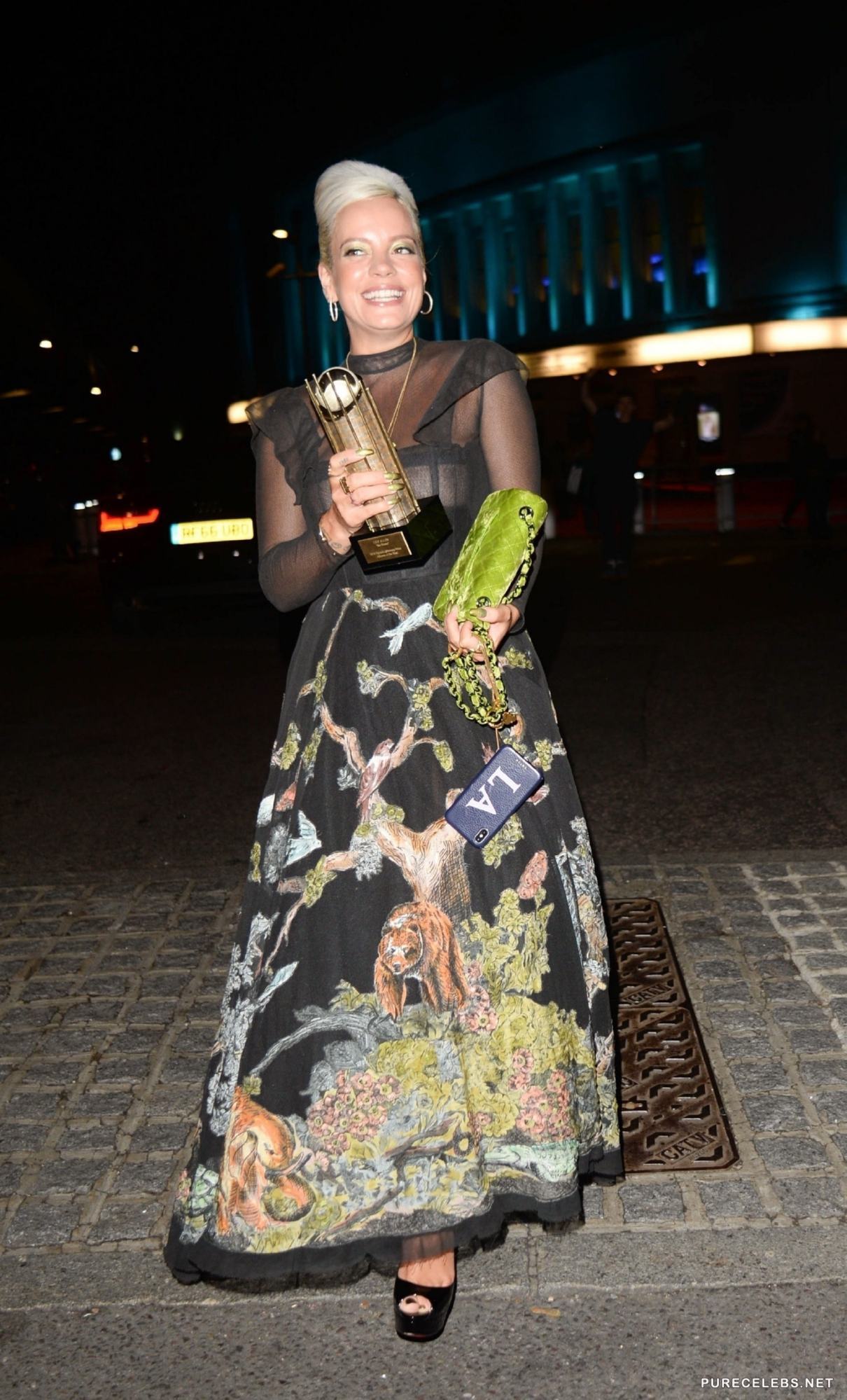 English singer and songwriter, Lily Allen is showing us her new trophy as well as her tits, in a black, see- through dress, along with a big, beautiful smile. We like the way she puts together color of her clothes with the pattern and most of all, we like the way her tits are displayed for us to admire, even though they are not big, they look just fine.
