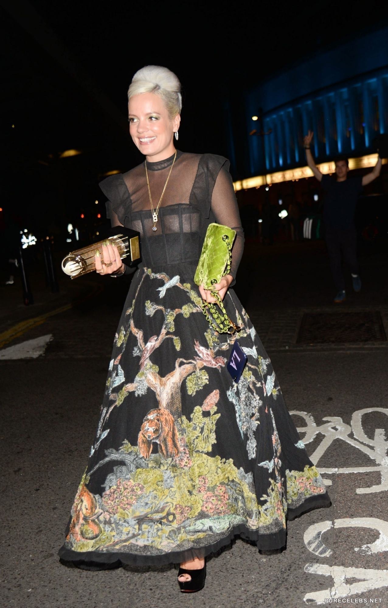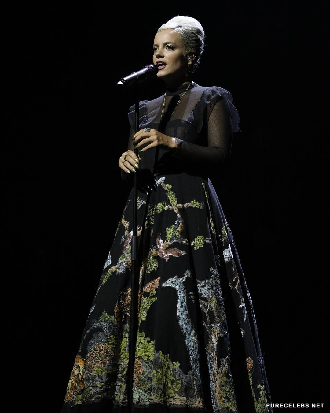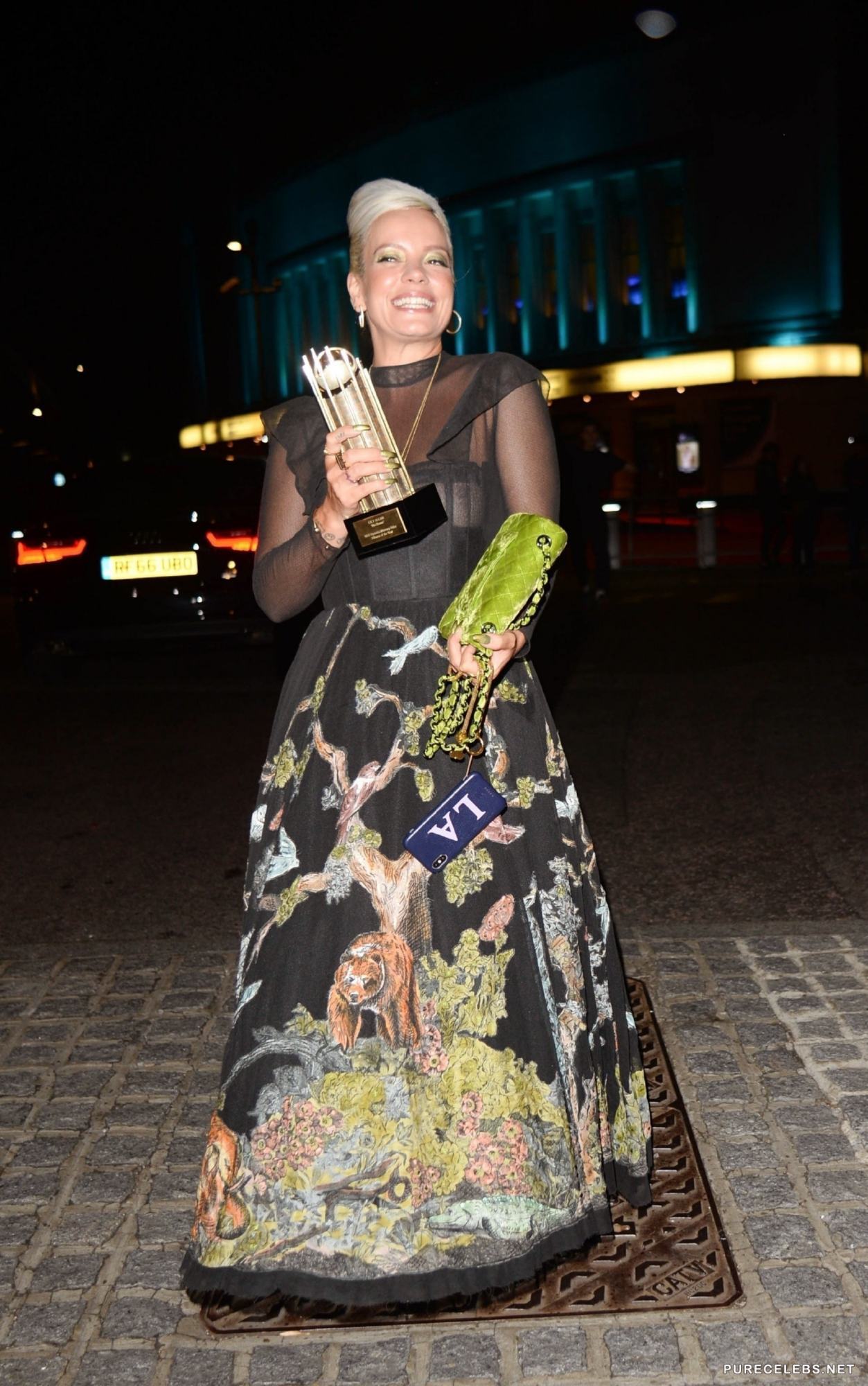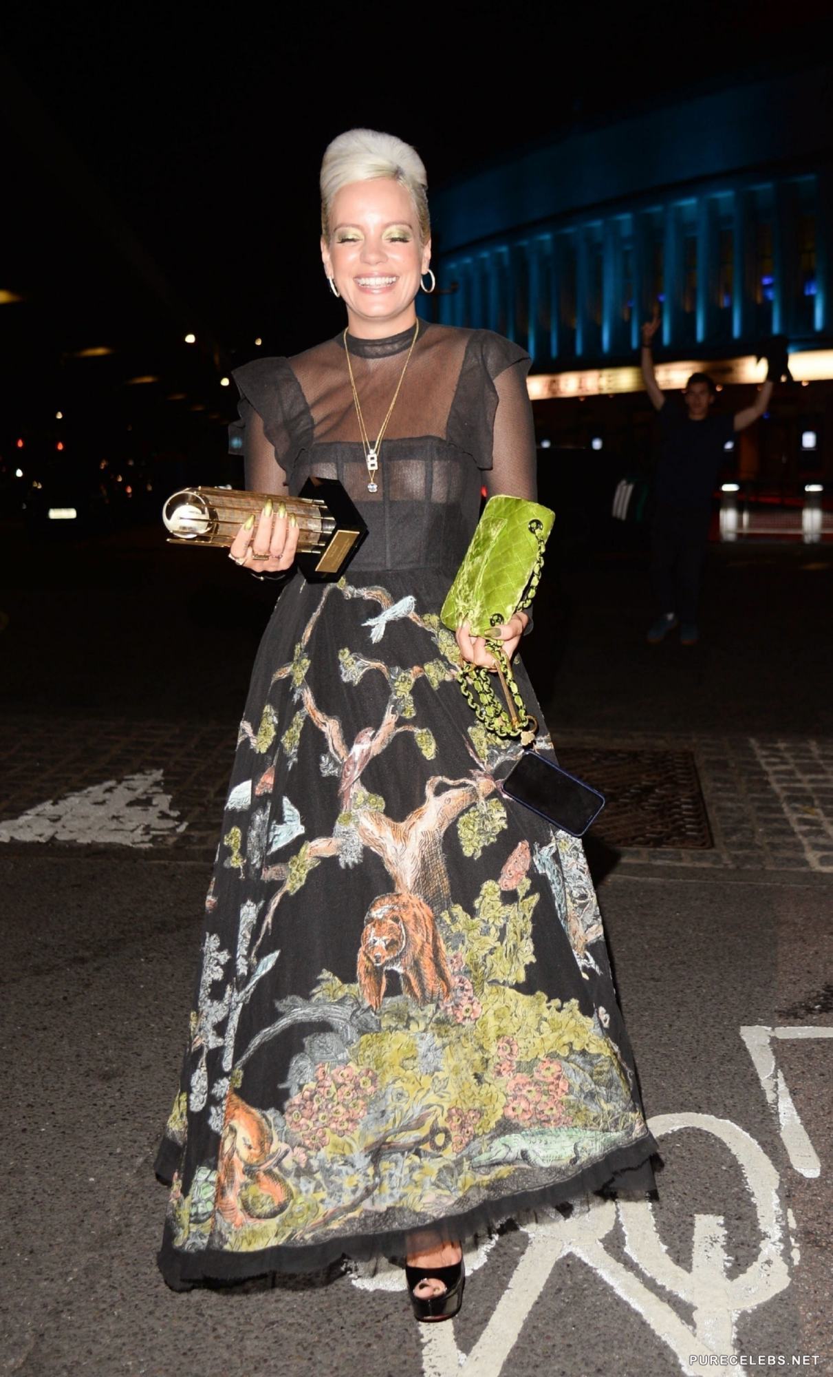 English singer and songwriter, Lily Allen is showing us her new trophy as well as her tits, in a black, see- through dress, along with a big, beautiful smile. We like the way she puts together color of her clothes with the pattern and most of all, we like the way her tits are displayed for us to admire, even though they are not big, they look just fine.