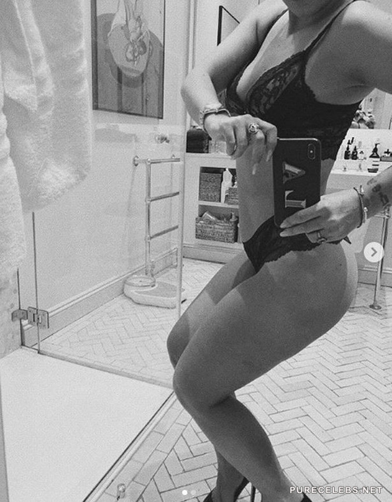 Lily Allen is taking photos in lace lingerie and she is sticking her tongue out as she is showing off her body. The sexy singer makes hot moves in front of the camera and she also bends over to show off her skinny little butt. She really needs to eat some meat to get some fat on those pretty legs and ass cheeks.